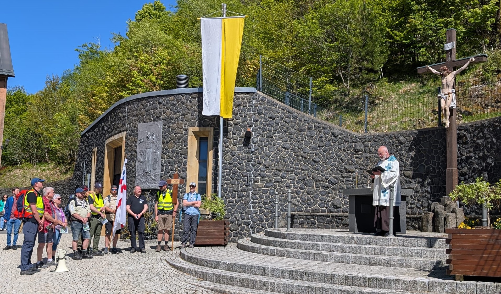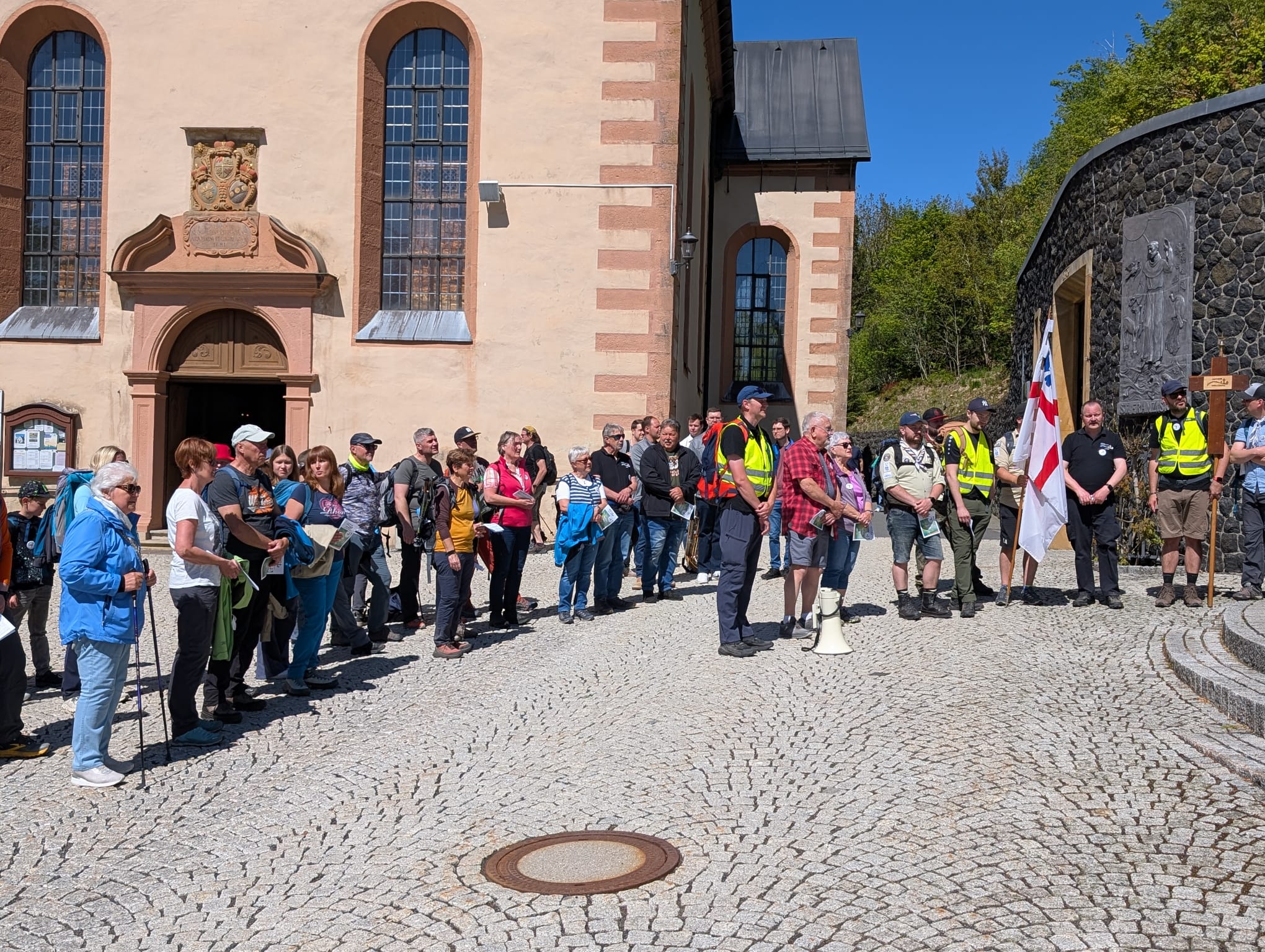 In Wegfurt und am Irenkreuz kamen weitere Fußwallfahrer hinzu. Unterwegs stärkte man sich mit Getränken und Speisen aus dem eigenen Rucksack. Ein Begleitfahrzeug war auf der gesamten Route zur Sicherheit dabei. Glücklicherweise verlief auch diese Wallfahrt - wie bisher alle - ohne Zwischenfall. Nach dem steilen Anstieg über das Neustädter Haus zum "Hohen Kreuz" auf dem Heiligen Berg der Franken und dann unter den Drei Kreuzen zu stehen, ist das Geschenk für die Pilger, es nicht nur konditionell geschafft zu haben, sondern auch Gebetsgemeinschaft erfahren zu haben.