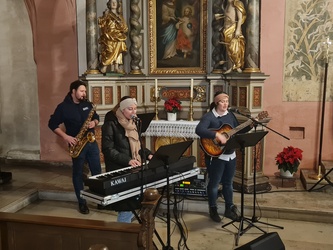 Die Kirchenband „denkmal“ eröffnete die kirchenmusikalischen Vorträge des Abends mit dem Lied „Groß ist unser Gott“. Die Band, so Daniel Griebel, sei vor 18 Jahren im Rahmen des Weltjugendtags gegründet worden. Die Begeisterung von damals habe sich bis heute erhalten. So spiele die Band in unterschiedlicher Besetzung zu den verschiedensten Anlässen wie Taufen, Trauungen oder Erstkommunion, auch über die Ortsgrenzen von Mellrichstadt hinaus. Mit ihrem zweiten Beitrag „Rückenwind“ holte die Band sicherlich viele Besucherinnen und Besucher ab und erntete dafür auch den entsprechenden Applaus.
