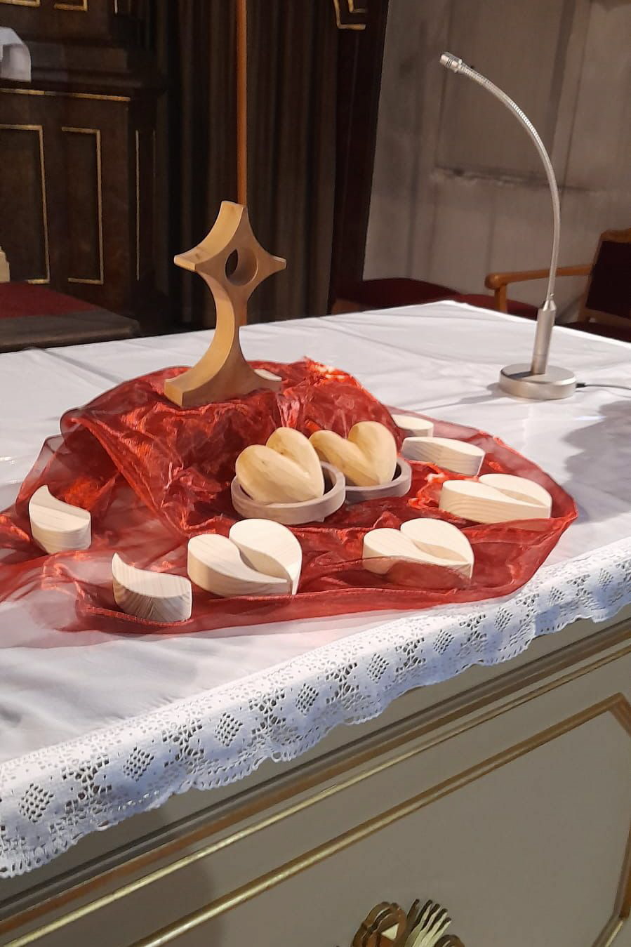 Der Kirchenraum war mit roten Rosen und Herzen geschmückt. Barbara Lochner begleitete den Gottesdienst an der Orgel. Unter dem Thema: „Vom Alltagswein zum Festtagswein“ fanden sich Paare aus dem gesamten pastoralen Raum ein. Die Feier begann mit einem Rückblick auf die Legende des heiligen Valentin, sein Leben und seinen Einsatz für die Liebenden seiner Zeit. Nach der Predigt konnten sich die Paare gegenseitig ihren Dank aussprechen, für die gemeinsamen Jahre. Die Möglichkeit zu einer persönlichen Segnung schloss sich an. In den Fürbitten brachten die Frauen des Arbeitskreises verschiedene Symbole zum Altar. Nach dem Segen waren alle eingeladen mit einem Glas Sekt anzustoßen und miteinander ins Gespräch zu kommen. Ein schöner Abend ging zu Ende - vielleicht auf ein Wiedersehen beim Segnungsgottesdienst - am Valentinstag 2026.