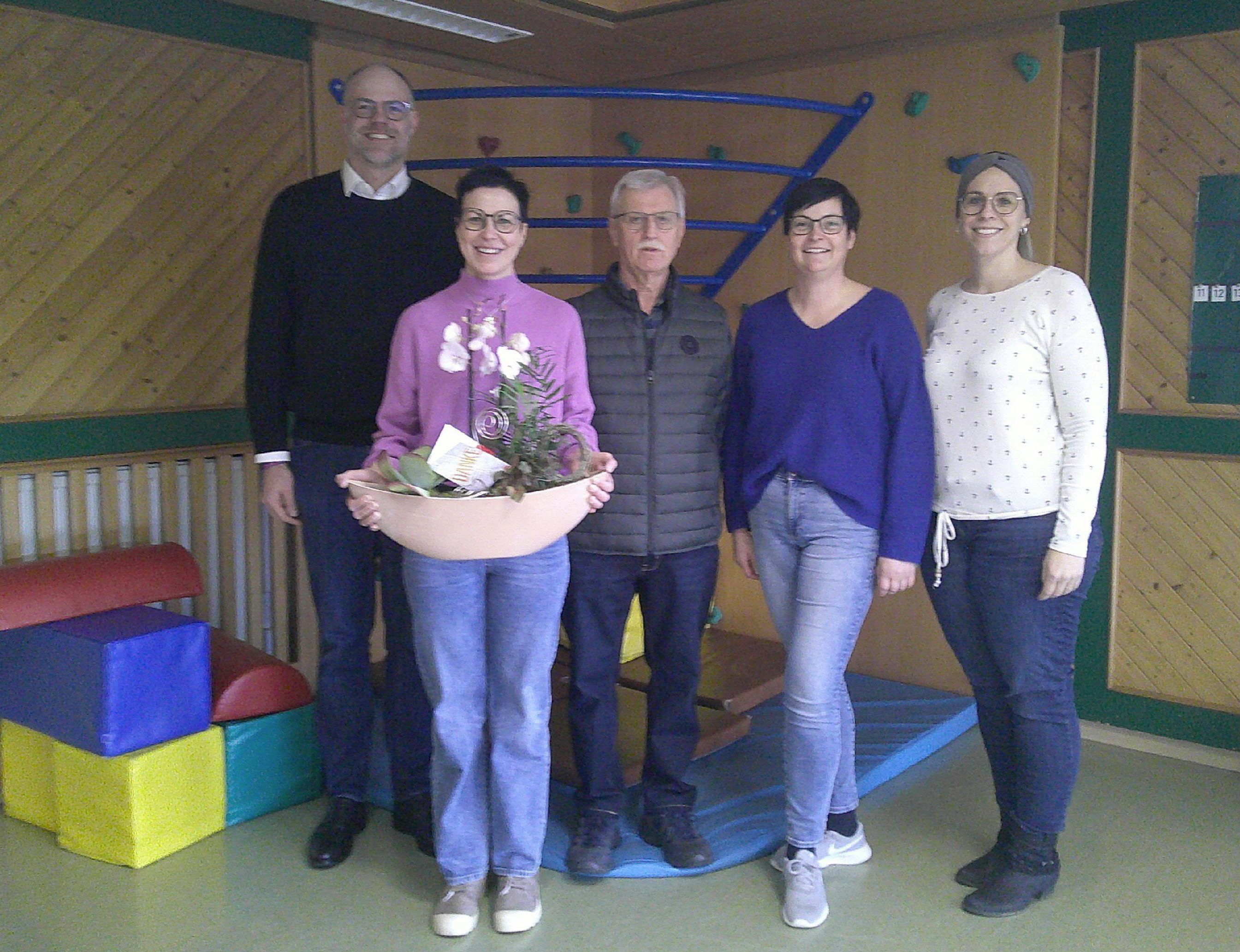 Sichtlich gerührt nahm Michaela Reinhart die Glückwünsche entgegen. Zu den Gratulanten gehörten auch der stellvertretende Kirchenverwaltungsvorstand Lorenz Sauer und Pfarrer Thomas Menzel. Auch die stellvertretende Elternbeiratsvorsitzende Daniela Ansorg und die stellvertretende Leitung, Sabine Bach, überbrachten ihre Glückwünsche.
