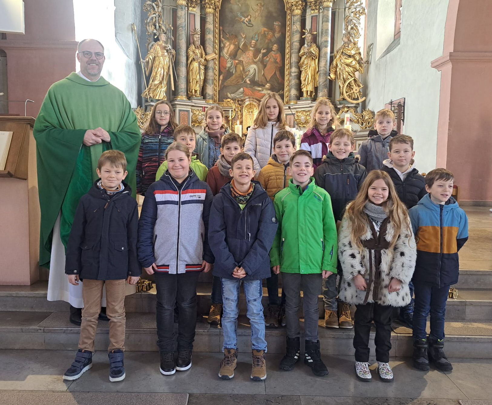 Am vergangenen Sonntag feierten die Kommunionkinder der Pfarreien Mellrichstadt und Eußenhausen ihren Tauferneuerungsgottesdienst. In der Predigt sprach Pfarrer Menzel – ausgehend vom Evangelium von der Hochzeit zu Kana – mit den Kindern über die leeren Krüge des Lebens, die Jesus wieder füllen möchte mit Freude und Leben. Den Anfang dieses Wunders habe Jesus schon gemacht mit der Taufe. Die Kinder dankten Gott für ihre Taufe und stellten sich der Gemeinde kurz vor. Im Anschluss an das Taufgedächtnis der Kinder wurden alle Gläubigen mit Weihwasser besprengt – zur Erinnerung an die eigene Taufe.