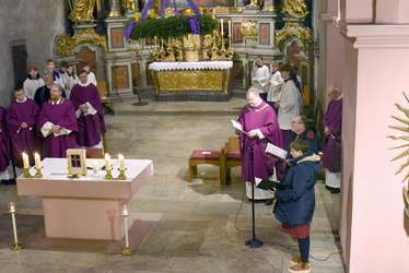 Als Vertreter der Kirchenverwaltungen fragte Thomas Späth, Kirchenpfleger in Fladungen, die beiden Teampfarrer nach ihrer Bereitschaft, ihre Mitarbeiterinnen und Mitarbeiter mit ihren Fähigkeiten und Charismen zu unterstützen, zu fördern und geschwisterlich zusammenzuwirken. Als Vertreterin der Gemeinsamen Pfarrgemeinderäte erfragte Renée Liening-Ewert, Mitglied im Gemeinsamen Pfarrgemeinderat der Pfarreiengemeinschaft Franziska Streitel Mellrichstadt, die Bereitschaft, die Dienste und Charismen der Gremien zu stärken, in den Gemeinden vielfältiges Leben zu ermöglichen und die Zusammenarbeit auf der Ebene des Pastoralen Raumes zu fördern. Auf beide Fragen antworteten die Teampfarrer mit einem kräftigen „Ich bin bereit“.