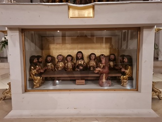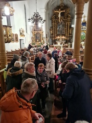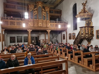 Dann lud Egon Bauß zu einem „Rundgang“ zu bemerkenswerten Stationen in der Nordheimer Kirche ein. Da ist unter anderem die Abendmahlgruppe, die sich ursprünglich in der Sebastianskapelle befand, zwischendurch verschwunden war und dann wieder aufgetaucht ist. Sie ist ein Blickfang, denn seit der Renovierung der Kirche im Jahr 2002 ist sie in den Altar integriert und leuchtet bei bestimmten Lichtverhältnissen in den Kirchenraum.