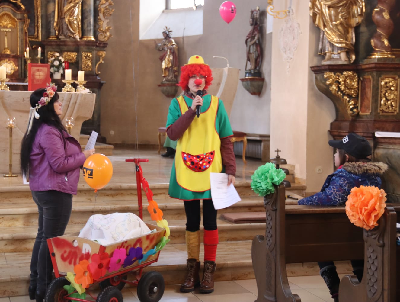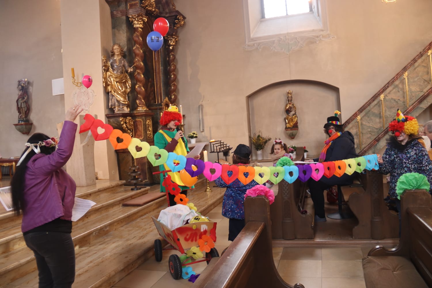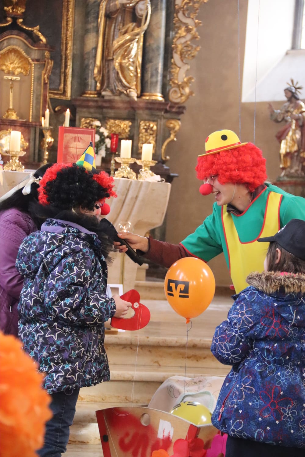 Gerne halfen die kleinen Fasenachter dem Clown, der sich in die Kirche verlaufen hatte, beim Leeren seines Bollerwagens. Dabei entdeckten sie Gemeinsamkeiten von Luftschlangen und Girlanden, die wie Menschen miteinander in Verbindung sind und das Leben bunt und lebendig machen. Manchmal sind sie aber auch so verletzlich wie Luftballons und im Umgang miteinander wenig feinfühlig. Auch Faschingshüte hatte der Clown mitgebracht, für die jeweils ein passender Kopf gefunden wurde. Nicht nur zu Fasching gehen manche Menschen maskiert durchs Leben, stellte das Team fest, oft zeigen sie aus Angst nicht ihr wahres Gesicht.