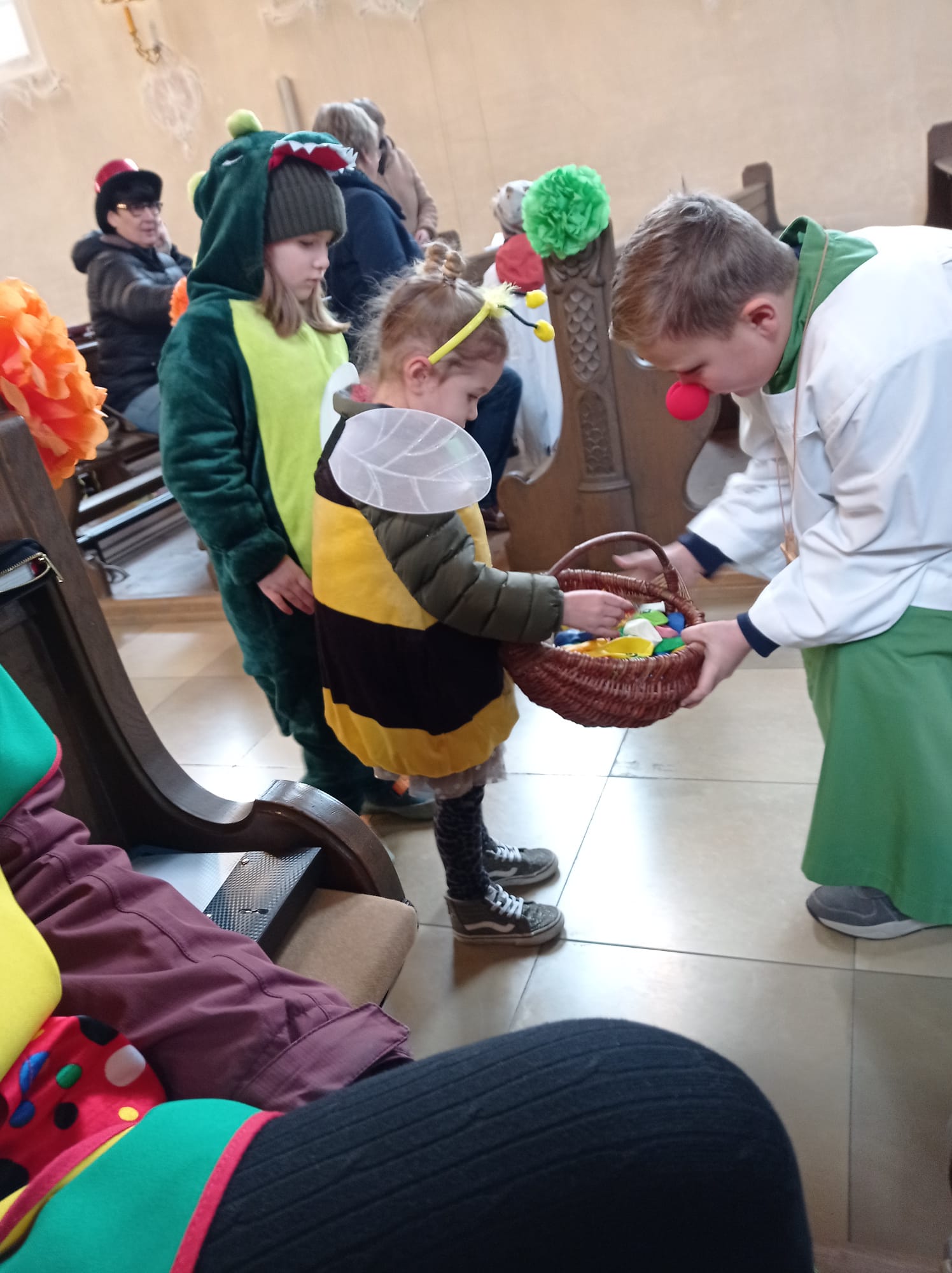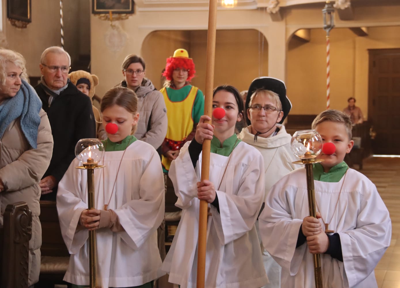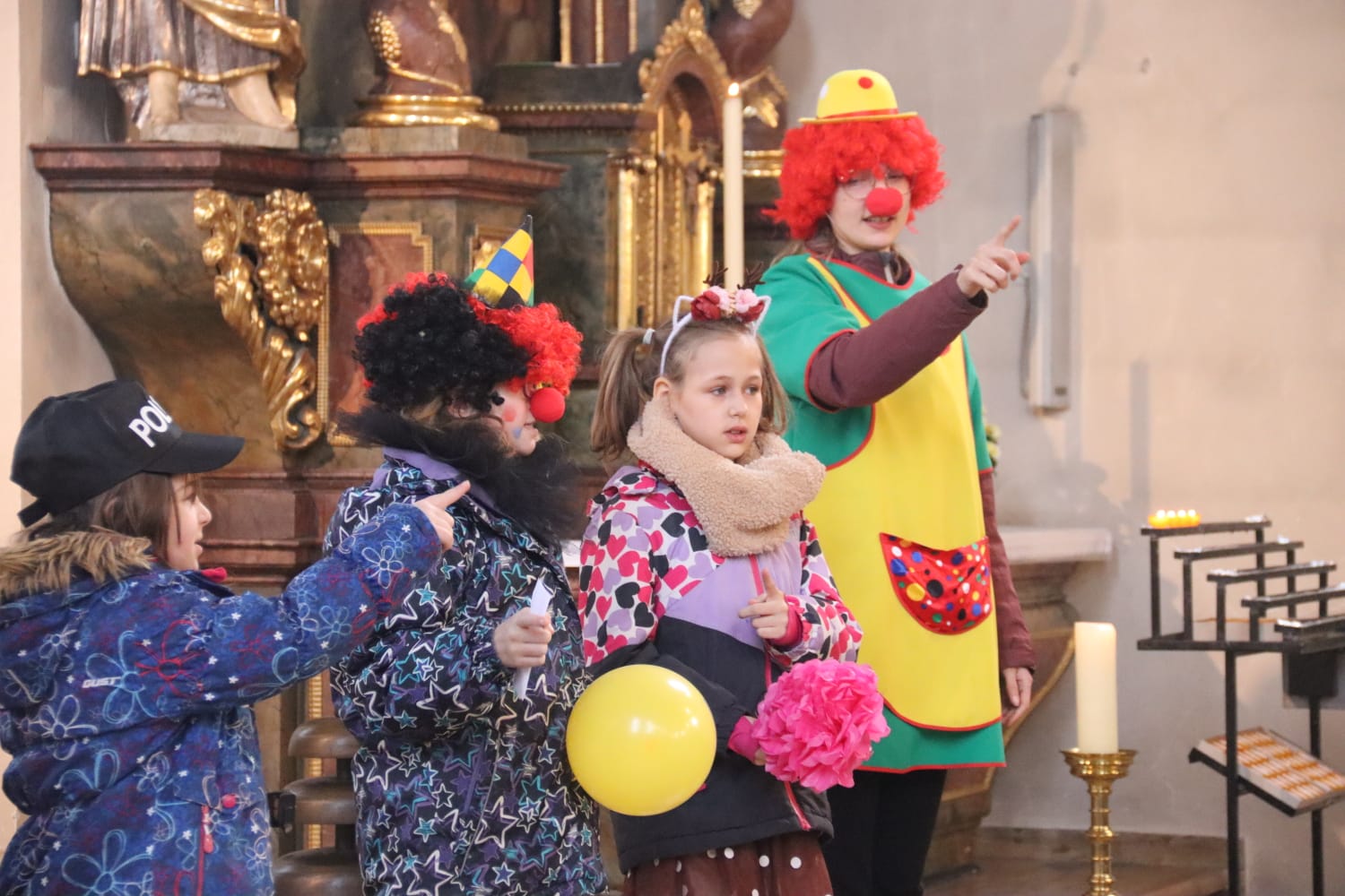 Gerne halfen die kleinen Fasenachter dem Clown, der sich in die Kirche verlaufen hatte, beim Leeren seines Bollerwagens. Dabei entdeckten sie Gemeinsamkeiten von Luftschlangen und Girlanden, die wie Menschen miteinander in Verbindung sind und das Leben bunt und lebendig machen. Manchmal sind sie aber auch so verletzlich wie Luftballons und im Umgang miteinander wenig feinfühlig. Auch Faschingshüte hatte der Clown mitgebracht, für die jeweils ein passender Kopf gefunden wurde. Nicht nur zu Fasching gehen manche Menschen maskiert durchs Leben, stellte das Team fest, oft zeigen sie aus Angst nicht ihr wahres Gesicht.