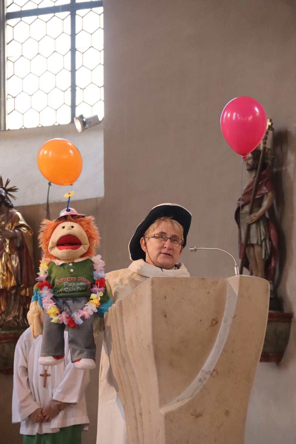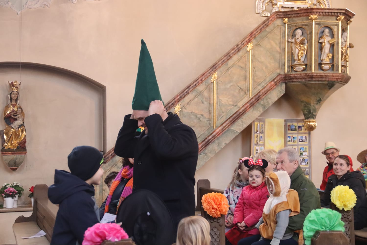 Ein kleiner Bär, ein Krokodil, Feen, Bienchen, Clowns, Cowboys und Prinzessinnen… saßen erwartungsvoll in den Bänken - Klein und Groß durften diesmal nämlich verkleidet zum Gottesdienst kommen - und wurden fröhlich von Michaela Köller mit der Handpuppe Nino begrüßt.