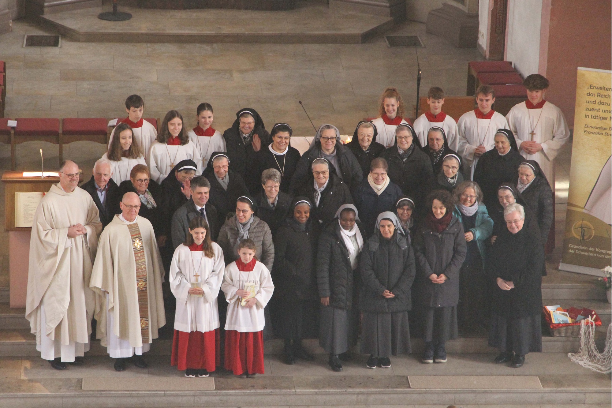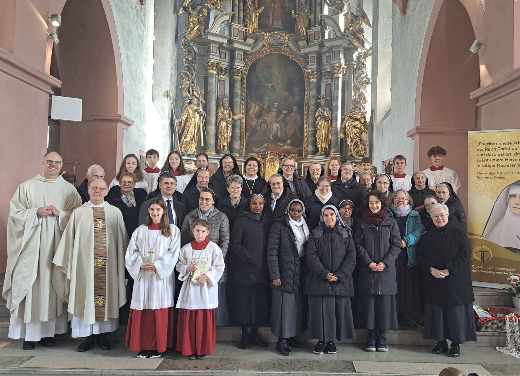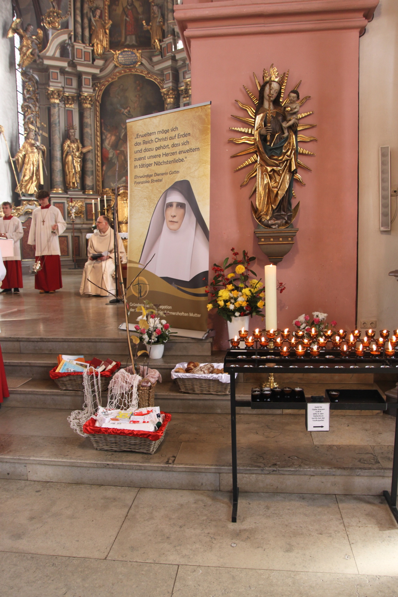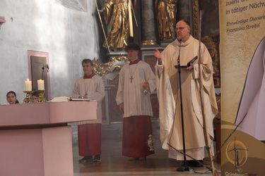In seiner Predigt schlug Weismantel den Bogen von Mutter Franziska Streitel über Franziskus bis hin zu Jesus Christus, den wir am Christkönigssonntag nicht als den herrschenden, sondern den dienenden König feiern. Seit seinem Tod am Kreuz würden ihm Menschen folgen, die sich wie er auf den untersten Platz begeben und hineinknien, um den Menschen in ihren Verwundungen zu begegnen und sie zu bergen in den Wunden Jesu, damit sie geheilt und verwandelt werden können. Wohl niemand habe dies mehr erfahren als Maria, die Mutter Jesu. Deshalb habe sie sich und die Kongregation auch in besonderer Weise der schmerzhaften Mutter geweiht. Den verwundeten Menschen ihrer Zeit wollte Mutter Franziska Streitel die Nähe, Liebe, Güte und Menschenfreundlichkeit Gottes haut- und herzensnah bringen, damit sie getröstet und zuversichtlich sein können. „Lassen wir uns an diesem Festtag von der großen Lichtgestalt Mutter Franziska Streitel beschenken und stärken, von ihrer Freude und Herzensgüte, die aber das Leid und den Schmerz nicht ausblendet, sondern einbezieht, damit wir mit ganzem, verwundeten, geheilten und getrösteten Herzen immer wieder neue Schritte wagen auf dem Weg, auf den uns der Herr gerufen hat.“ – so Paul Weismantel.