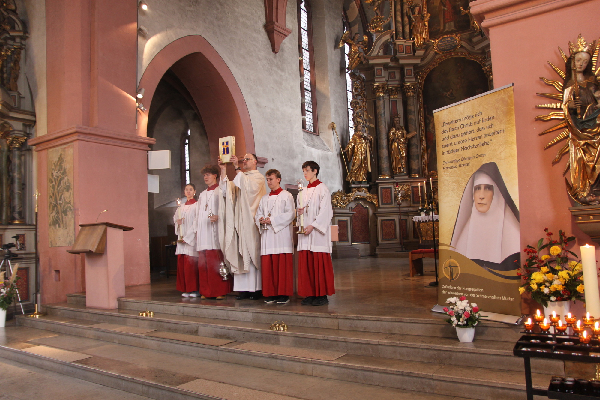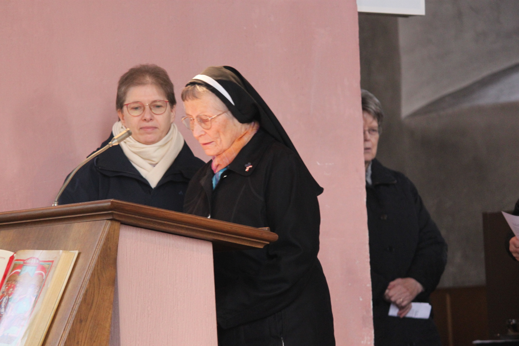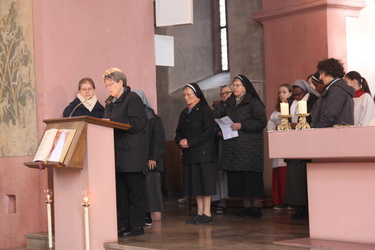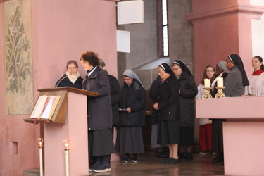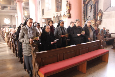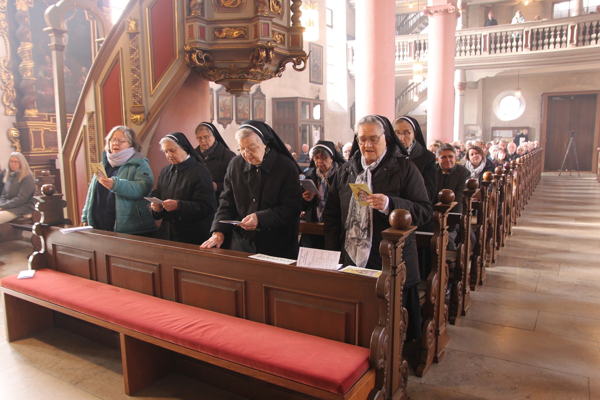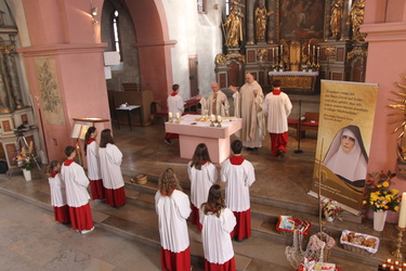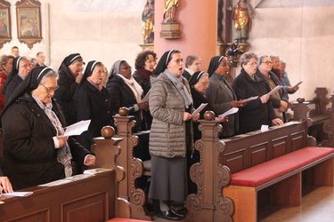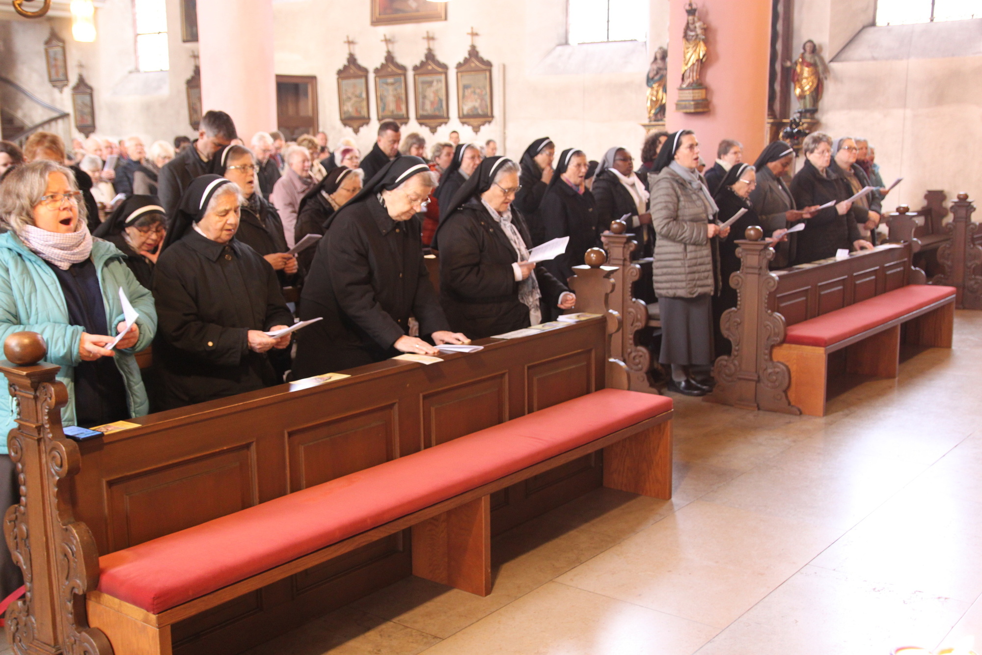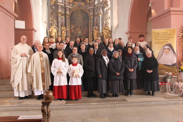 Im Anschluss an das Grußwort des Bürgermeisters lauschten die Gottesdienstbesucher aufmerksam den Worten der Generaloberin Sr. Samuela Maria Rigon. „Liebe Freunde aus Mellrichstadt, es ist uns eine Ehre, dieses Fest mit Ihnen feiern zu dürfen“ – so die Generaloberin. Vor 180 Jahren hätte Gott begonnen, hier in Mellrichstadt mit Mutter Franziska eine Geschichte zu weben. Die Geschichte einer Frau, die ihr ganzes Leben lang mit Liebe auf die Stimme Gottes gehört und zuerst sein Reich und seine Gerechtigkeit suchte. Sie rief dazu auf, sich an diesem Fest nicht nur an eine Geschichte zu erinnern, die der Vergangenheit angehöre, sondern sich von den Werten inspirieren zu lassen, die das Leben von Mutter Franziska bestimmt hätten. Sie sei ein Beispiel für Hoffnung, Gottvertrauen und barmherzige Liebe. „Möge das glühende Zeugnis von Mutter Franziska bald durch die Seligsprechung anerkannt werden“. Diese Bitte der Generaloberin mündete in das „Stabat mater“, sozusagen das „Ordenslied“ der Schwestern von der Schmerzhaften Mutter. Es wurde von den Schwestern gesungen. Die klaren Frauenstimmen erfüllten in ihrer Sanftheit den Kirchenraum und setzten damit einen weiteren geistlichen Akzent in diesem Gottesdienst.