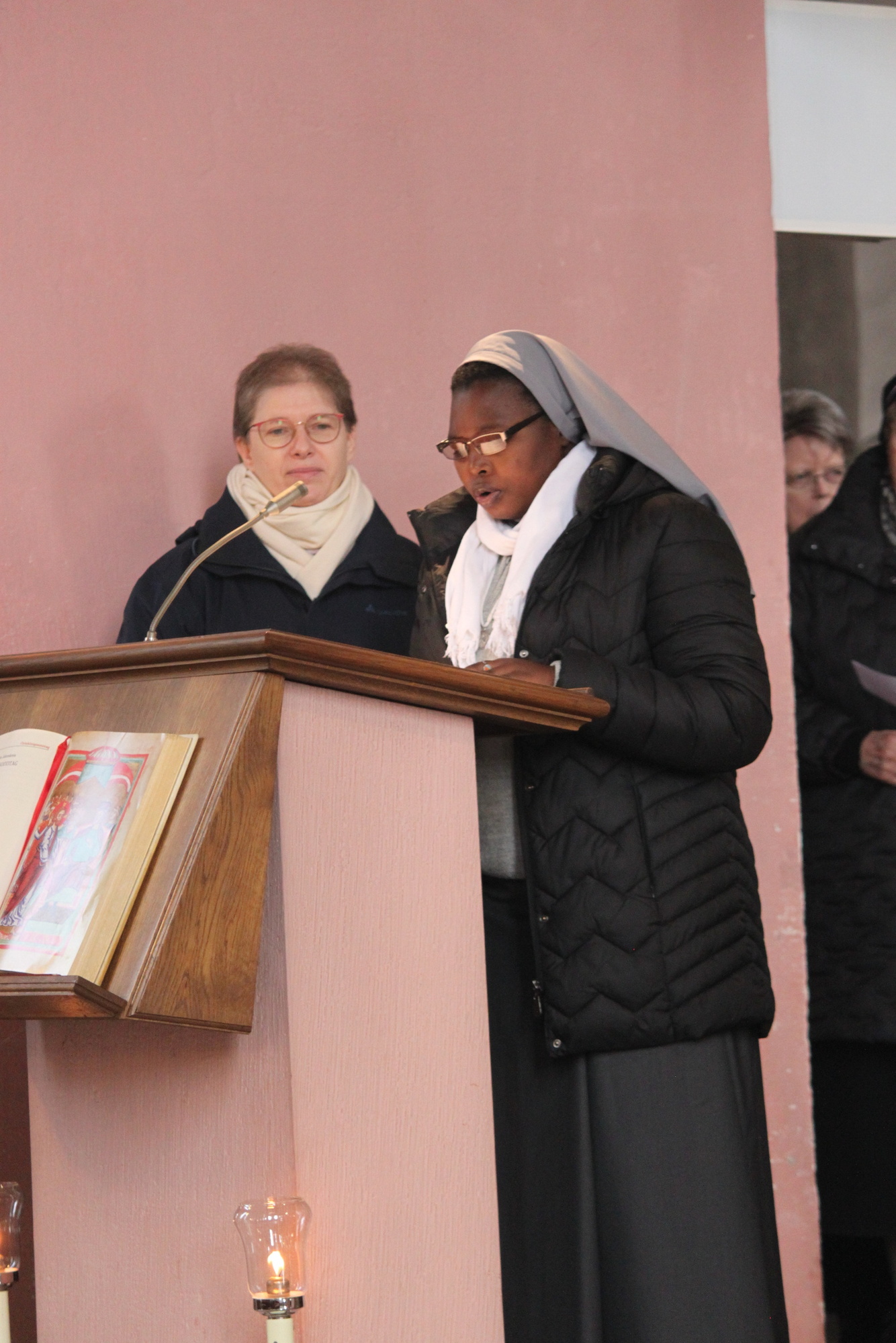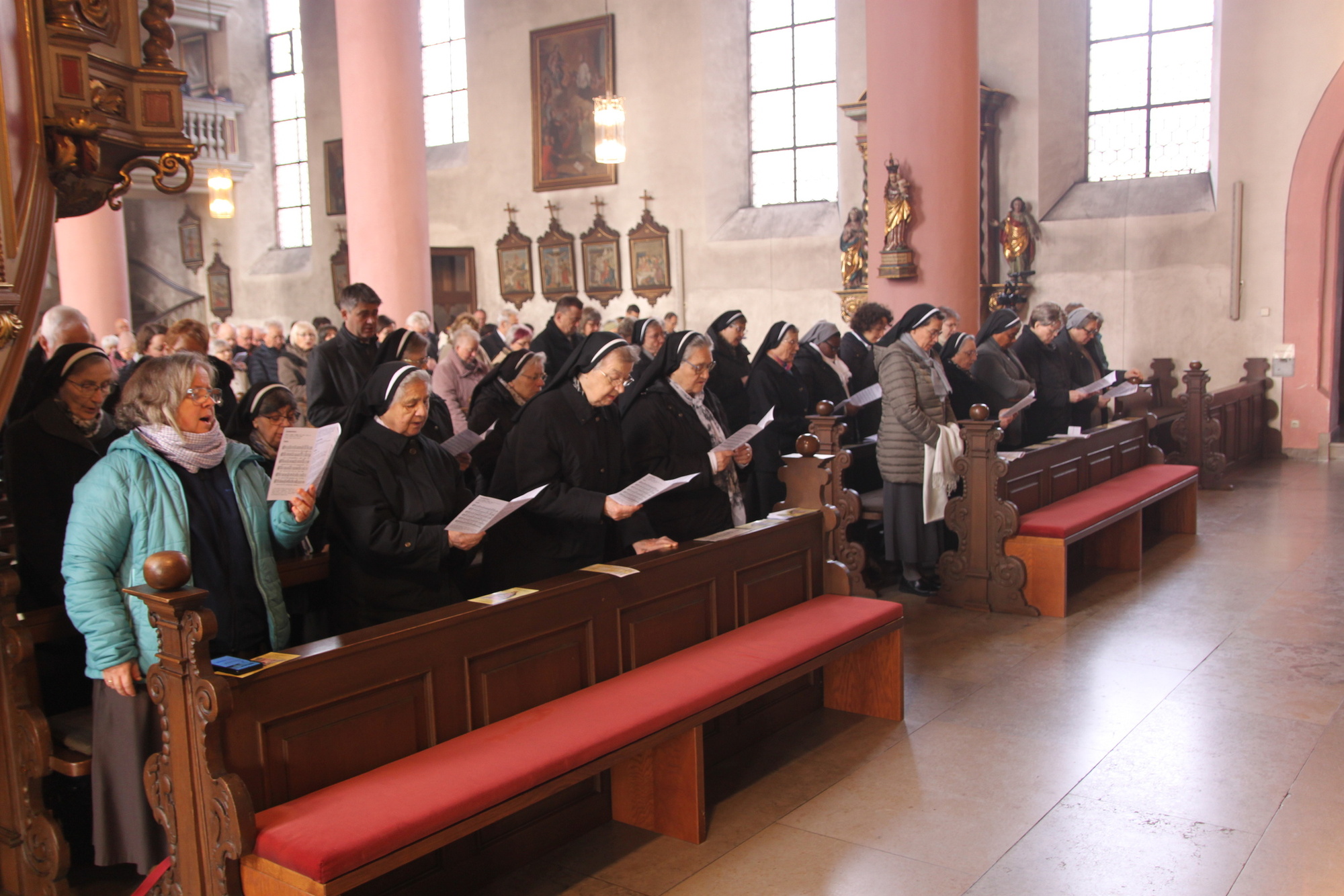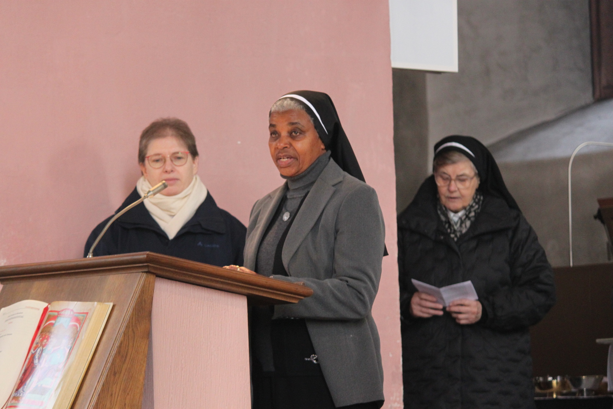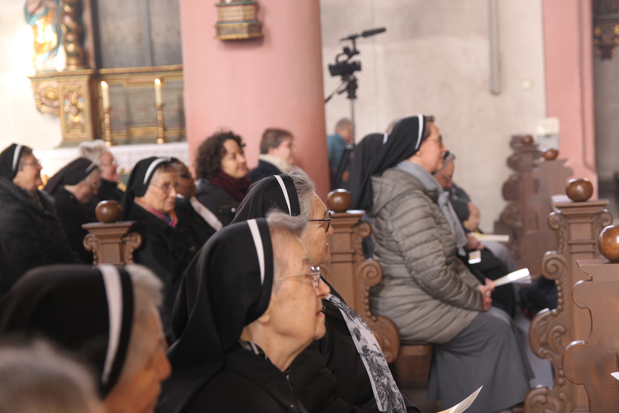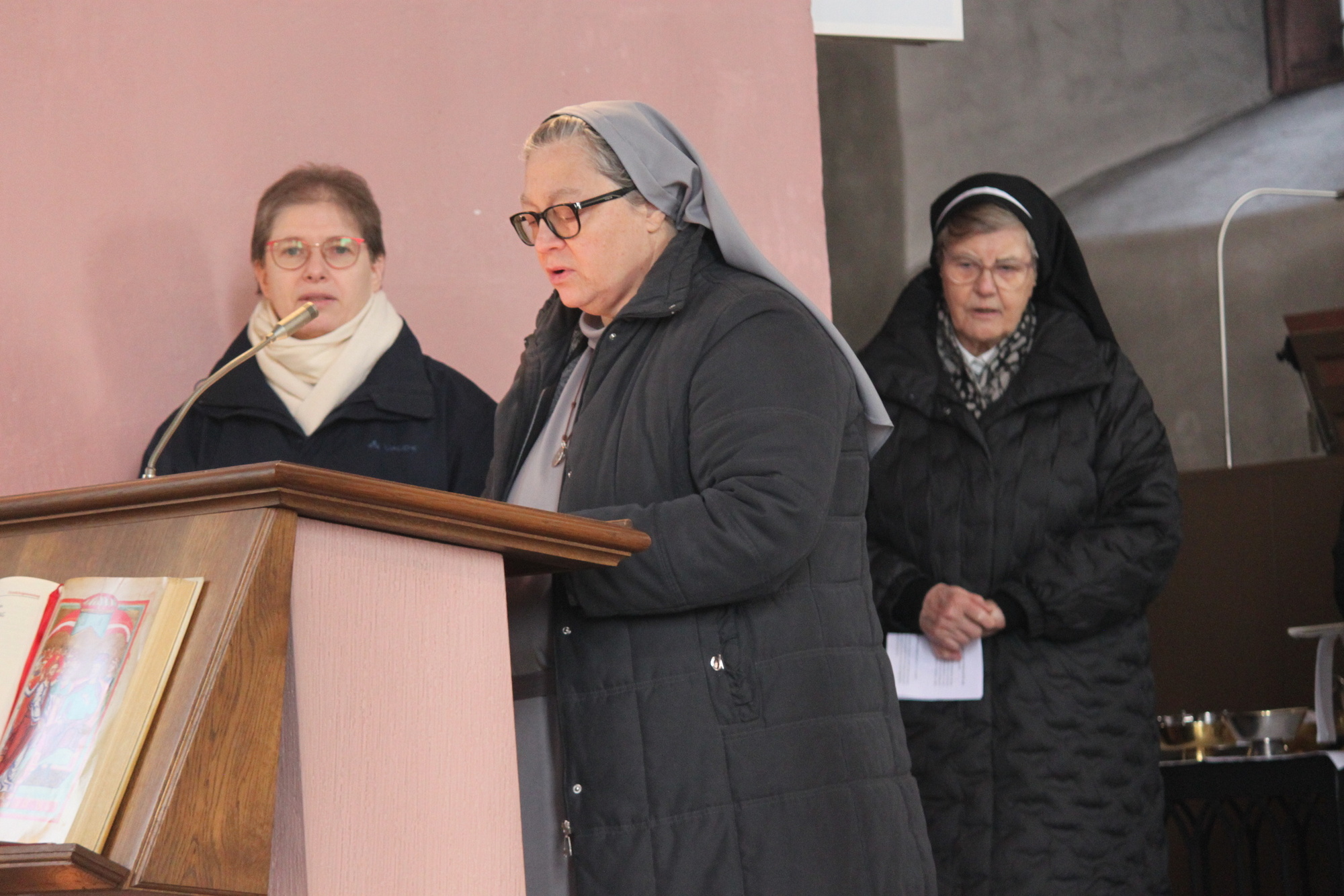 Im Anschluss an das Grußwort des Bürgermeisters lauschten die Gottesdienstbesucher aufmerksam den Worten der Generaloberin Sr. Samuela Maria Rigon. „Liebe Freunde aus Mellrichstadt, es ist uns eine Ehre, dieses Fest mit Ihnen feiern zu dürfen“ – so die Generaloberin. Vor 180 Jahren hätte Gott begonnen, hier in Mellrichstadt mit Mutter Franziska eine Geschichte zu weben. Die Geschichte einer Frau, die ihr ganzes Leben lang mit Liebe auf die Stimme Gottes gehört und zuerst sein Reich und seine Gerechtigkeit suchte. Sie rief dazu auf, sich an diesem Fest nicht nur an eine Geschichte zu erinnern, die der Vergangenheit angehöre, sondern sich von den Werten inspirieren zu lassen, die das Leben von Mutter Franziska bestimmt hätten. Sie sei ein Beispiel für Hoffnung, Gottvertrauen und barmherzige Liebe. „Möge das glühende Zeugnis von Mutter Franziska bald durch die Seligsprechung anerkannt werden“. Diese Bitte der Generaloberin mündete in das „Stabat mater“, sozusagen das „Ordenslied“ der Schwestern von der Schmerzhaften Mutter. Es wurde von den Schwestern gesungen. Die klaren Frauenstimmen erfüllten in ihrer Sanftheit den Kirchenraum und setzten damit einen weiteren geistlichen Akzent in diesem Gottesdienst.