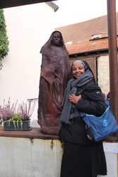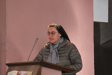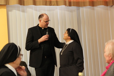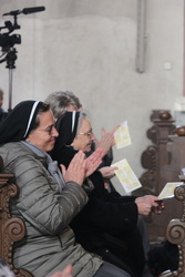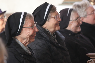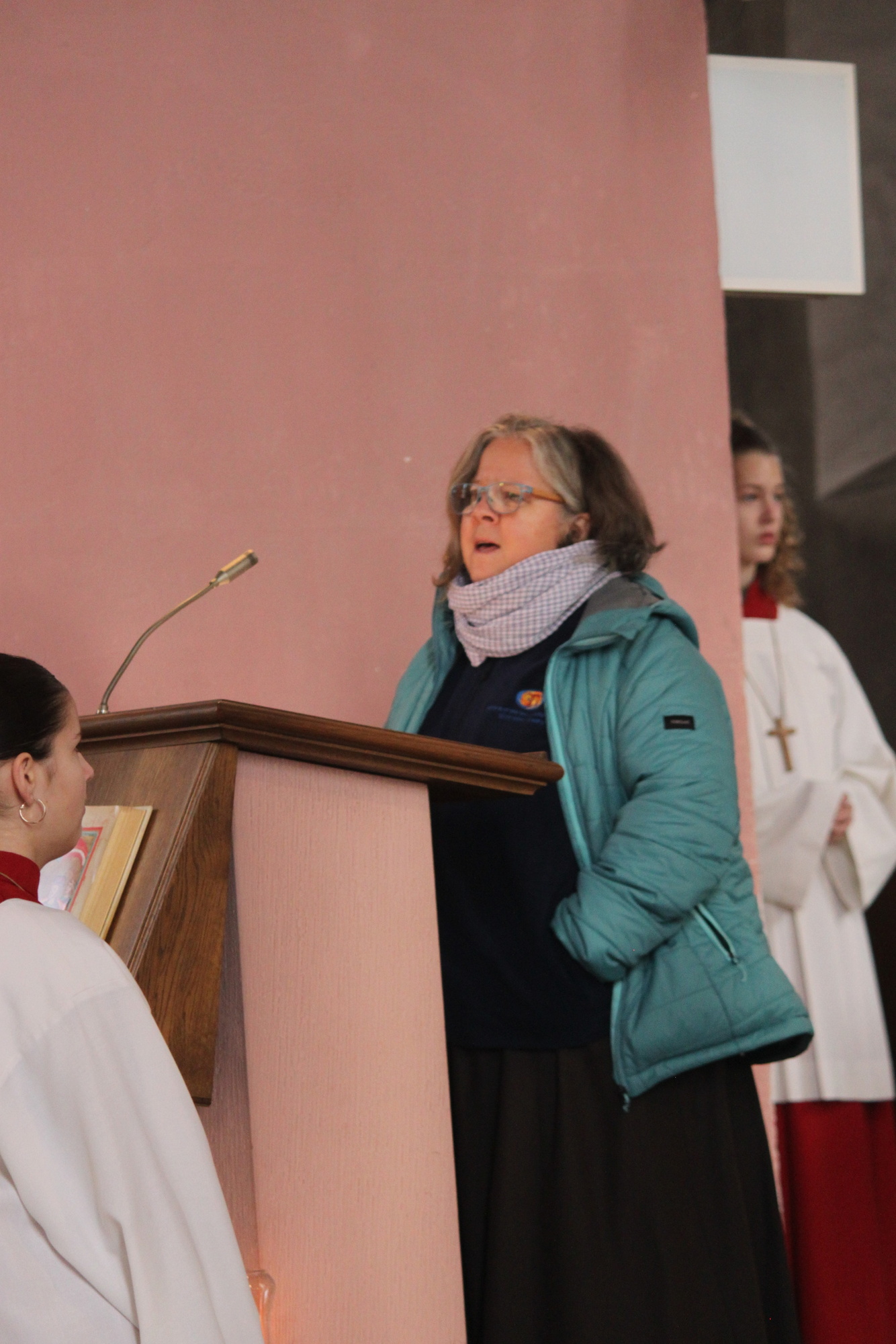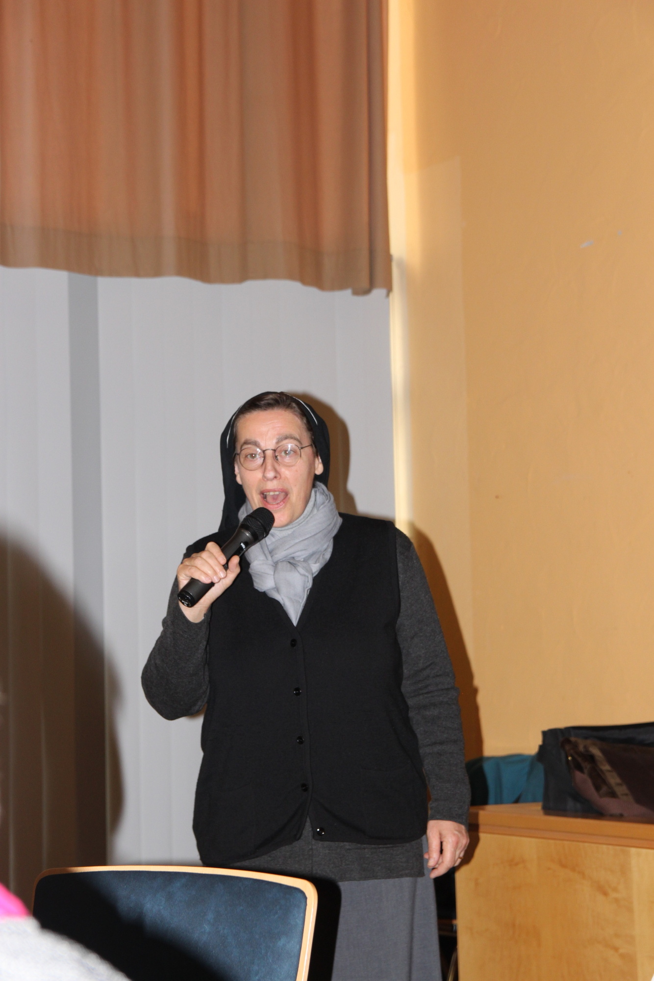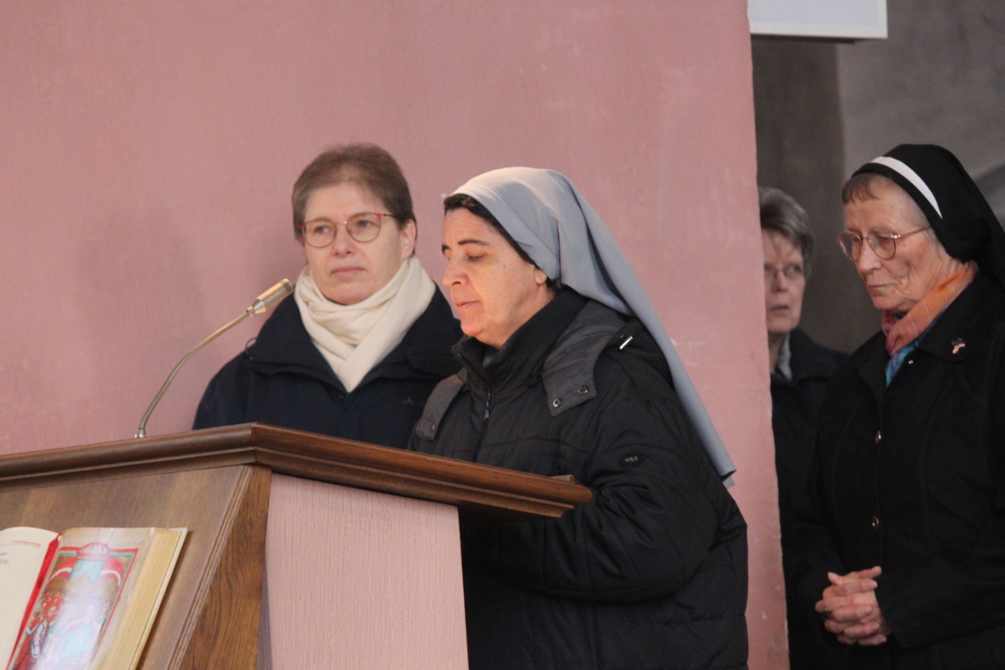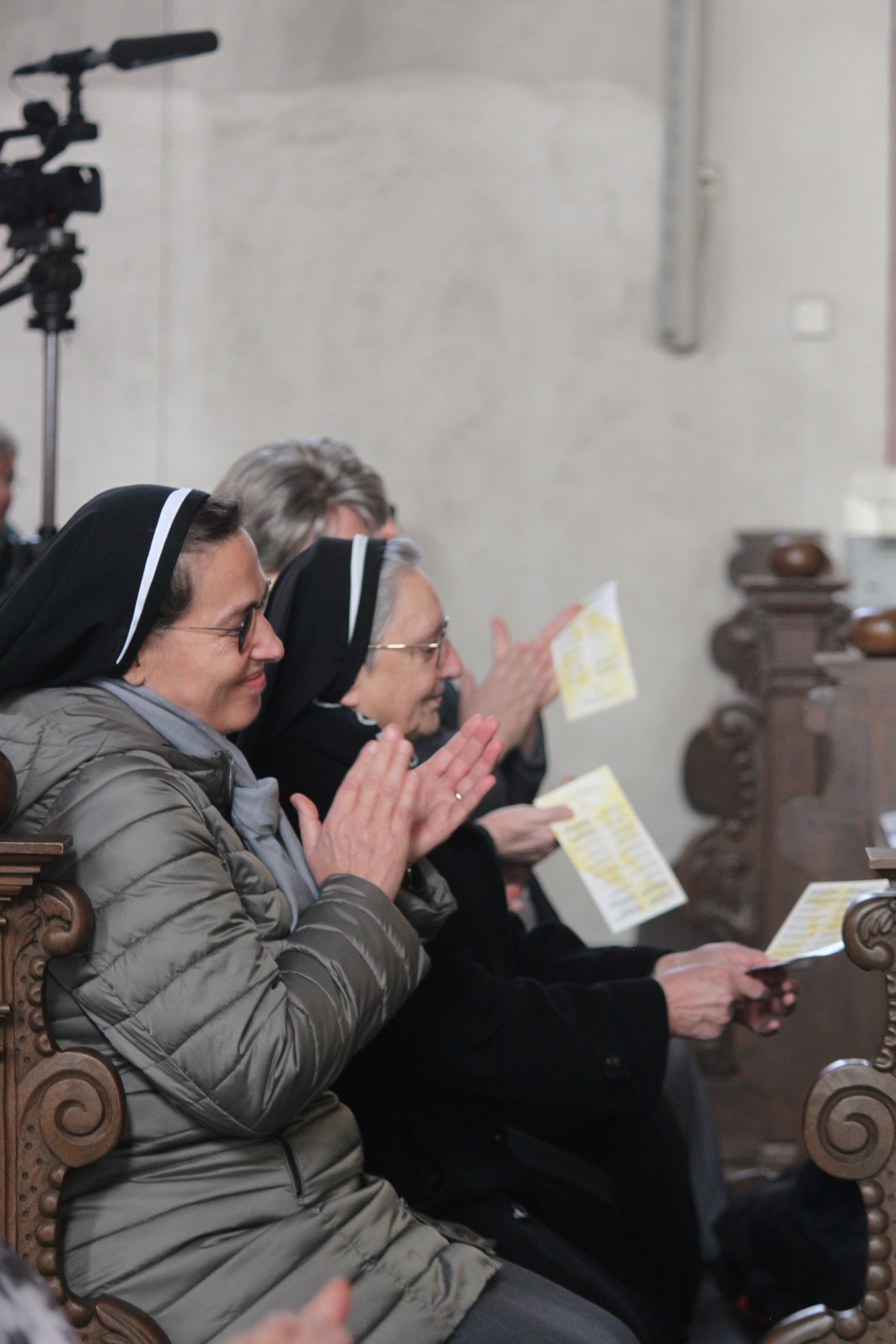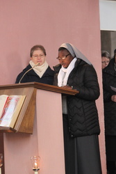 Im Anschluss an das Grußwort des Bürgermeisters lauschten die Gottesdienstbesucher aufmerksam den Worten der Generaloberin Sr. Samuela Maria Rigon. „Liebe Freunde aus Mellrichstadt, es ist uns eine Ehre, dieses Fest mit Ihnen feiern zu dürfen“ – so die Generaloberin. Vor 180 Jahren hätte Gott begonnen, hier in Mellrichstadt mit Mutter Franziska eine Geschichte zu weben. Die Geschichte einer Frau, die ihr ganzes Leben lang mit Liebe auf die Stimme Gottes gehört und zuerst sein Reich und seine Gerechtigkeit suchte. Sie rief dazu auf, sich an diesem Fest nicht nur an eine Geschichte zu erinnern, die der Vergangenheit angehöre, sondern sich von den Werten inspirieren zu lassen, die das Leben von Mutter Franziska bestimmt hätten. Sie sei ein Beispiel für Hoffnung, Gottvertrauen und barmherzige Liebe. „Möge das glühende Zeugnis von Mutter Franziska bald durch die Seligsprechung anerkannt werden“. Diese Bitte der Generaloberin mündete in das „Stabat mater“, sozusagen das „Ordenslied“ der Schwestern von der Schmerzhaften Mutter. Es wurde von den Schwestern gesungen. Die klaren Frauenstimmen erfüllten in ihrer Sanftheit den Kirchenraum und setzten damit einen weiteren geistlichen Akzent in diesem Gottesdienst.
