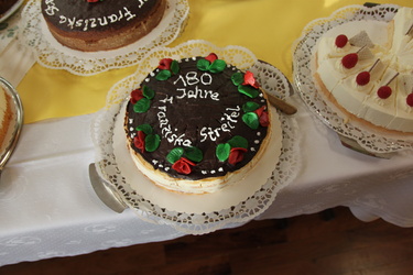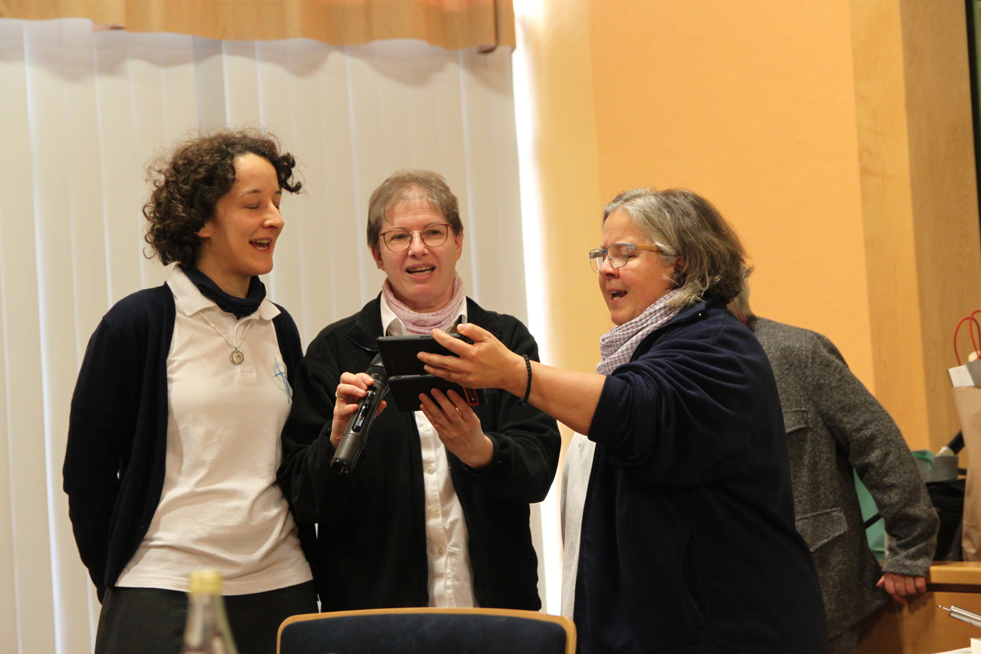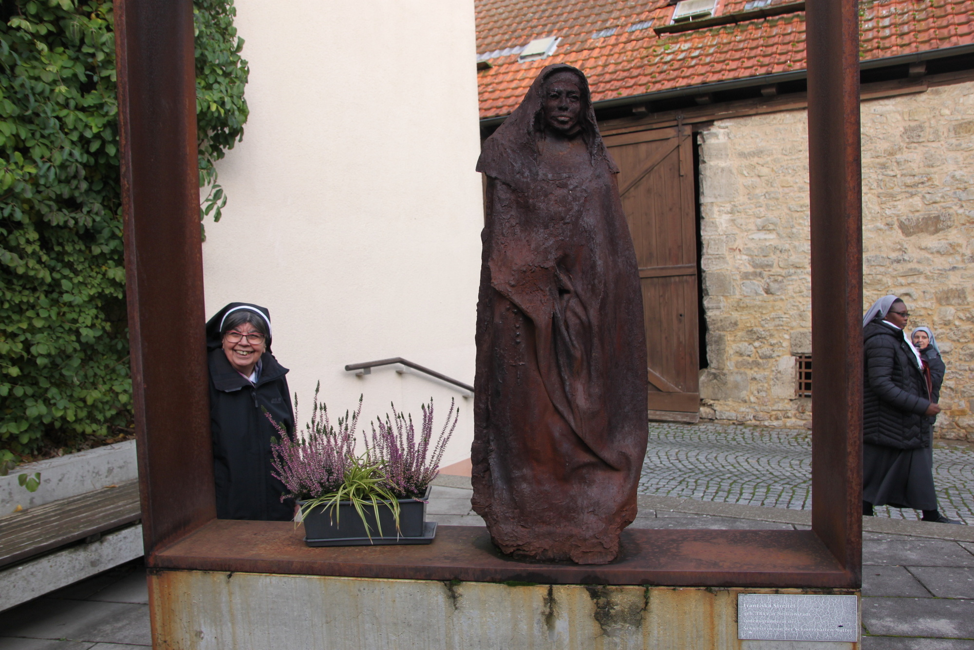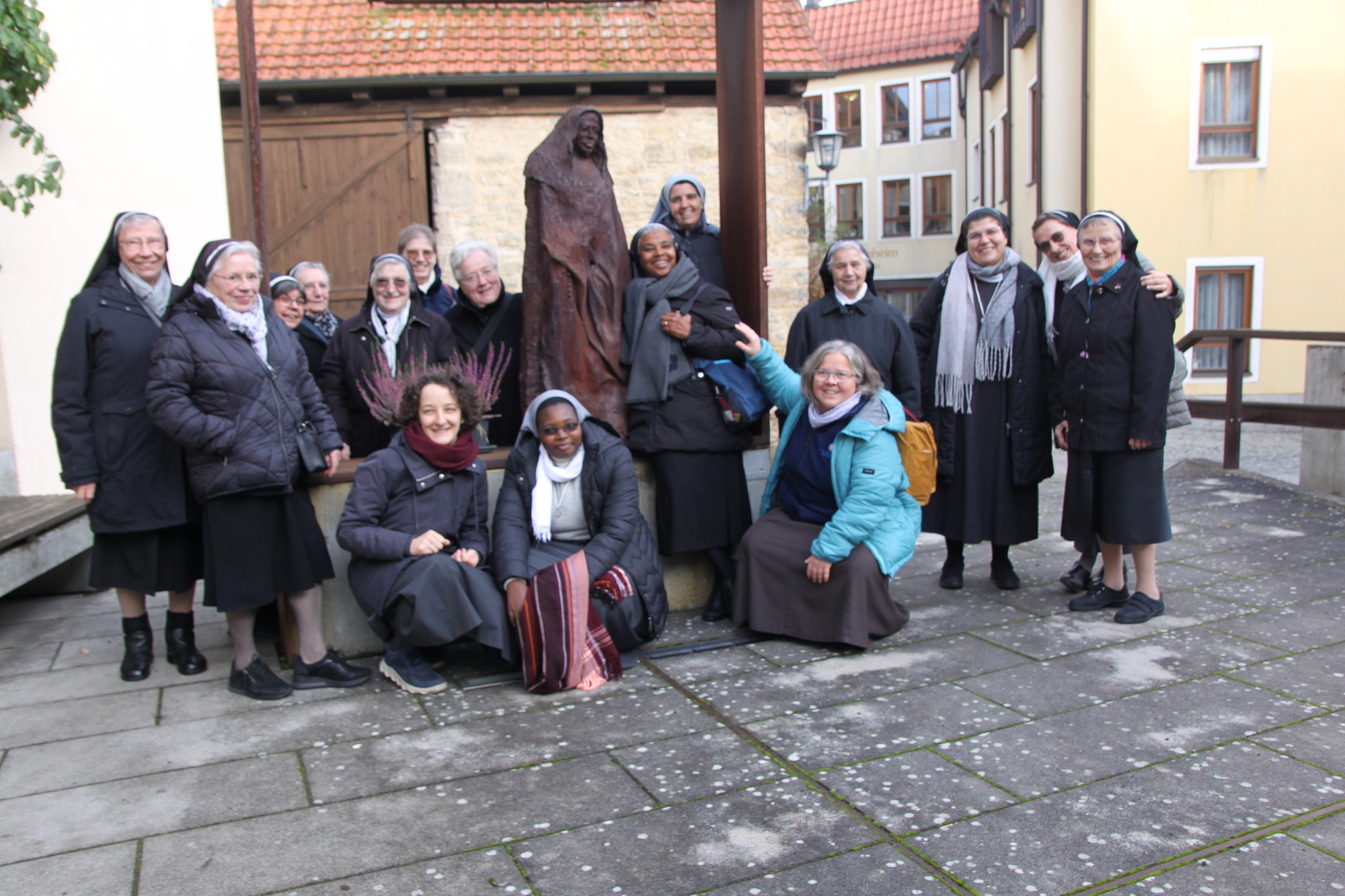 Drei Ordensschwestern aus Wien stimmten mit einem gesungenen Franziska-Streitel-Lied auf einen kleinen inhaltlichen Teil des Nachmittags ein. Marianne Fritz stelle in Wort und Bild den Rundgang „Von Amalia zu Franziska“ vor, der im Jahr 2017 entstand und vom Bayerischen Staatsministerium und dem Europäischen Landwirtschaftsfond für die Entwicklung des ländlichen Raums (ELER) gefördert wurde. Der Weg beginnt am Geburtshaus der Ordensgründerin am Roßmarkt und führt zu verschiedenen Stationen der Altstadt, die mit dem Leben von Franziska Streitel in Verbindung stehen. Der Weg endet am ehemaligen Schwesternhaus und an der modernen Skulptur von Franziska Streitel am Roßmarkt. Im Anschluss daran ergriff die Generaloberin nochmal das Wort und dankte für die Gastfreundschaft, die Gemeinschaft und das hervorragende Kuchenbuffet. Vor allem für die Schwestern Meinrada und Eberharda dürfte dieser Nachmittag sehr kurzweilig gewesen sein, wollten doch möglichst viele ihrer Wiedersehensfreude Ausdruck verleihen und zumindest kurz die Gelegenheit nutzen, mit den liebenswerten Schwestern eine Plausch zu halten.