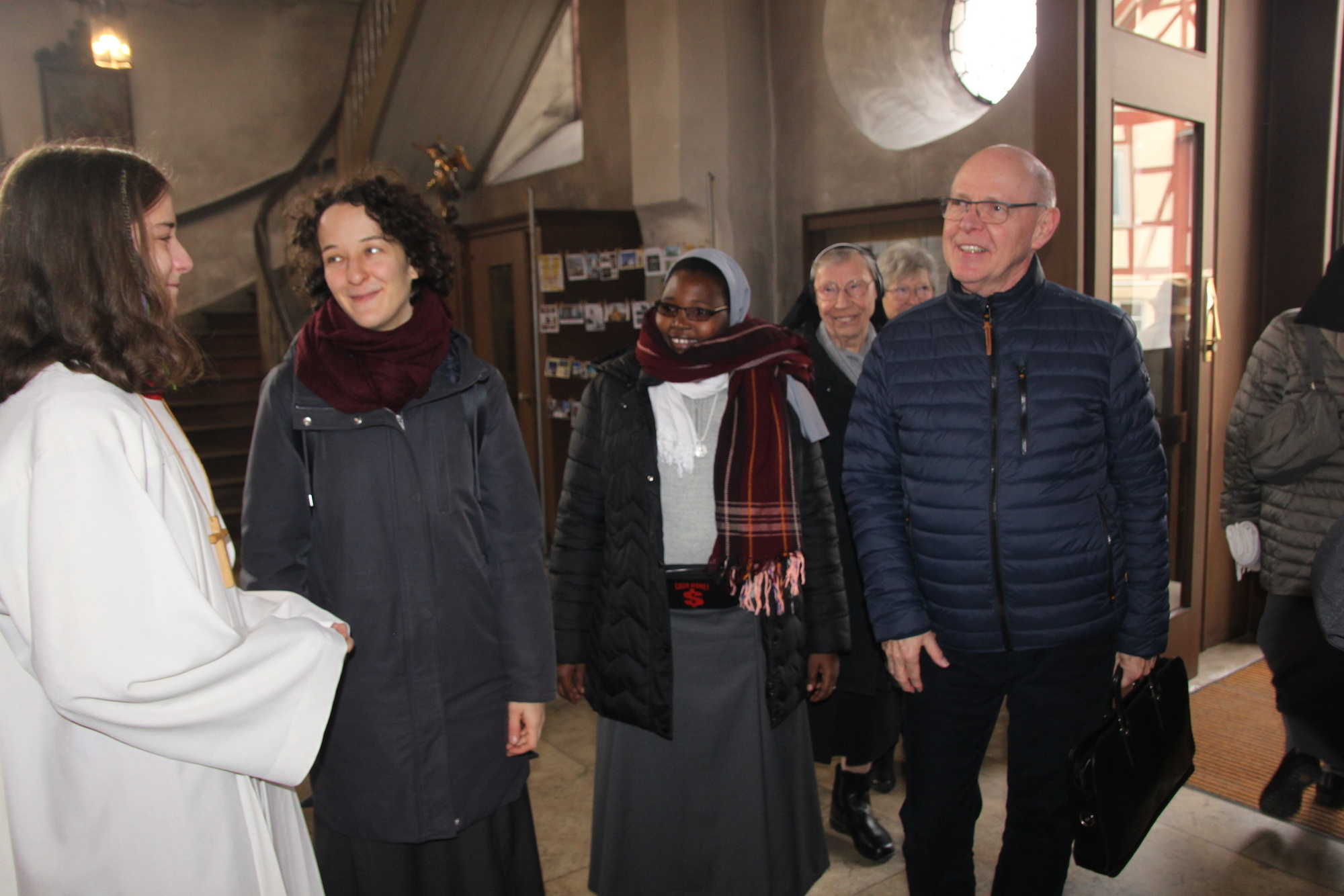 Der erste spontane Applaus brandete auf, als Bürgermeister Michael Kraus am Ende des Gottesdienstes die Schwestern mit einem „Herzlich Willkommen“ in verschiedenen Sprachen begrüßte. Echte und herzliche Freude stand allen ins Gesicht geschrieben. „Franziska Streitel trug den Namen Mellrichstadt in die Welt hinaus. Heute ist die Welt bei uns zu Gast“ – so der Bürgermeister. Die Stadt sei stolz auf die Ordensgründerin und dankbar, dass Schwestern ihres Ordens bis ins Jahr 2021 in der Stadt gewirkt hätten. Er freue sich auch, dass dieser Gottesdienst über YouTube von der Kanzel übertragen werde, um so allen Ordensmitgliedern der Kongregation weltweit die Teilnahme an diesem feierlichen Gottesdienst zu ermöglichen. Er wünschte den Gästen viele gute Begegnungen und Gespräche und dass dieser Tag allen in guter Erinnerung bleibe.
