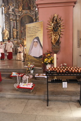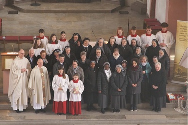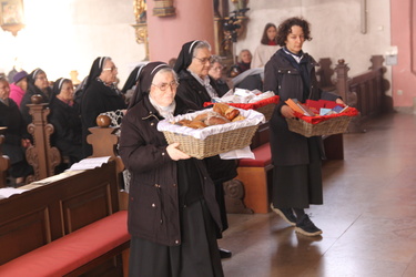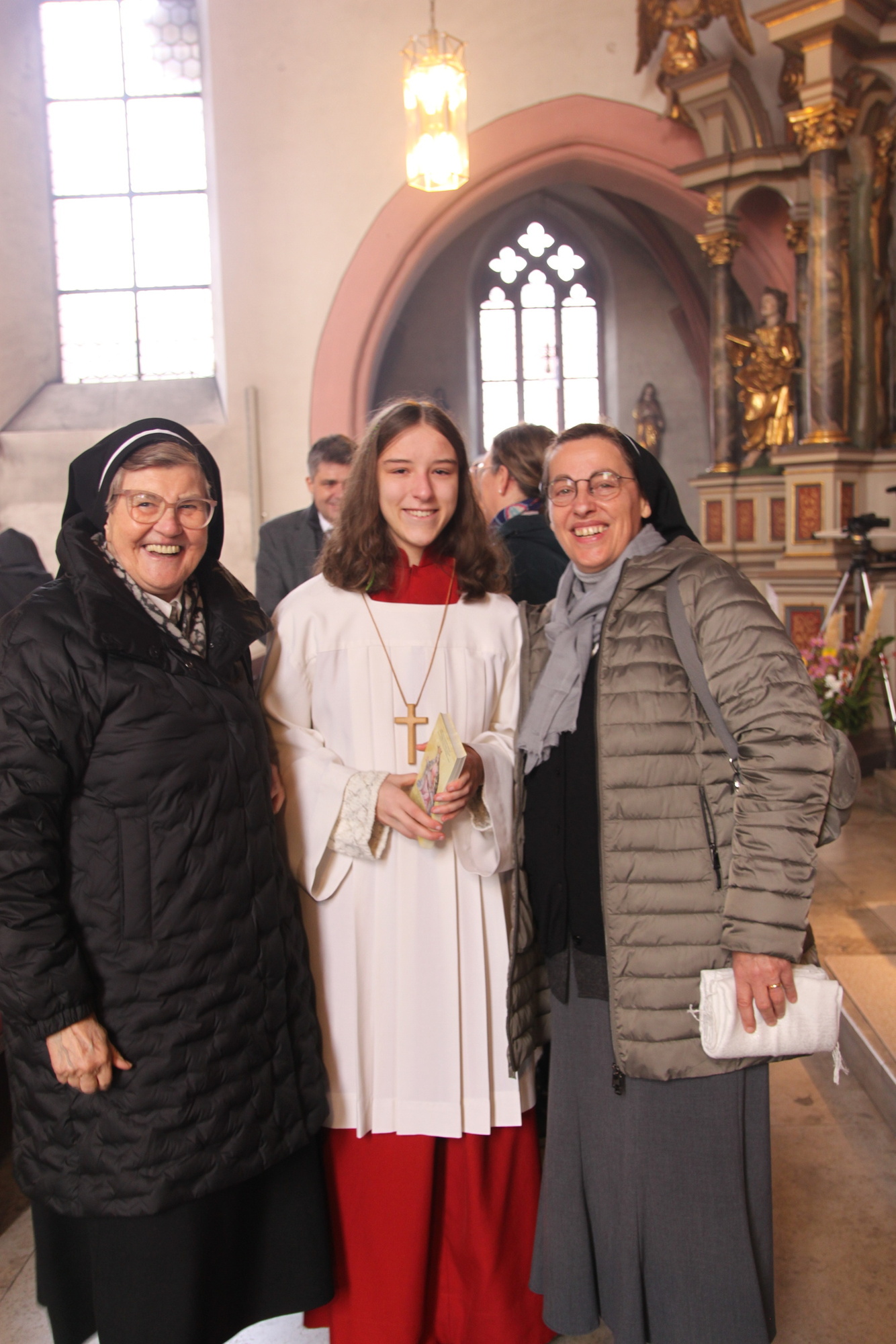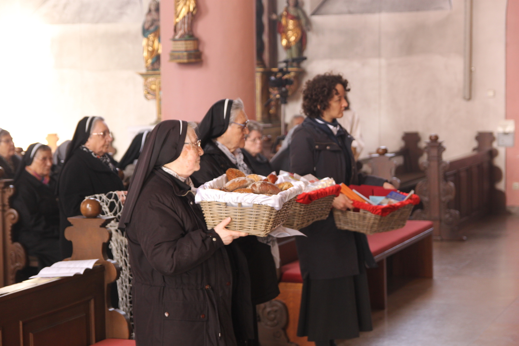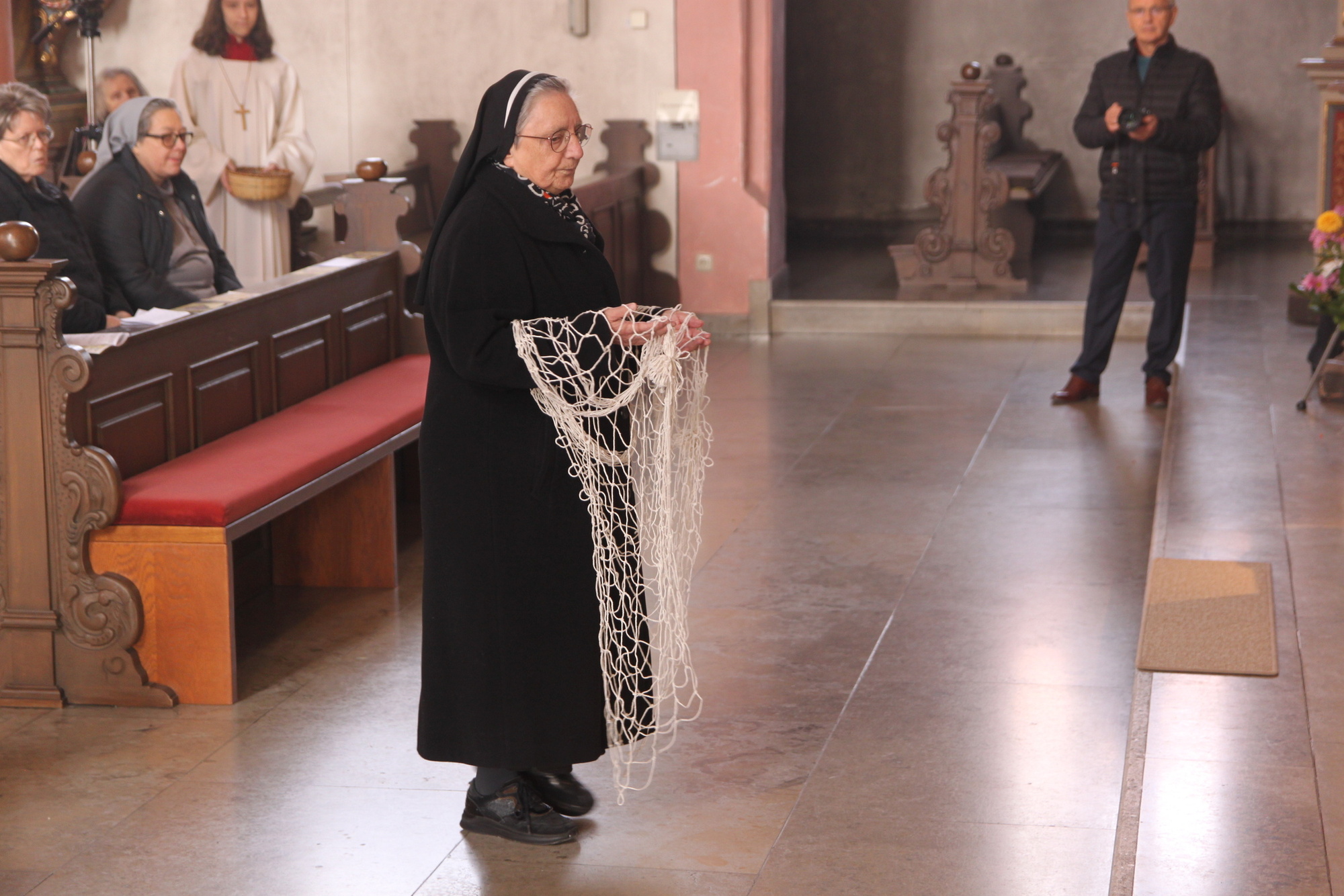 Eine ganz eigene Atmosphäre entstand während des Fürbittgebets. Ein Hauch von Internationalität und weltumspannender Kirche lag in der Luft, als verschiedene Schwestern die Fürbitten mehrsprachig vortrugen in den Sprachen der Länder, in denen der Orden präsent ist: deutsch, italienisch, englisch, portugiesisch und suaheli. Auch eine Gabenprozession wurde von den Schwestern gestaltet. Als Erstes wurde die Pflanze eines Apfelbaums zum Altar gebracht. Er steht für die Gemeinschaft der Schwestern von der schmerzhaften Mutter, die ihre Wurzeln in Mellrichstadt hat und Frucht bringt überall da, wo sie den Menschen dienen kann. Dann folgten drei Körbe als Symbol für die apostolische Tätigkeit des Ordens: ein Korb mit Verbandsmaterial als Symbol für den Dienst des Heils. Ein Korb mit Brot als Symbol für die tägliche Nahrung für die Armen. Und ein Korb mit Büchern als Symbol für den Dienst der Erziehung und Bildung. Als Drittes wurde ein Netz niedergelegt. Dankbarkeit und Freundschaft sollen die bleibenden Verknüpfungen sein, die alle Niederlassungen der Schwestern von der Schmerzhaften Mutter zum Geburtsort ihrer Gründerin pflegen. Spätestens jetzt wurde die geistliche und menschliche Dichte dieses Gottesdienstes spürbar. Die Liebe, die die Schwestern in Fürbitten und Gabenprozession hineingelegt hatten, berührte die Mitfeiernden. Dazu der erhebende Gesang des „Siehe wir kommen, kommen mit Jauchzen, unsere Gaben zu bringen“, der Weihrauchduft und das Sonnenlicht, das den Kirchenraum erhellte. Es war wirklich ein Fest.