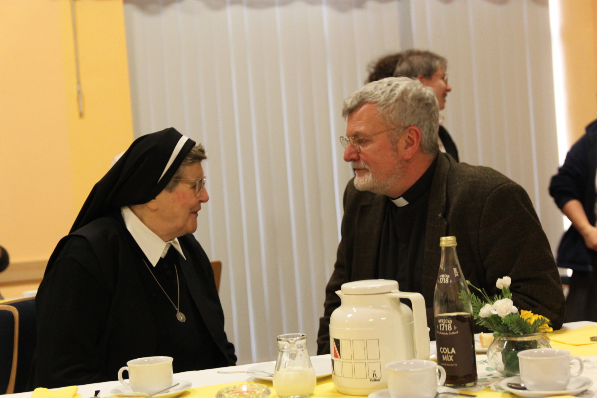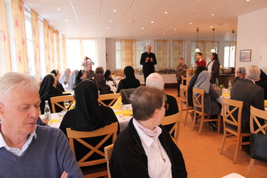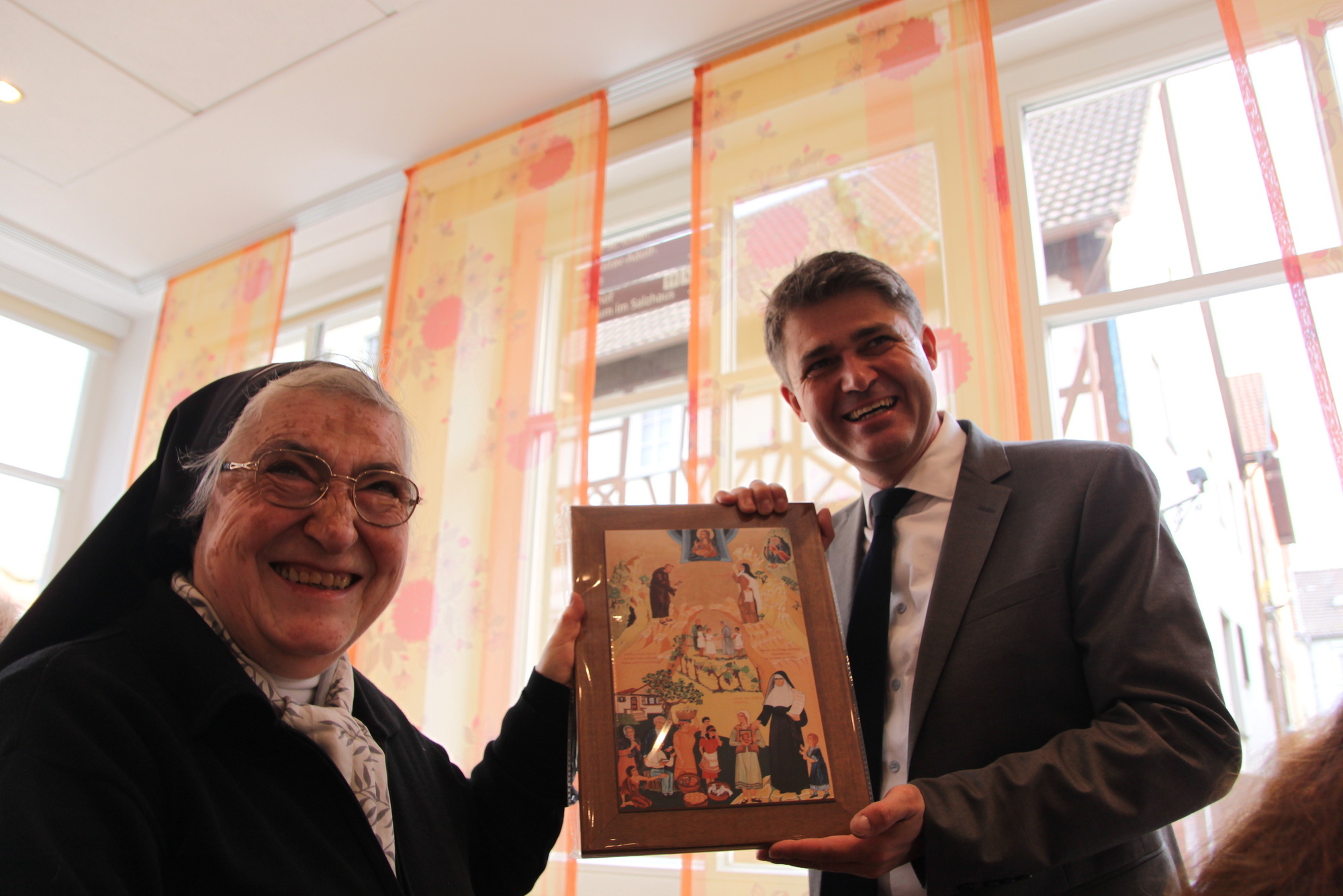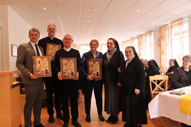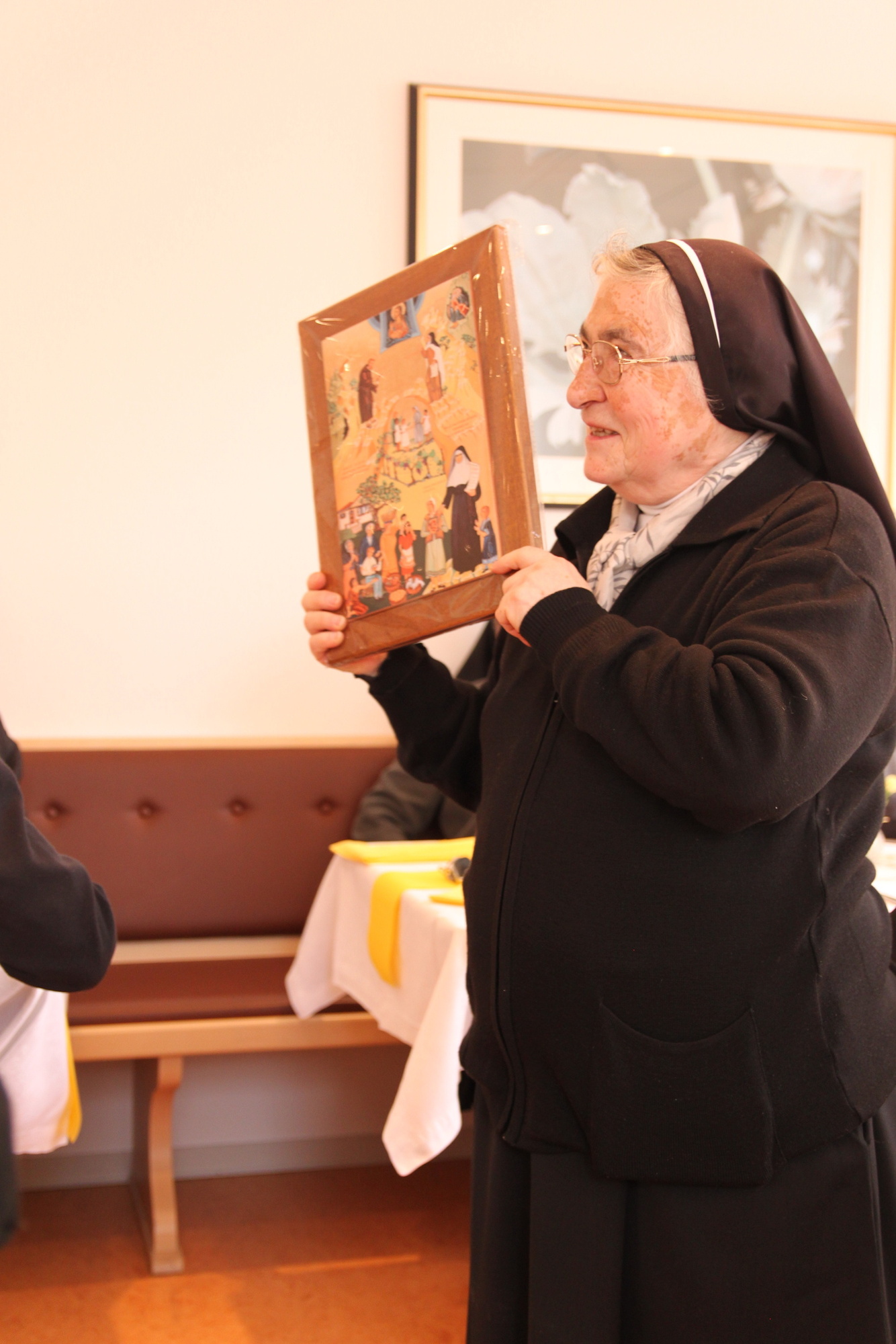 Nach dem Gottesdienst schloss sich in der Carl-Fritz-Stube das Mittagessen an. Die Kongregation hatte dazu die Mitglieder des Gemeindeteams und der Kirchenverwaltung sowie die beiden Verwandten von Franziska Streitel eingeladen. Sr. Teresina, die vom Orden mit der Vorbereitung dieses Festes betraut wurde, hatte noch eine Überraschung im Gepäck. Als Dankeschön für die Gastfreundschaft und als Zeichen der Verbundenheit überreichte sie Domvikar Paul Weismantel, stellvertretend für das Bistum Würzburg, Pfarrer Thomas Menzel, stellvertretend für die Pfarreiengemeinschaft Franziska Streitel Mellrichstadt, Bürgermeister Michael Kraus für die Stadt Mellrichstadt und den Angehörigen von Franziska Streitel jeweils eine Ikone, auf der der Ruf Gottes an Franziska Streitel dargestellt ist, den sie selbst mit den Worten beschreibt: „Im Geiste sah ich zwei Berge aufsteigen… in dem einen erkannte ich den Karmel, in dem anderen Alverno… Beide Berge wölbten sich zu einem einzigen zusammen…. Der Ruf, den ich erhielt, klang so: „Das aktive Leben mit dem kontemplativen zu vereinen“.