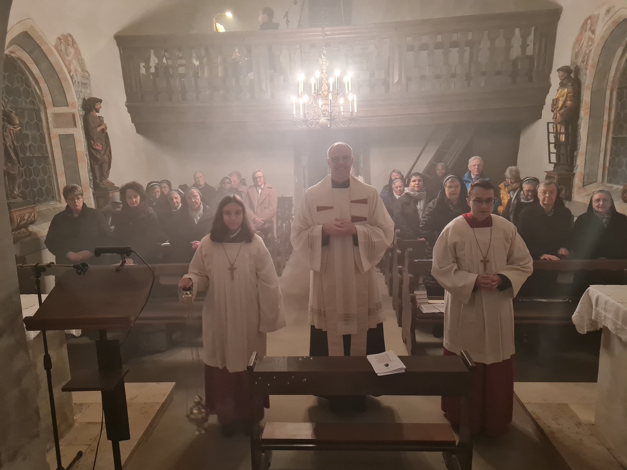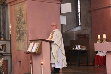 Pfarrer Thomas Menzel begrüßte zunächst alle Gottesdienstbesucherinnen und -besucher und deutete ihr Kommen als Zeichen der Wertschätzung und Anerkennung der großen Tochter Mellrichstadts und natürlich den Schwestern gegenüber, die hier viele Jahrzehnte gewirkt haben. Sein besonderer Gruß galt neben den bereits genannten Schwestern dem Bürgermeister der Stadt Mellrichstadt, Herrn Michael Kraus und dem Hauptzelebranten und Ordensreferenten der Diözese Würzburg, Domvikar Paul Weismantel.