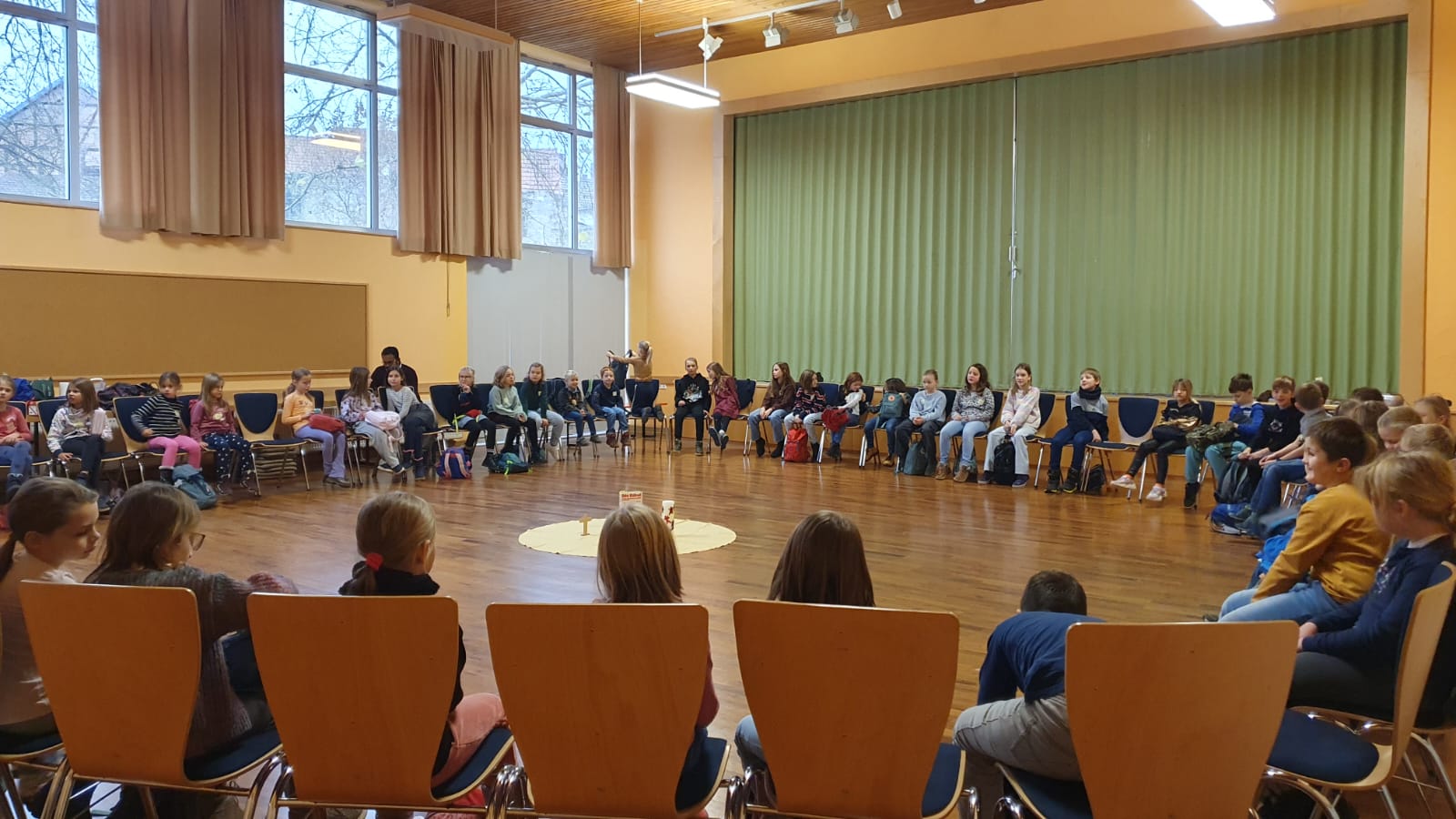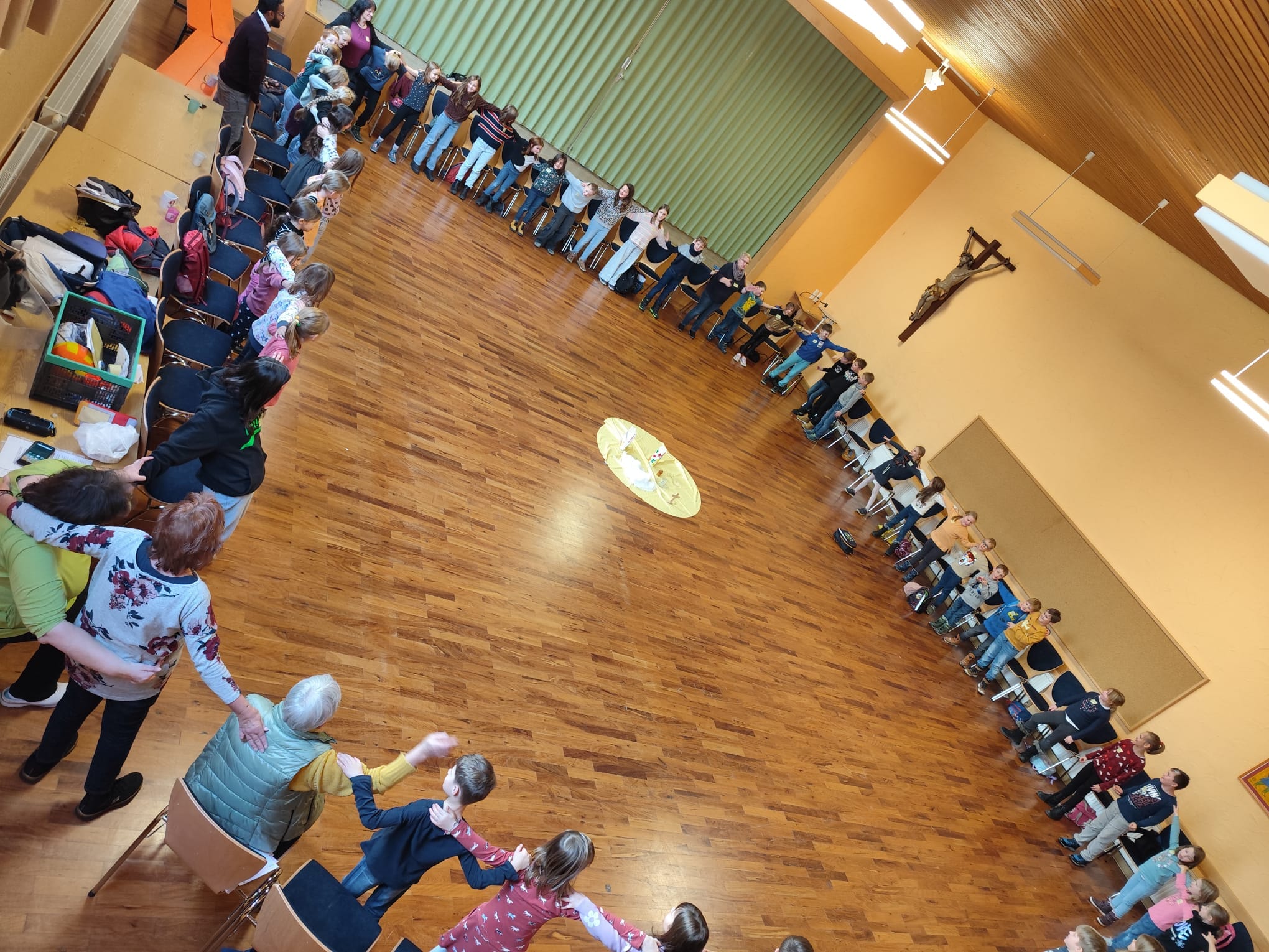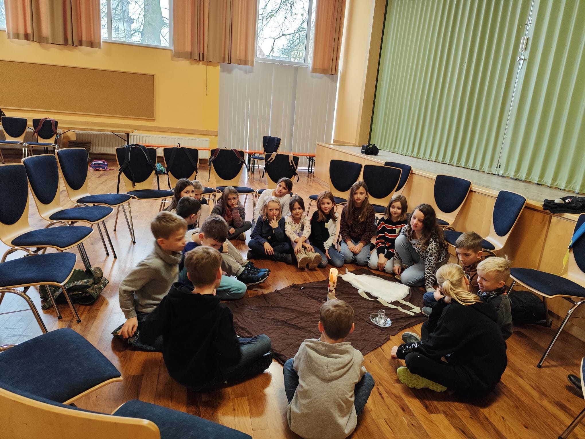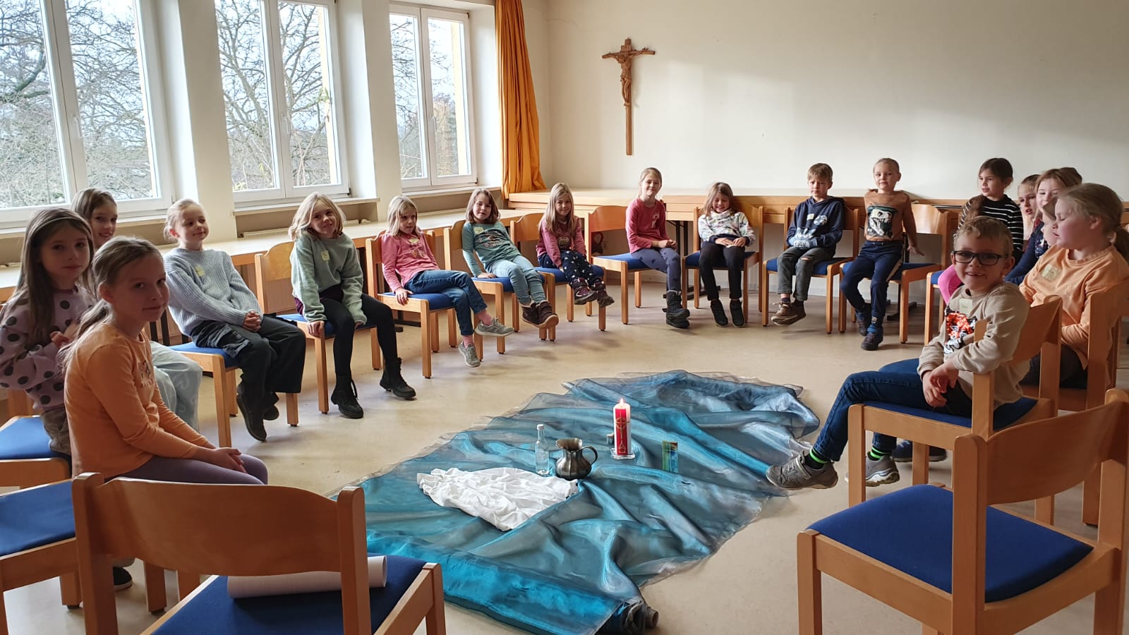 Nach der Begrüßung durch Gemeindereferentin Michaela Köller und einem Lied zum Wach-Werden und Ankommen wurde in der großen Runde ein Morgengebet gesprochen, bevor die Kinder, in drei Kleingruppen aufgeteilt, die Bedeutung der Taufsymbole kennen lernten.
