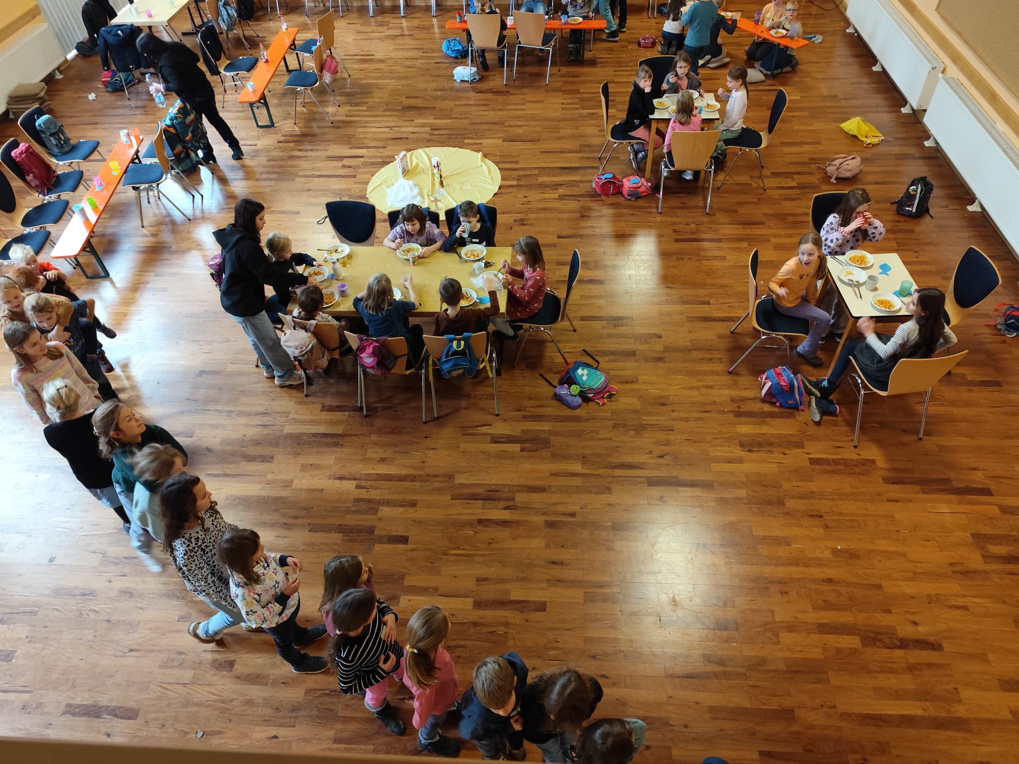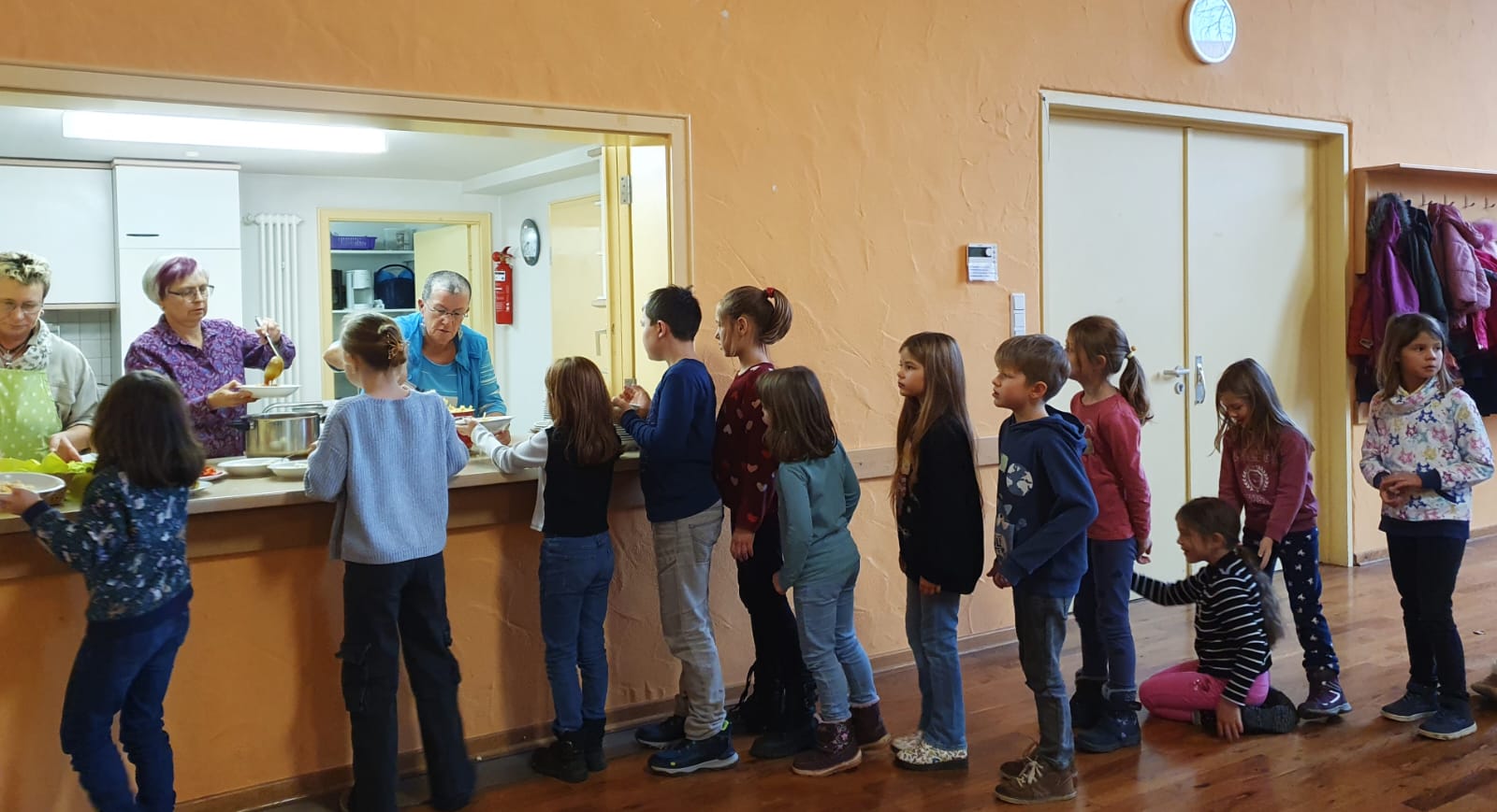 Großes Lob erhielten die Küchenfrauen für das leckere Mittagessen: „Das sieht gut aus und das schmeckt auch so“ hieß es da, und viele Kinder stellten sich gleich noch einmal in der Schlange zur Essensausgabe an.