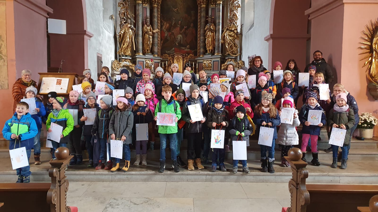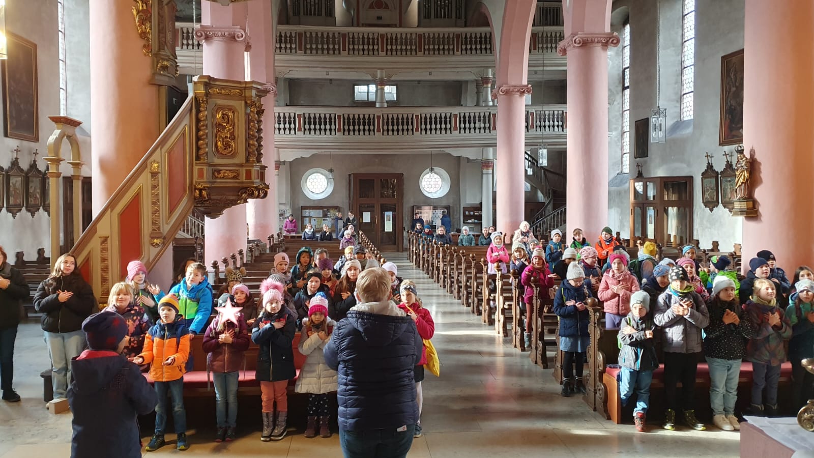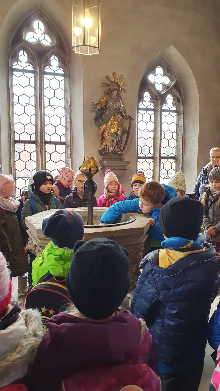 Zum Abschluss des Kinderbibeltages ging es noch in die Pfarrkirche St. Kilian. Dort versammelten sich alle in der Taufkapelle zur Tauferneuerung und zum gemeinsam gebeteten Vaterunser. „Vom Anfang bis zum Ende“ erklang danach das Schlusslied, und alle machten fröhlich mit.