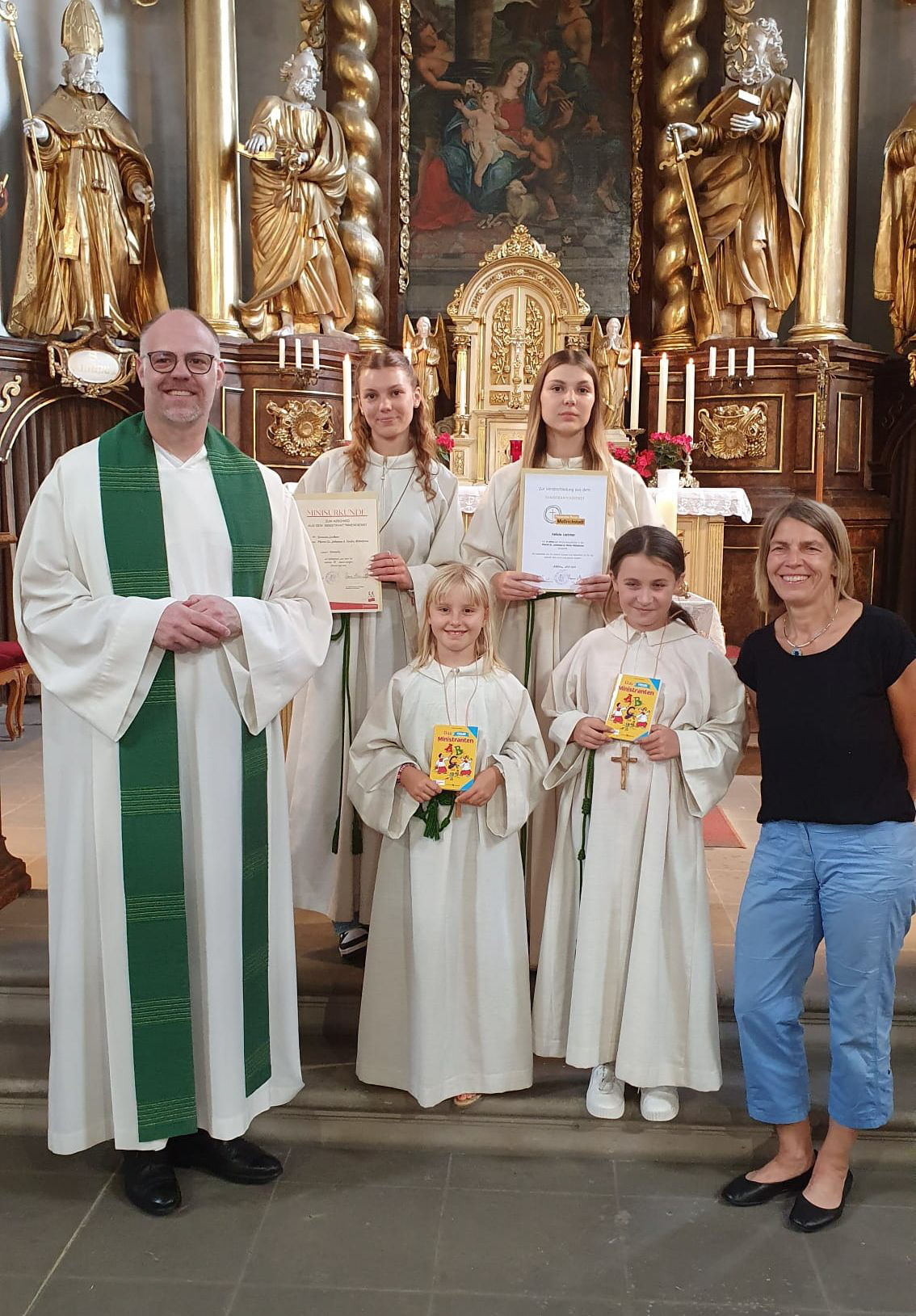 Am Samstagabend, 19. Juli 2025, fand in Mittelstreu im Rahmen der Vorabendmesse eine besondere Feierlichkeit statt: die Einführung der beiden neuen Ministranten Mia und Rosalie. Pfarrer Menzel fragte sie, ob sie ihren Dienst am Altar gewissenhaft und mit Freude erfüllen möchten. Mit einem kräftigen „Ich bin bereit“ zeigten Mia und Rosalie ihre Bereitschaft, aktiv am Gemeindeleben mitzuarbeiten. Im Anschluss wurden die Kreuze der neuen Ministranten gesegnet. Die Gemeinde zeigte ihre Freude mit einem kräftigen Applaus.