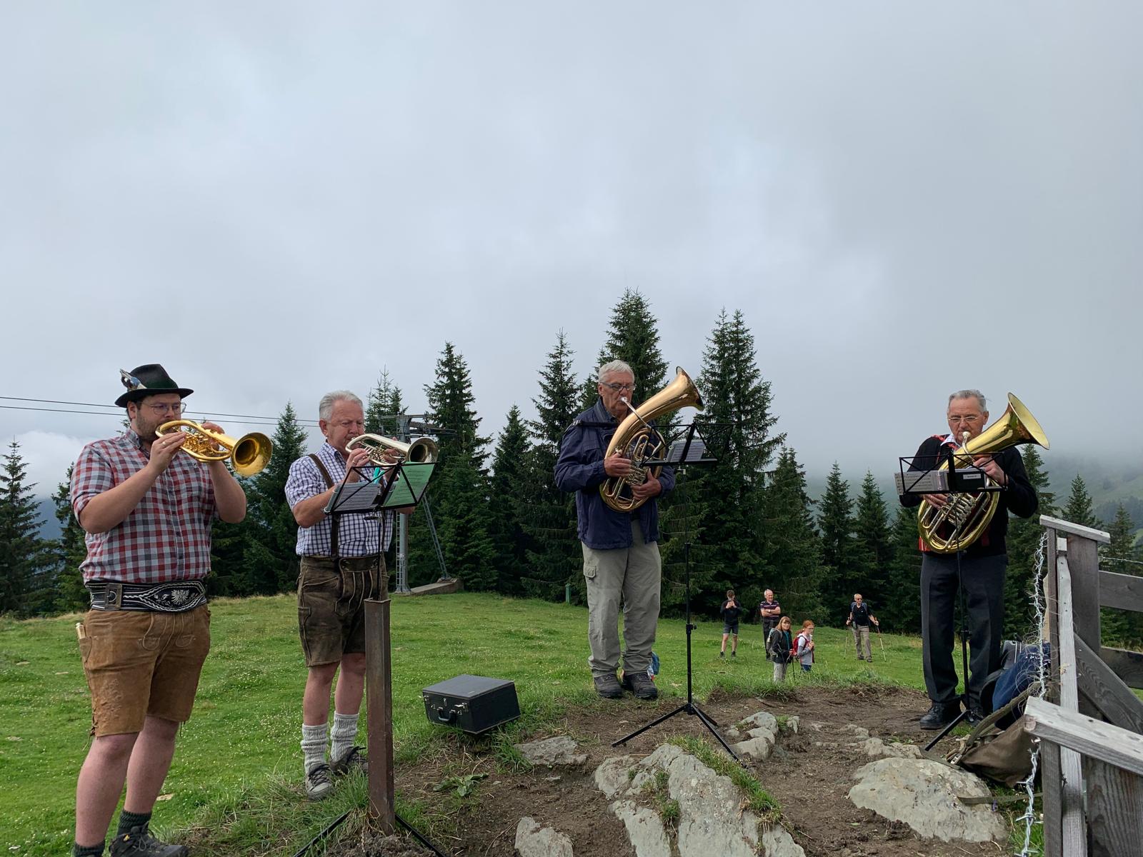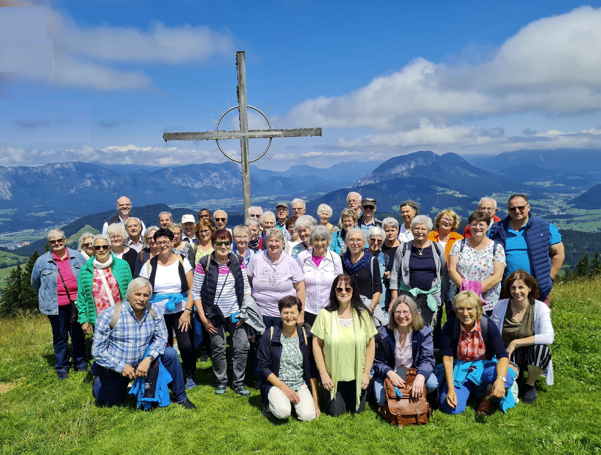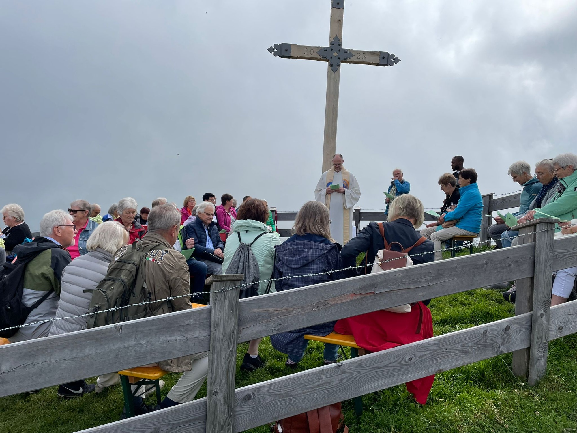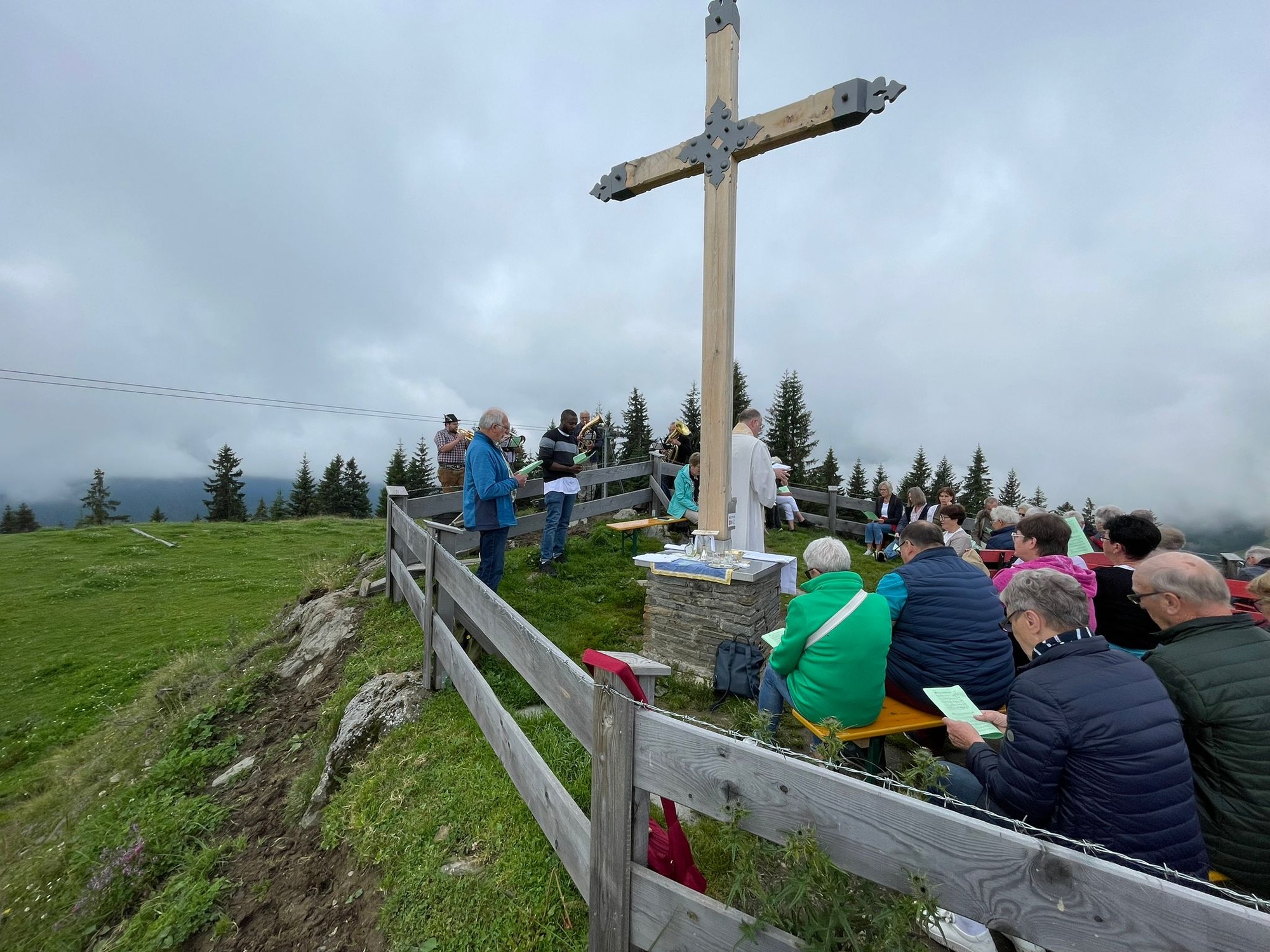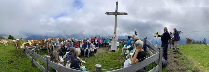 Am Sonntag Morgen, nach Frühstück und Abreise aus dem Hotel, brachte die Gondelbahn von Niederau aus die Gruppe zum Markbachjoch. Von hier bietet sich ein wunderbarer Blick auf das Tal Wildschönau, den Wilden Kaiser mit seinen schroffen Bergen und das Rofangebirge. Direkt am Gipfelkreuz fand die Bergmesse statt, die von einheimischen Blasmusikern musikalisch gestaltet wurde.