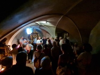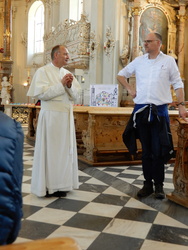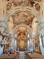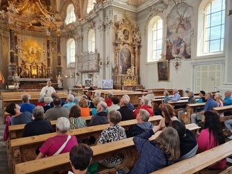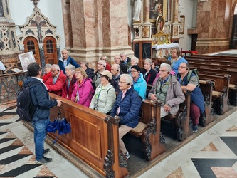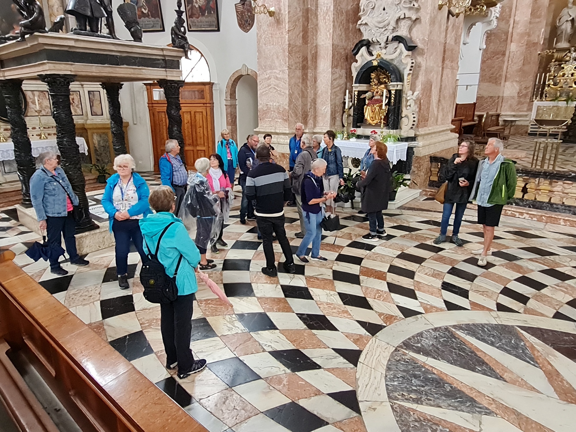 Den Abschluss des Aufenthaltes in Innsbruck bildete er Besuch der Basilika Wilten im Innsbrucker Stadtteil Wilten. Die Kirche gehört zu den ältesten Kulturstätten Nordtirols und ist die Mutterpfarrei der Stadt Innsbruck. Seit 1140 wird die Betreuung der Pfarrei Wilten vom Prämonstratenserorden übernommen, bis heute. Der jetzige Pfarrer Adrian Gstrein OPraem übernahm die Führung und begrüßte die Gruppe vor der Basilika. Sie gilt als die schönste Rokoko-Kirche des Landes und ist neben der Stiftskirche des Prämonstratenserstiftes die zweite große Kirche Wiltens. Zarte Farben, ein lichtdurchfluteter Kirchenraum, elegant-leichter Stuck, all das spiegelt den klassischen Anmut des Rokoko wieder – ein einmaliges Erlebnis. Pfarrer Adrian Gstrein OPraem sprach aber nicht nur über das Kirchengebäude, er gab auch Einblicke in den Prämonstratenserorden und das Leben der Kirche in Österreich, das sich wenig von dem in Deutschland unterscheidet.