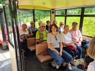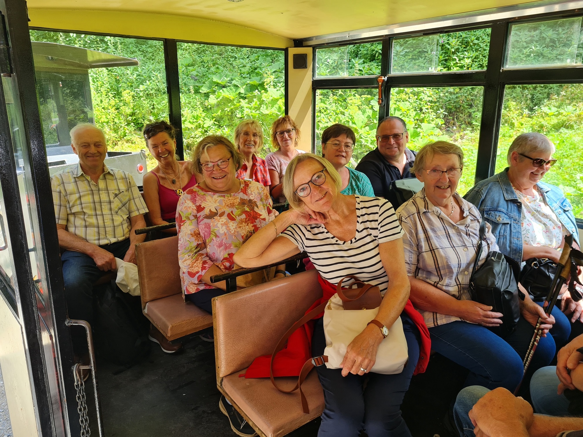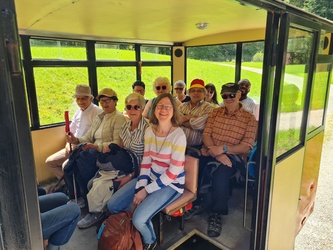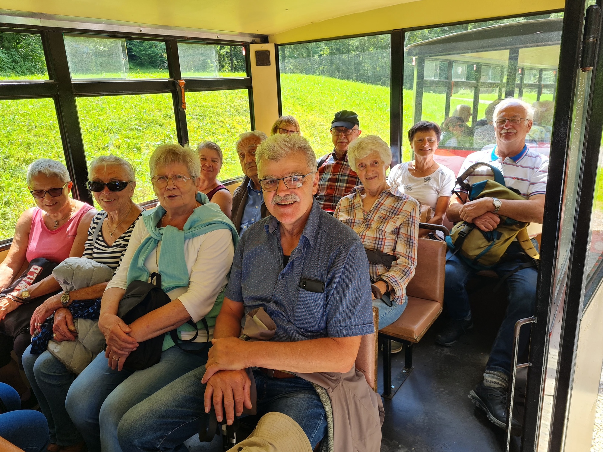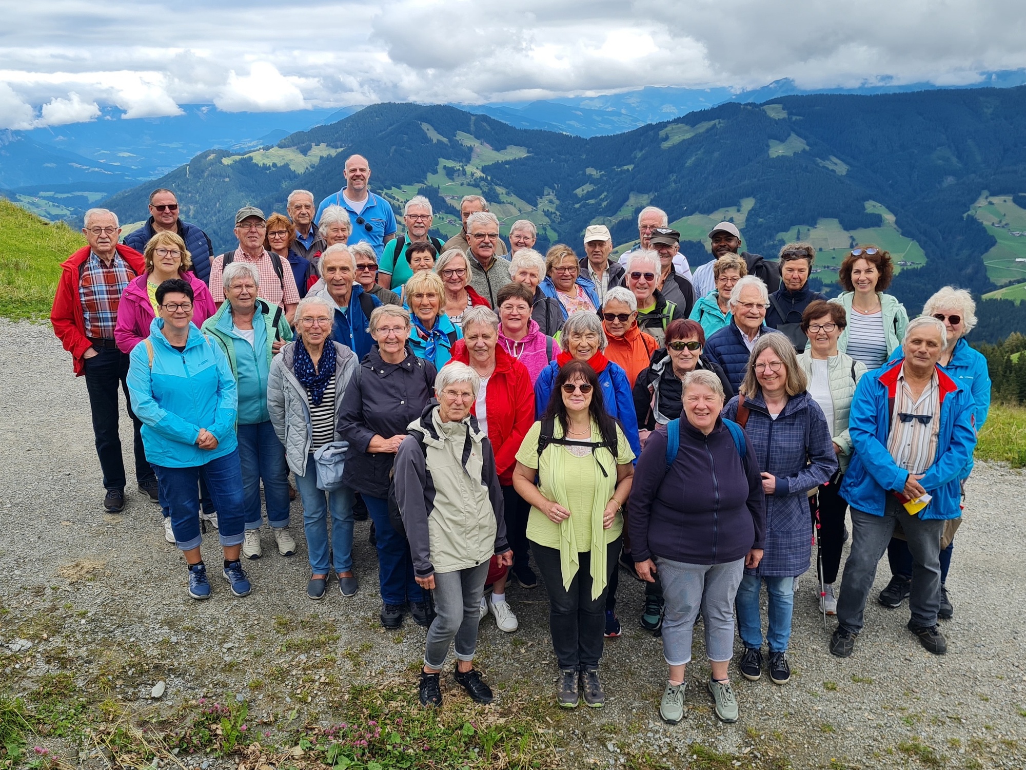 Am Samstag, 13.07., ging es nach einem ausgiebigen Frühstück mit dem Bus nach Kundl zum Ausgang der Kundler Klamm, einer der schönsten Naturschluchten in Österreich und zugleich die kürzeste Verbindung zwischen der Wildschönau und dem Tiroler Inntal. Von dort aus konnte jeder und jede in eigenem Tempo die Klammstrecke von etwa 3,5 Kilometern hinaufspazieren. Das rauschende Wasser und die steil aufragenden Felsen beeindruckten. Ein wahres Naturerlebnis. Vom Eingang der Klamm in Mühltal, Wildschönau, ging es dann mit dem Bummelzug direkt zur Talstation der Schatzbergbahn in Auffach. Die Gondelbahn brachte die Gruppe hinauf auf dem gleichnamigen Berg. Hier eröffnete sich ein grandioser Ausblick auf die umliegende Bergwelt der Wildschönau und auf das Alpbachtal. Auf 1.800m Seehöhe, in der neu renovierten Schatzbergalm, die mit viel Liebe und Tiroler Gastfreundschaft geführt wird, wurde das Mittagessen eingenommen.