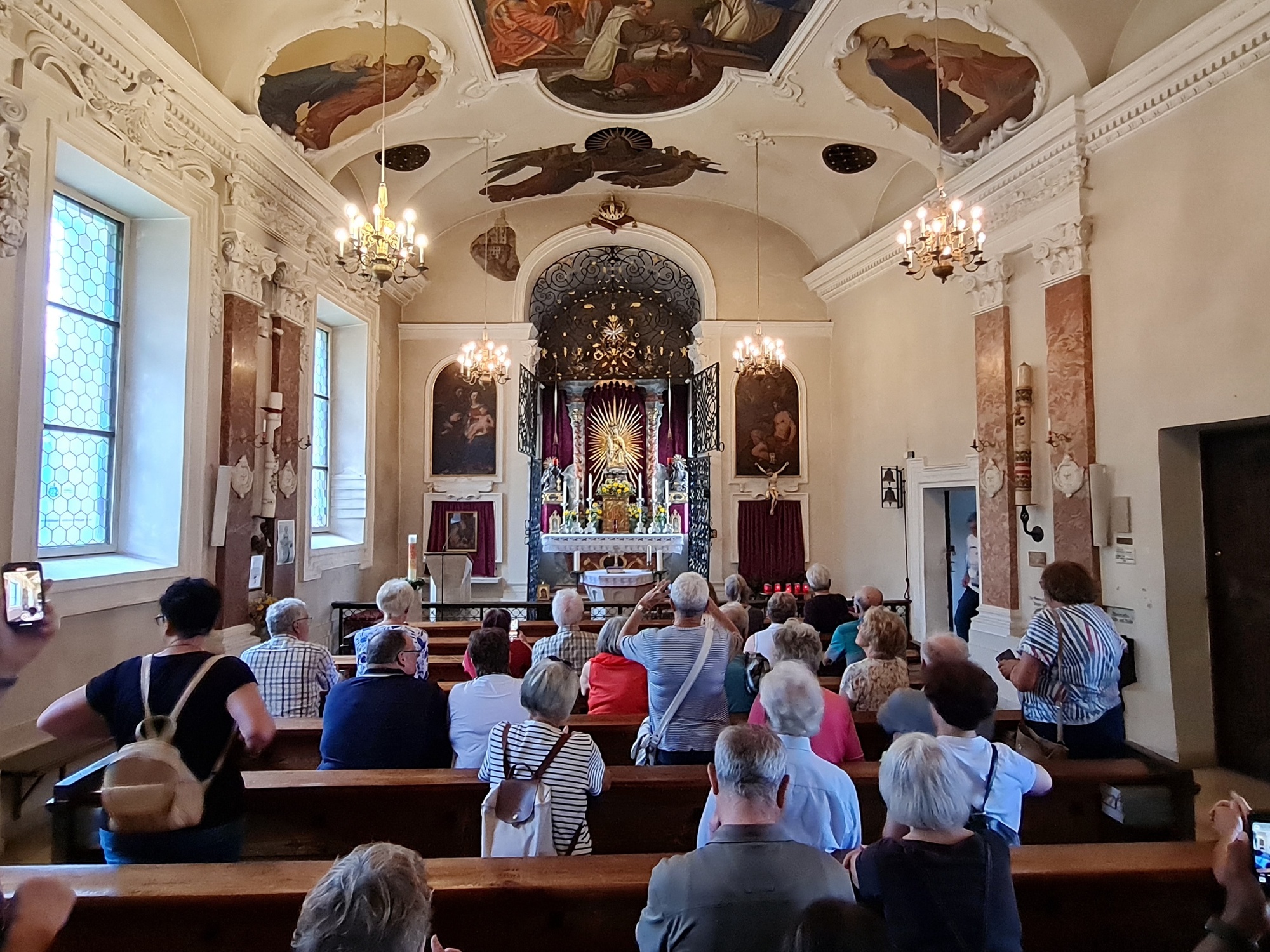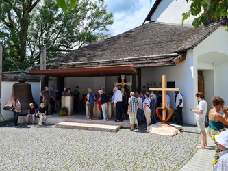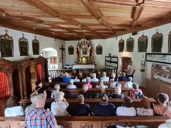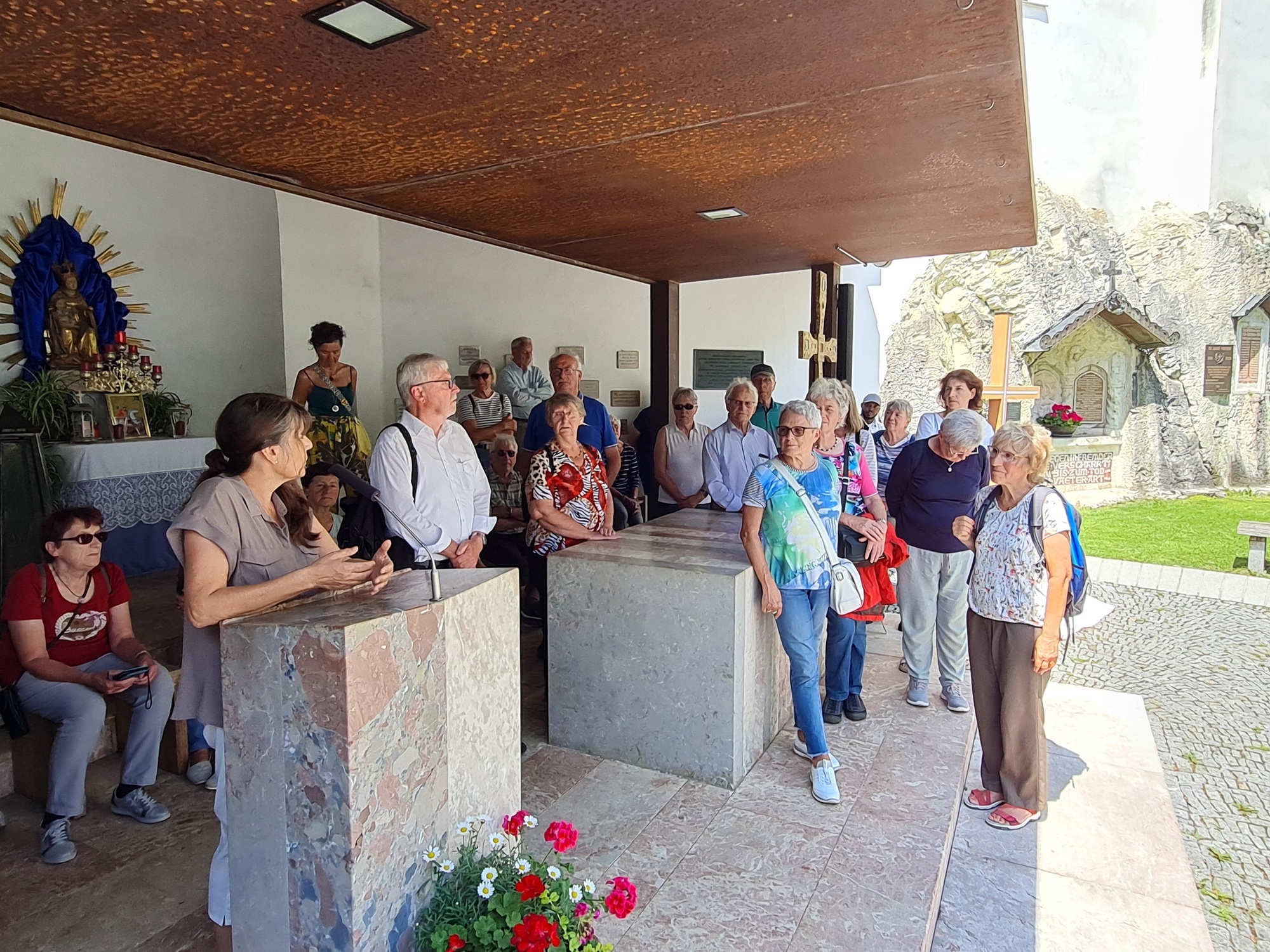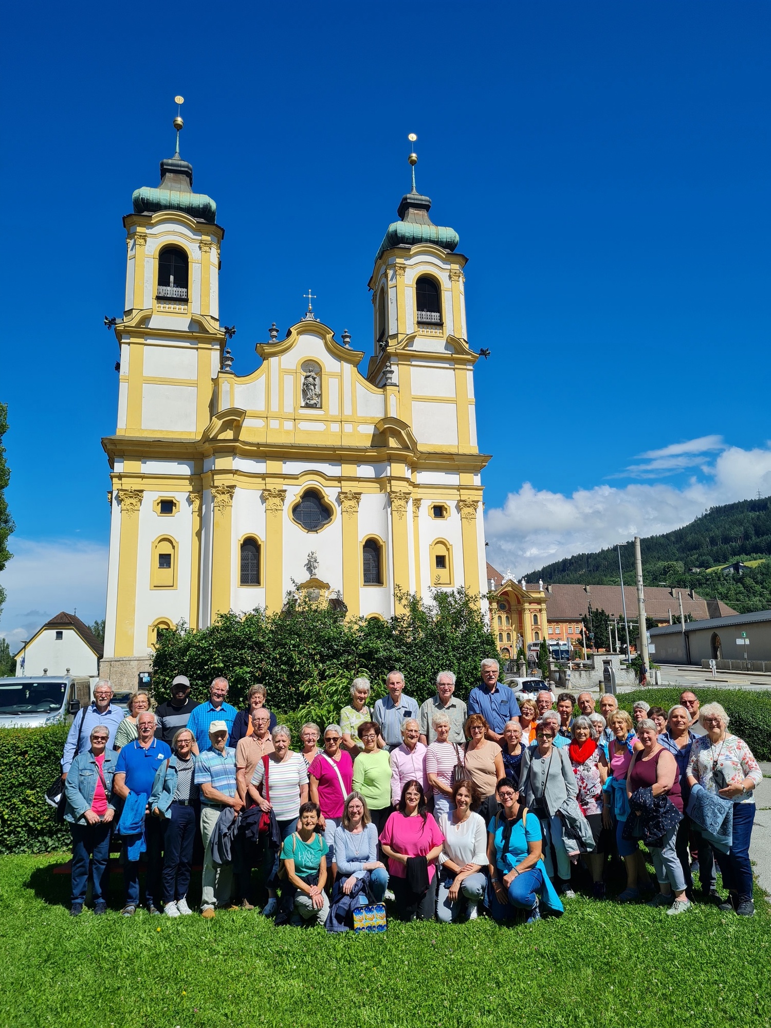 Am frühen Morgen des 11. Juli startete der Bus mit 46 Personen aus dem Pastoralen Raum in Richtung Süden. Nach einer ersten Kaffeepause an der Raststätte Feucht mit selbstgebackenem Kuchen wartete im „Hotel-Restaurant zur Post“ in Kiefersfelden das Mittagessen auf die Reisegruppe. Danach ging es weiter in das kleine Dörfchen Mariastein im Unterinntal. Auf einem mächtigen Felsen erhebt sich dort der 42 Meter hohe Wohnturm einer ehemaligen Burg aus dem 14. Jahrhundert. Nach einem Marienwunder wurde der Wohnturm zu einem der bekanntesten Wallfahrtsorte des Landes.