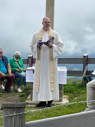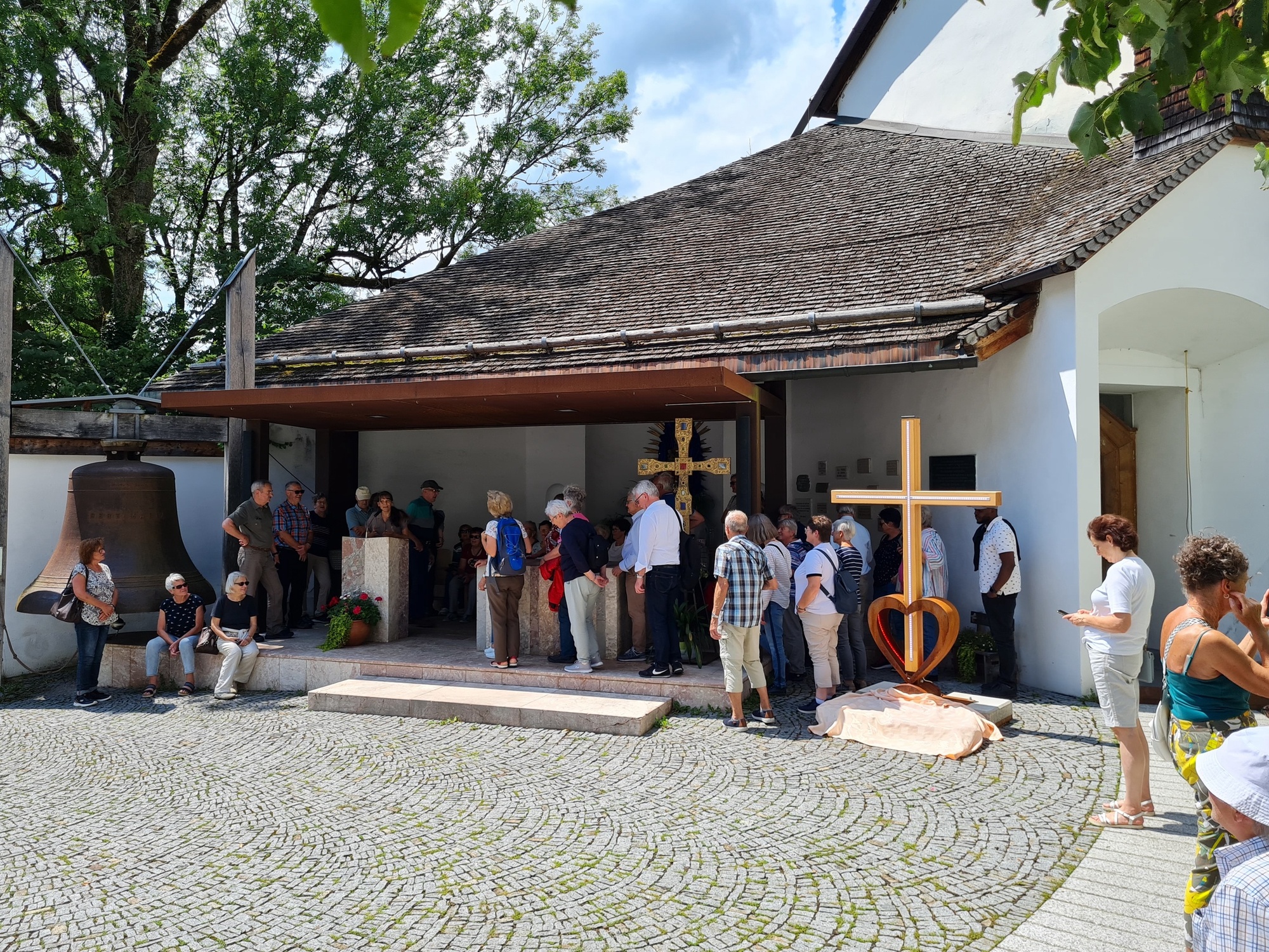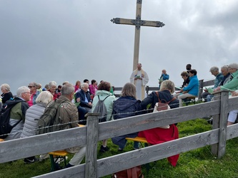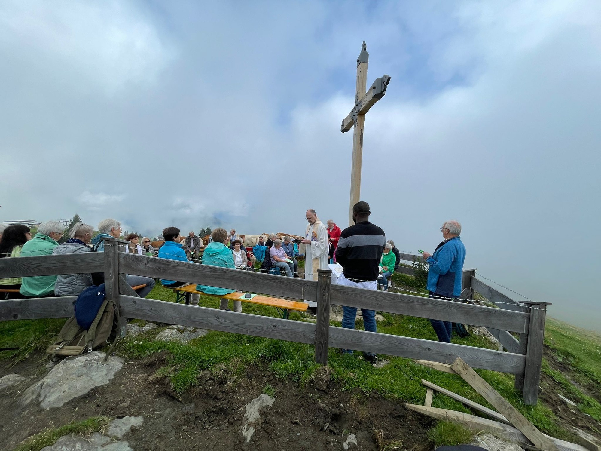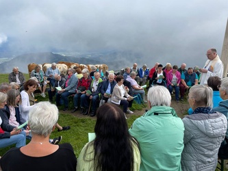 Die friedliche Umgebung, der Nebel, der teilweise noch über dem Tal lag, das aufbrechende Sonnenlicht, das Eins-Sein mit der Natur, der Blick ins Tal und auf die Berge, zog wohl alle in seinen Bann. Sogar die Kühe ließen sich in unmittelbarer Nähe nieder. Dazu sagte eine Teilnehmerin: „Der Heilige Franziskus hätte seine wahre Freude!“ Und so wurde dieser Gottesdienst unter freiem Himmel zu einem einzigartigen Erlebnis. Auch so manche Wanderer bleiben stehen und ließen das Geschehen auf sich wirken. Der spontane Applaus am Ende der Messe drückte die Freude aller Beteiligten aus, man fühlte sich inspiriert und gestärkt.