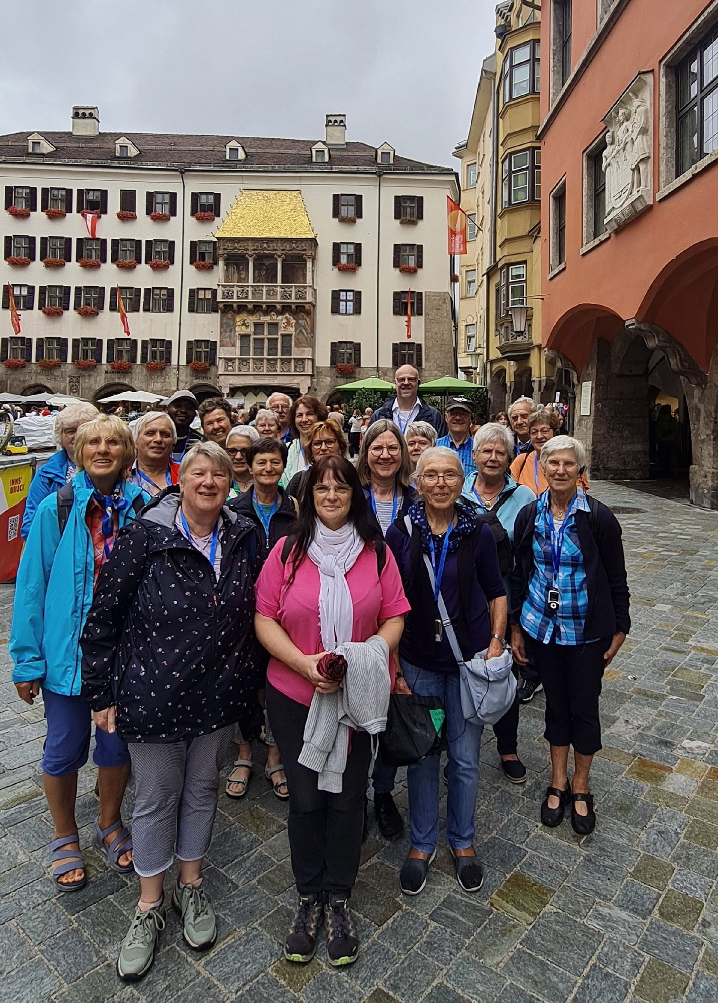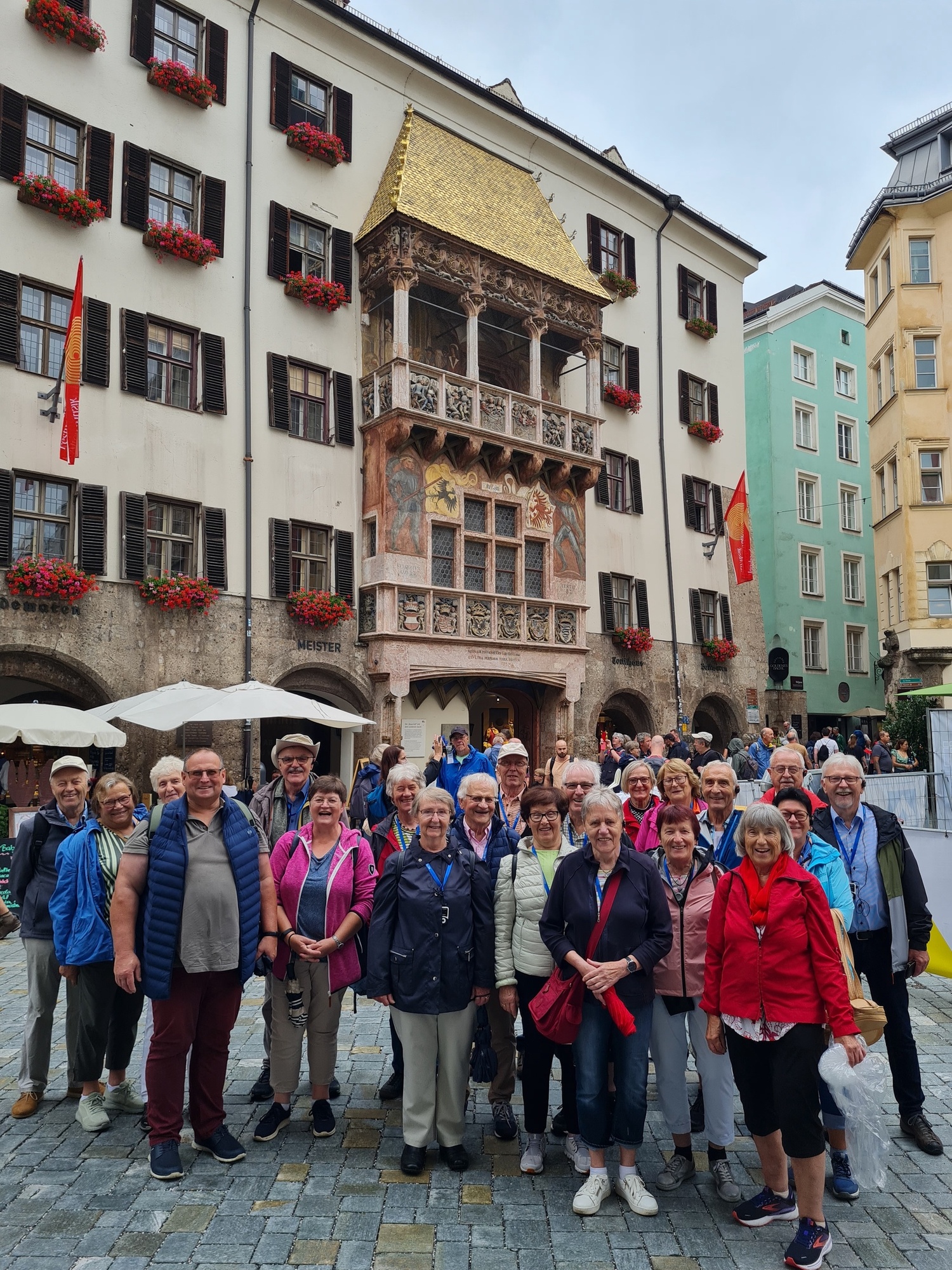 Am Freitag, 12.07., stand Innsbruck auf dem Programm. Die geführte Stadtrundfahrt musste leider bei strömendem Regen stattfinden. Doch sobald sich die Gruppe zum Stadtrundgang aufteilte, ließ der Regen nach. Hofgarten, Hofburg, Dom St. Jakob und natürlich die wohl berühmteste Sehenswürdigkeit von Innsbruck, das goldenen Dachl, standen auf dem rund einstündigen Spaziergang durch historische Pracht der Altstadt auf dem Programm. Die schmalen Gassen mit den historischen Häusern und den vielen Erkern haben fast schon südliches Flair, und das mitten in den Alpen. Im Anschluss konnte die Innenstadt auf eigene Faust erkundet werden. Egal, ob ein Spaziergang entlang der Fußgängerzone in der Maria-Theresien-Straße mit der Annasäule oder eine Pause in einem der vielen Cafes mit einer großen Auswahl an Strudeln: nun war verweilen und genießen angesagt.