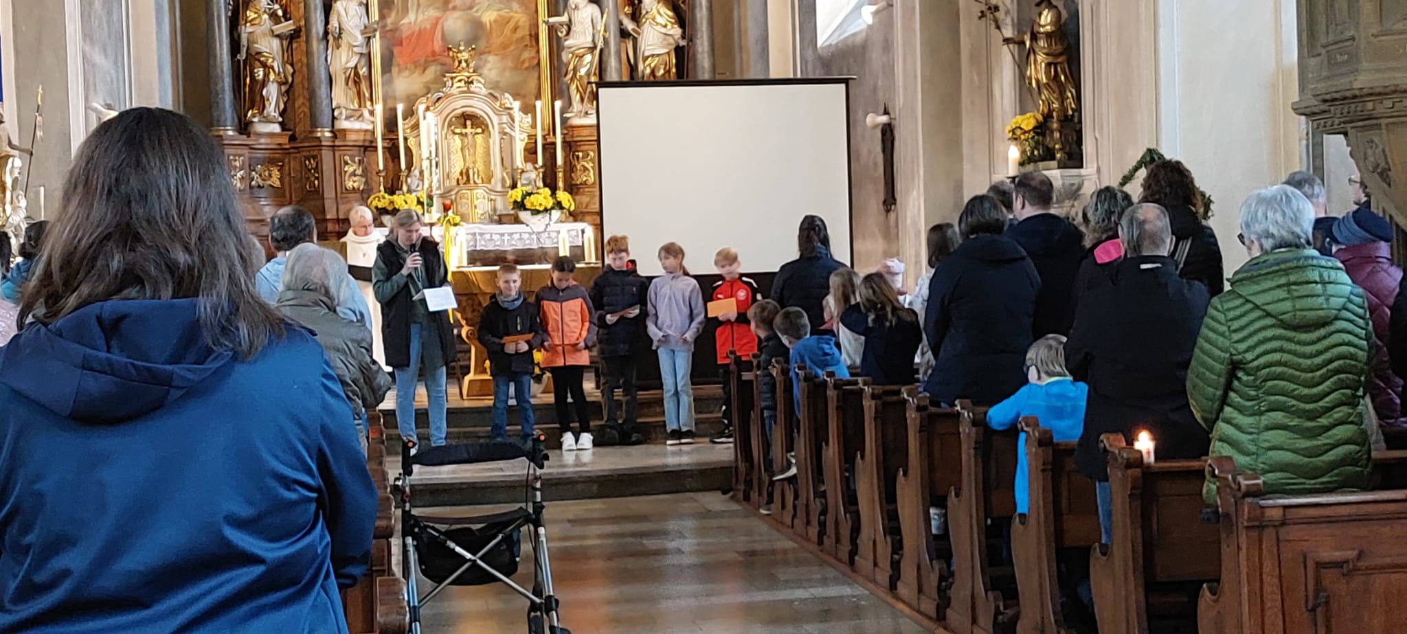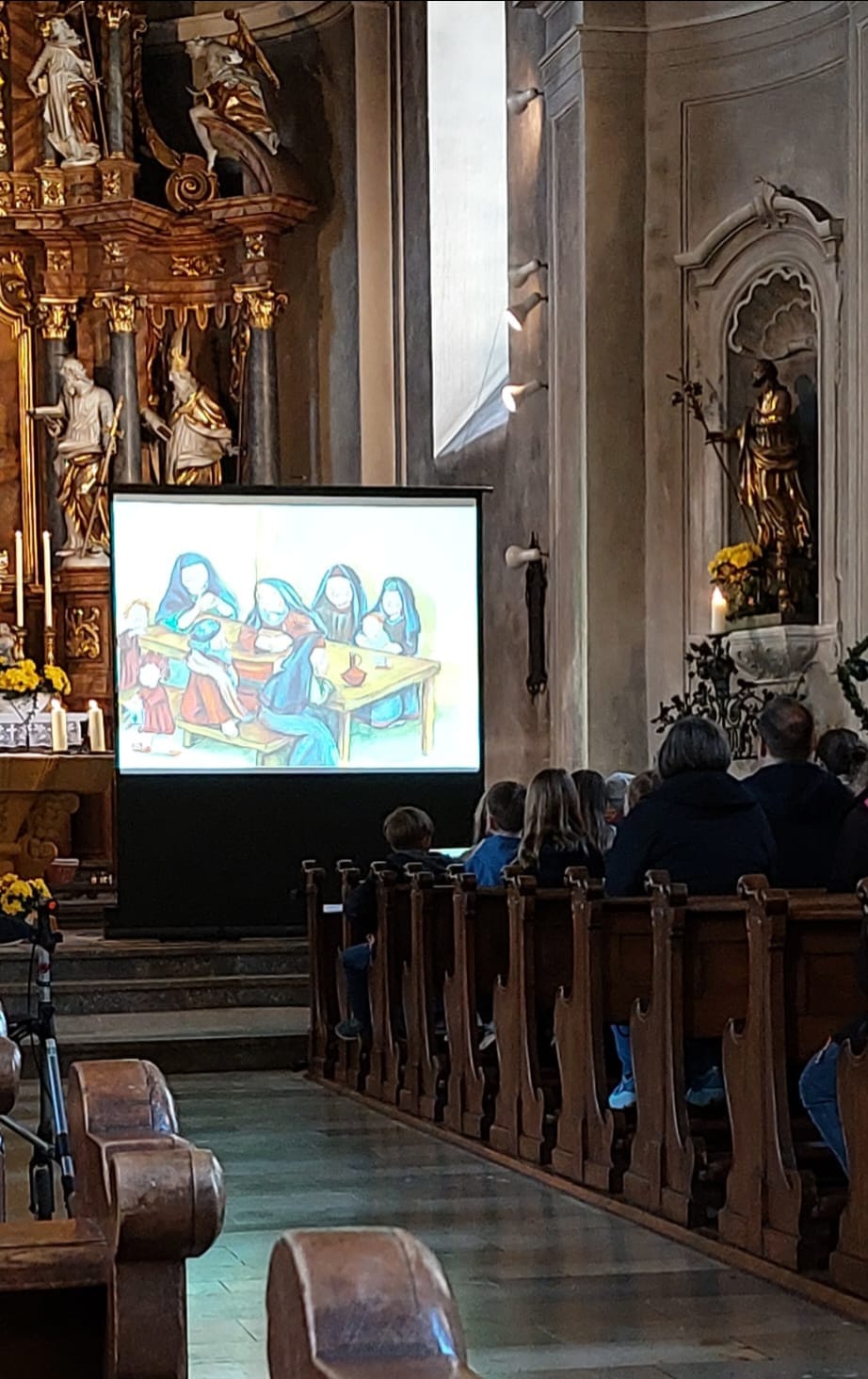 Viele Kinder und Erwachsene, verschiedener Altersstufen, lauschten der Ostergeschichte, die in Text und Bildern dargestellt wurde.