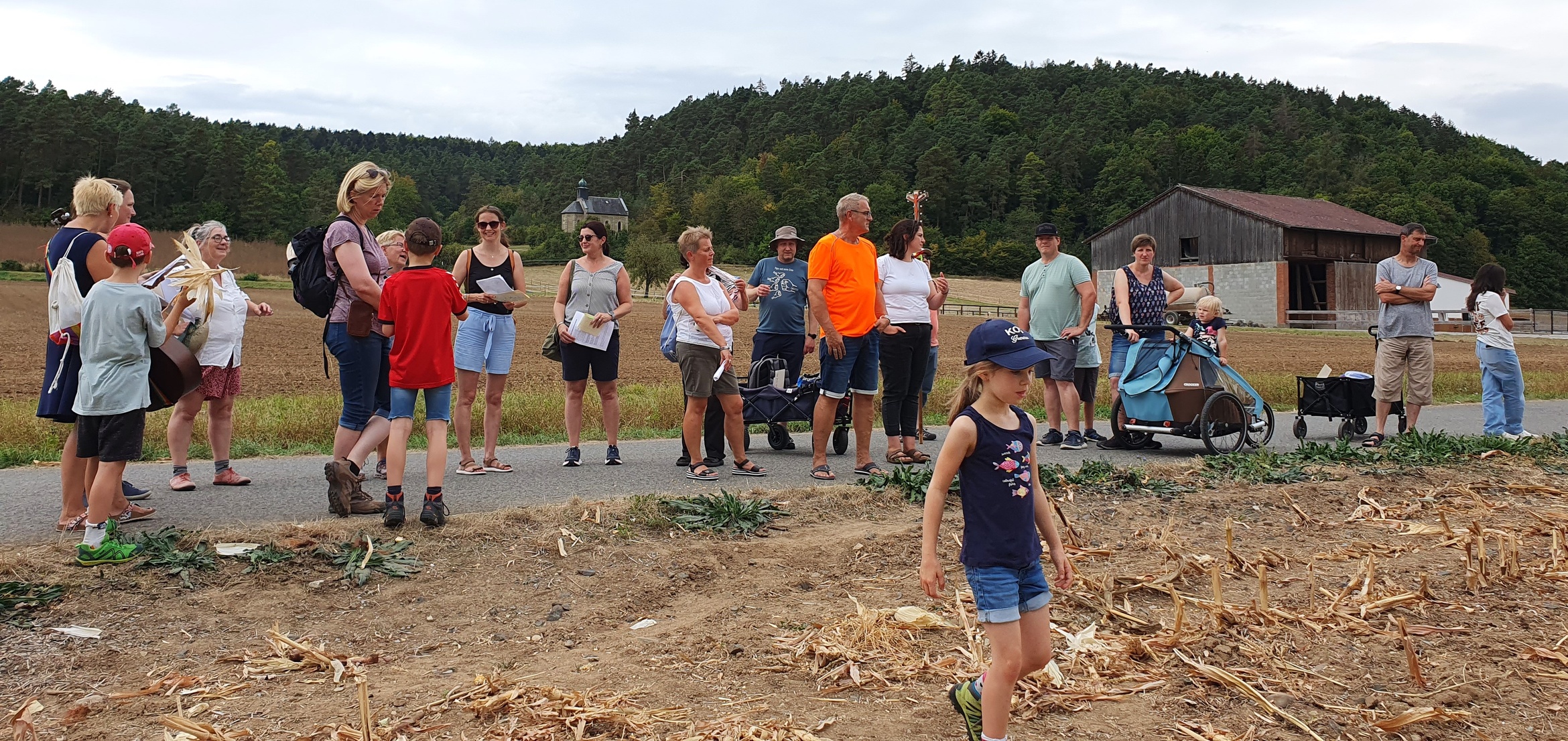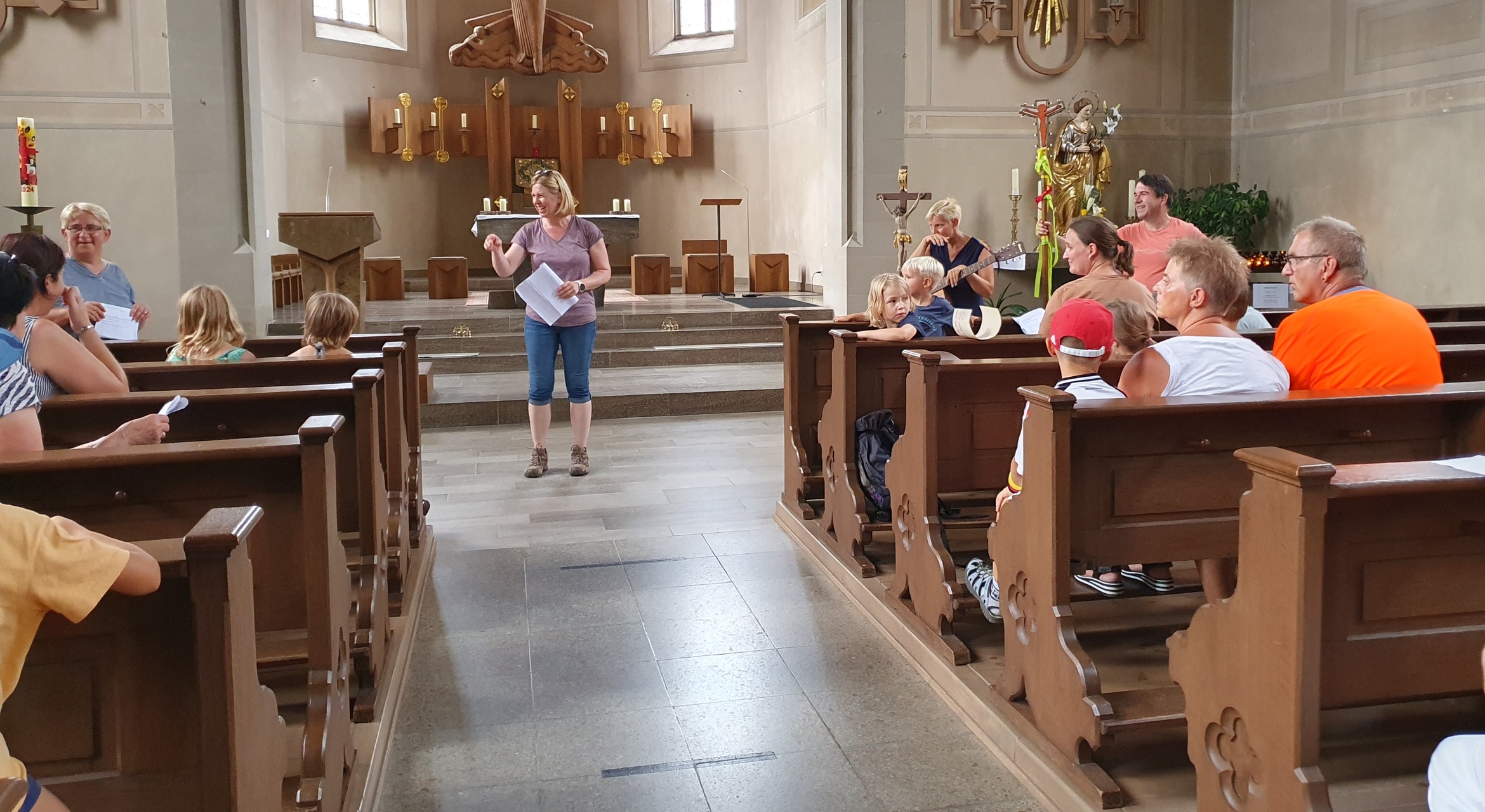 Nach jeder Station erzählten die Kinder von ihren Entdeckungen und die Familien formulierten dazu jeweils einen Danke-Satz. Nach einem freudigen Danklied an Gott ging es weiter zur nächsten Station. Der Kirchturm von Stockheim rückte immer näher und wies den Weg. Zum Abschluss zogen die „Wallfahrer“ in die Kirche St. Vitus ein. Dort wurde noch einmal kurz zusammengetragen, was man unterwegs alles erlebt hatte. So wie früher schon Menschen ihren Dank in Psalmen vor Gott getragen haben, wurden nun die unterwegs gesammelten Dankessätze als „Psalm“ vorgelesen und das Vaterunser gebetet.