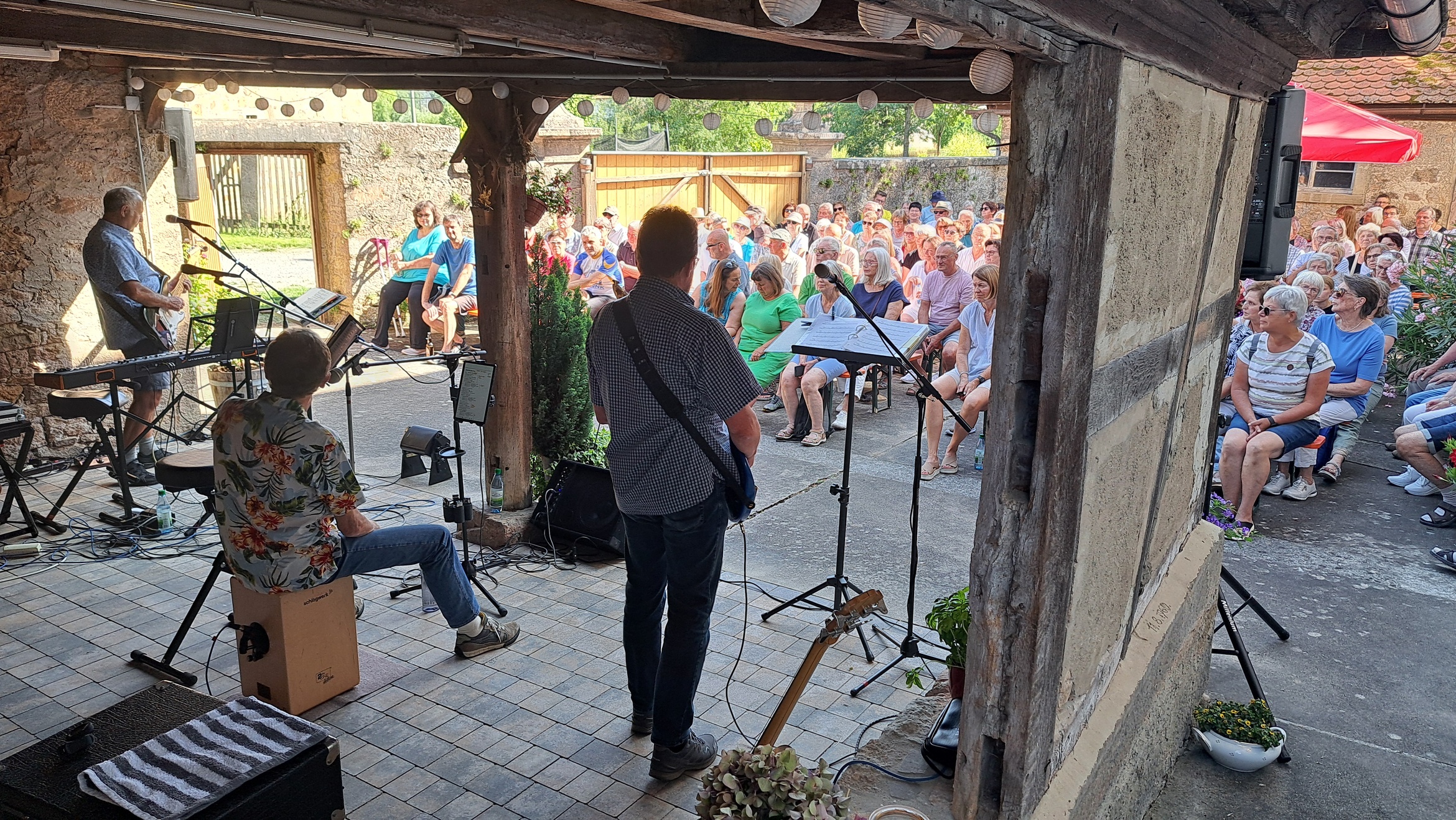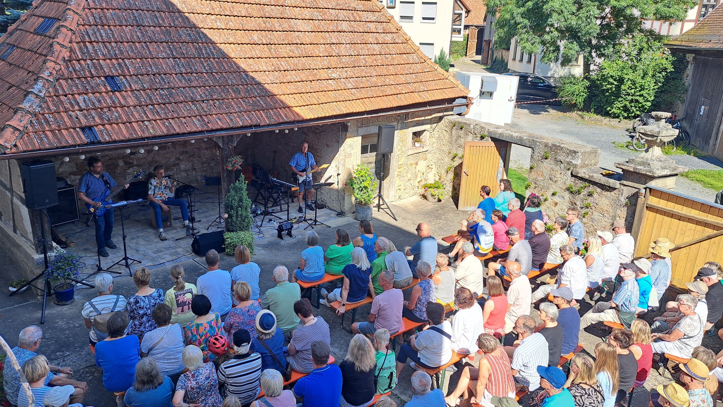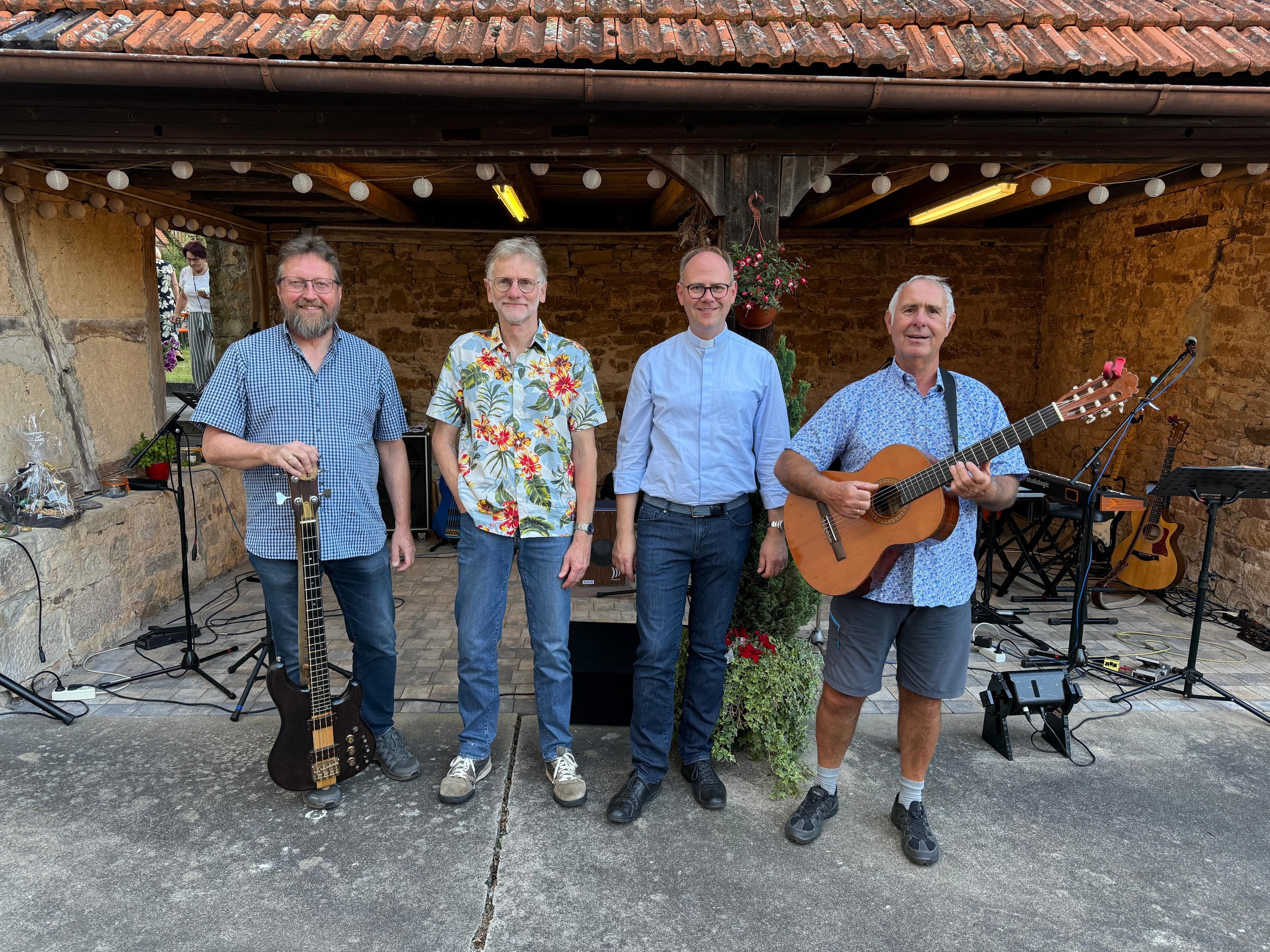 Pfarrer Steffen Behr begrüßte die zahlreichen Gäste zu einem musikalischen Abend, der die Erwartungen weit übertroffen hat. In einer Zeit, in der sich kirchliche Veranstaltungen, Traditionen und liebgewonnene Angebote häufig dem Rotstift gegenübersehen – sei es aus mangelnder Nachfrage, fehlendem Engagement oder knapper Personalressourcen – zeigte dieses Format, wie erfrischend Neues sein kann. Bei herrlichem Sonnenschein und angenehmen Temperaturen füllte sich der Hof rasch mit Musikliebhabern. Die aus dem Raum Gemünden a. M. stammende Band Play on präsentierte sich mit starken Stimmen und abwechslungsreichen Arrangements: Peter Häring und Egon Birkenmaier bilden seit mehr als fünf Jahrzehnten ein eingespieltes Duo, unterstützt wurden sie von Dieter Holl. Gemeinsam brachten die drei Musiker Folk-, Country-, Bluesrock- und Rhythm & Blues-Klänge auf die Bühne. Repertoire-Highlights reichten von Crosby, Stills, Nash & Young über Sting, Eric Clapton, Bill Withers, Bob Dylan, The Beatles bis hin zu Simon & Garfunkel. Die Songs zeichneten sich durch abwechslungsreiche Harmonien, markante Stimmen, mehrstimmigen Gesang, ausgefeilte Arrangements und tiefgreifende Texte aus, die beim Publikum für manche Gänsehautmomente sorgte. Pfarrer Steffen Behr unterstützte bei einigen Stücken gesanglich die Musiker und wurde von den Zuhörern mit herzlichem Applaus bedacht. Die Zuhörer zeigten sich begeistert: Sie sangen und klatschten rhythmisch zu vielen Liedern mit. Zum Abschluss bedankte sich Pfarrer Behr herzlich bei den Künstlern und allen Engagierten hinter den Kulissen. Eine Spende wurde gesammelt, deren Erlös der dringend notwendigen Treppensanierung der Bastheimer Kirche zugutekommen soll. Im Anschluss lud Pfarrer Behr im Namen der Kirchenverwaltung und dem Gemeindeteam zum Grillen in den Pfarrgarten ein – eine gelungene Gelegenheit zum geselligen Ausklang des Abends. Die erfolgreiche Premiere des Sommerloch-Konzertes lässt hoffen, dass diese Veranstaltung im kommenden Sommer fortgesetzt wird.