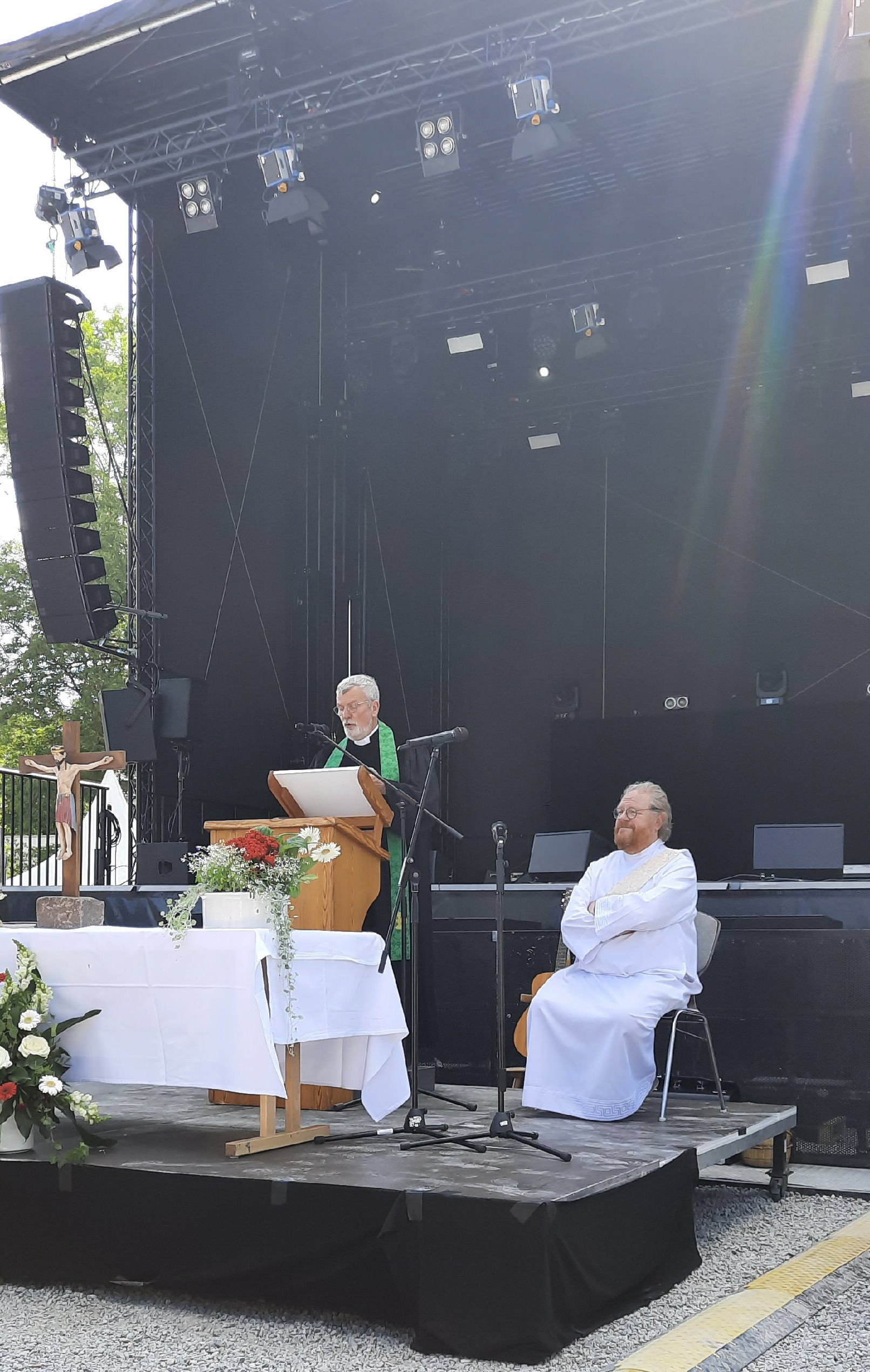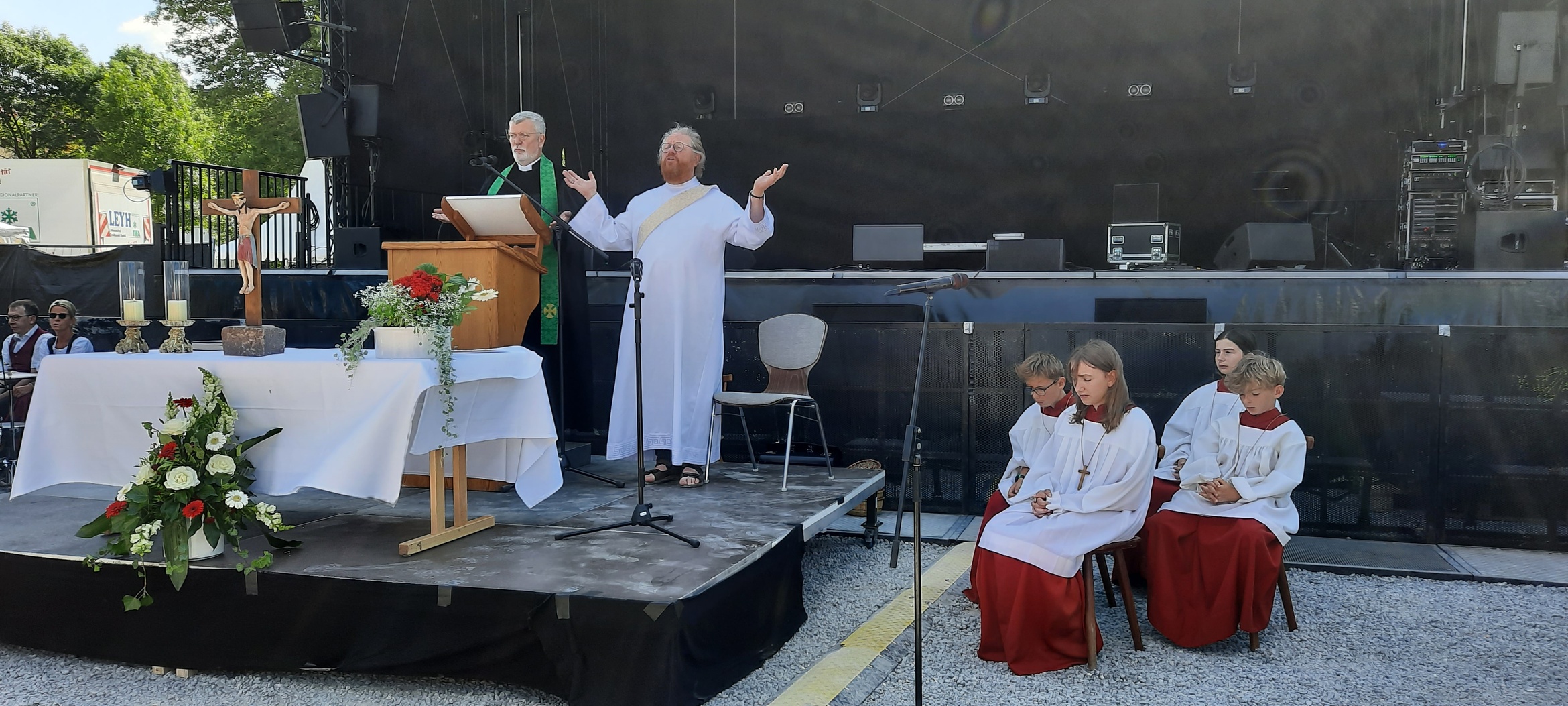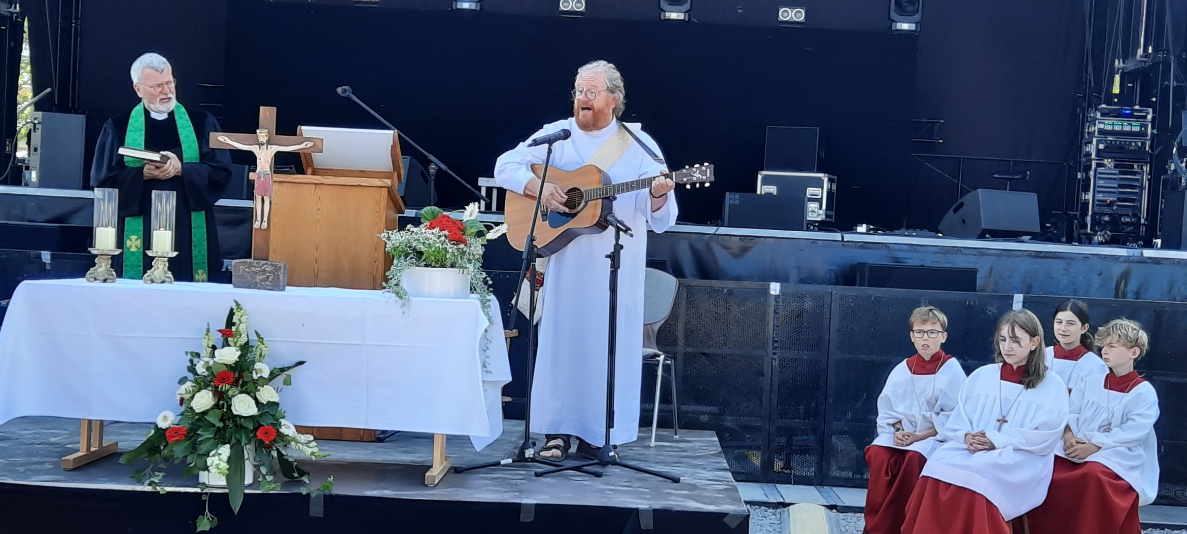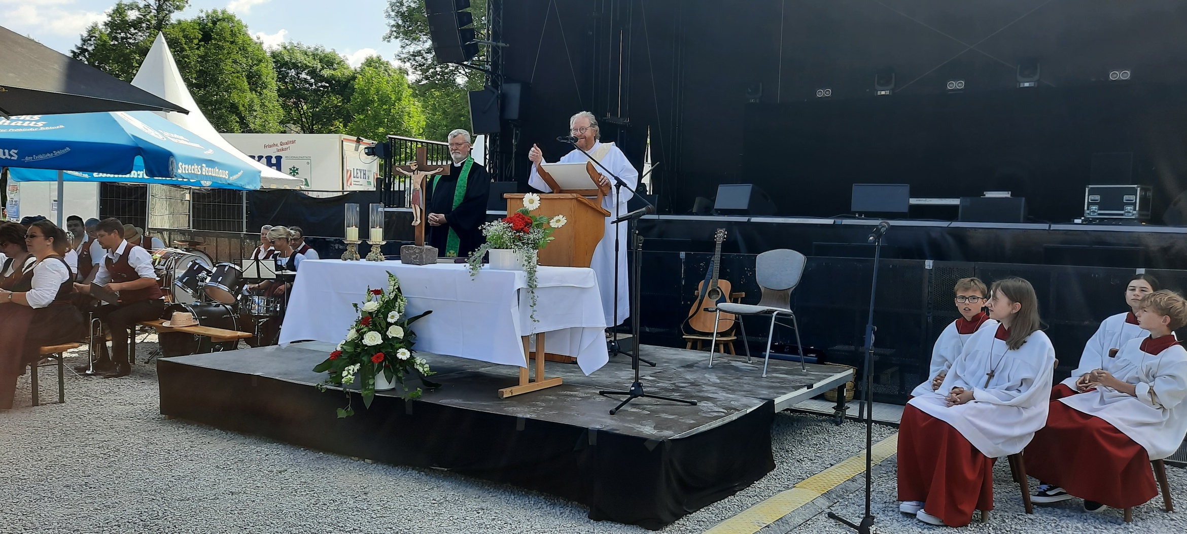 Musikalisch wurde der Gottesdienst auf sehr vielfältige Weise gestaltet. Diakon Zimmermann begleitete das Lied „Du bist da wo Menschen leben“ mit der Gitarre. Ein Friedenslied von Siegfried Fietz sowie der Gospelsong „Baba yetu“ wurden über die große Anlage der Bühne eingespielt. Die Gemeindelieder wurden von der Blaskapelle aus Eußenhausen begleitet.