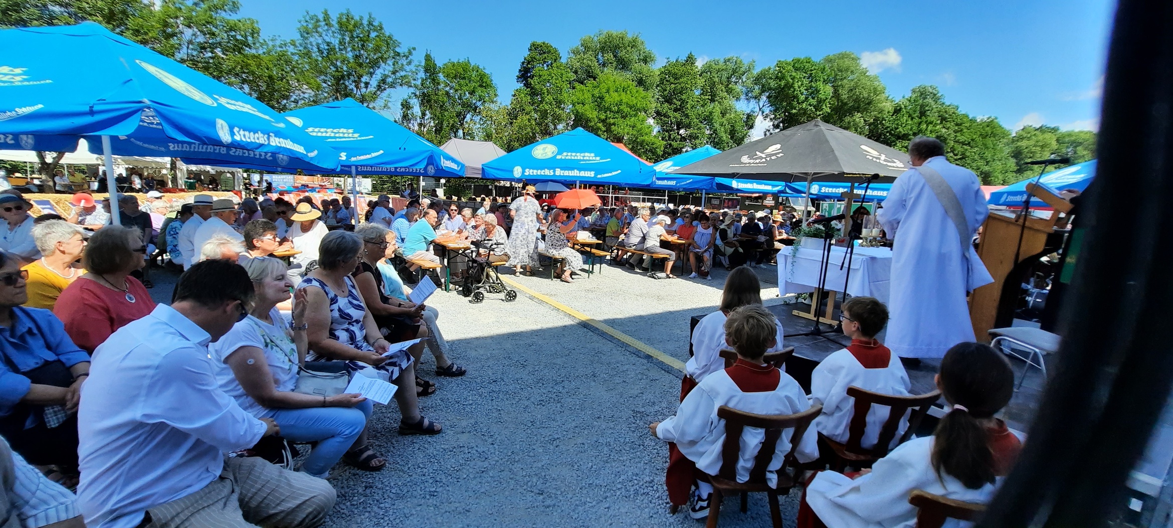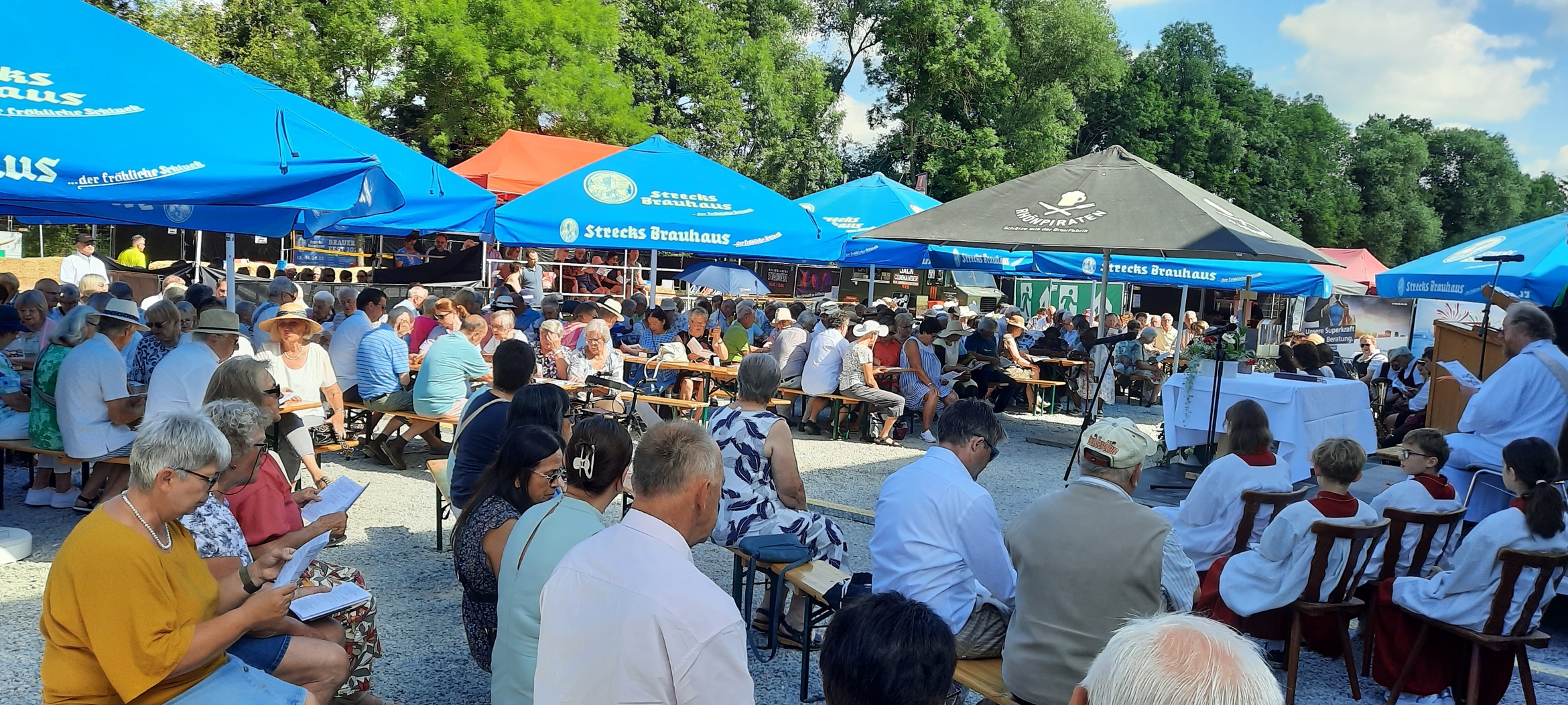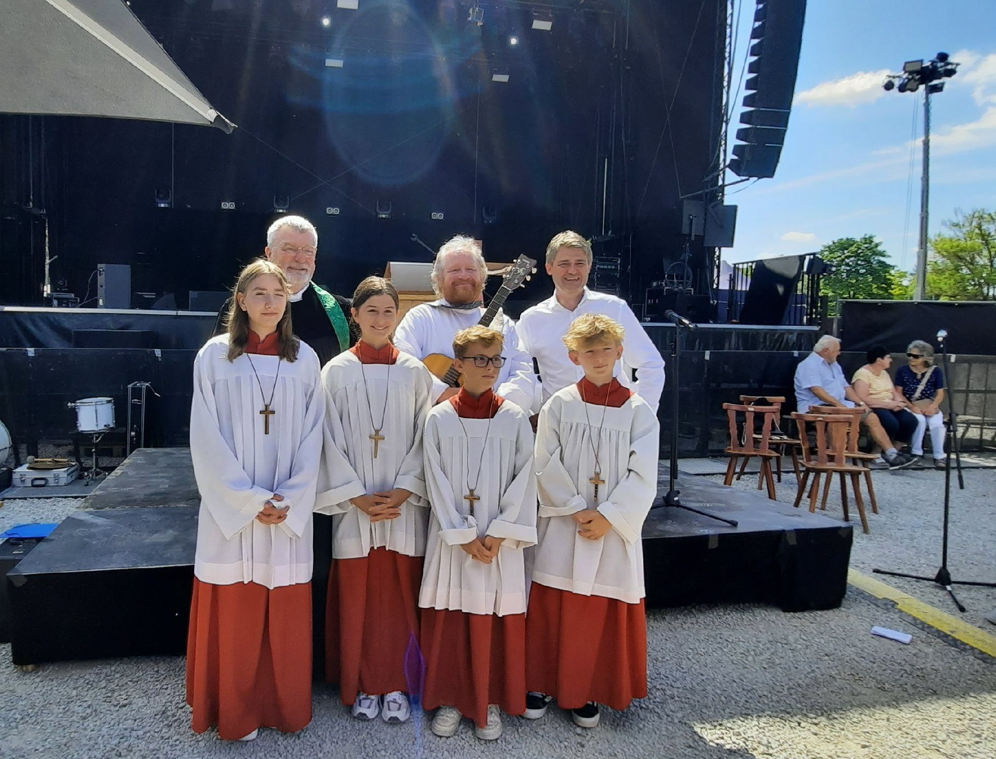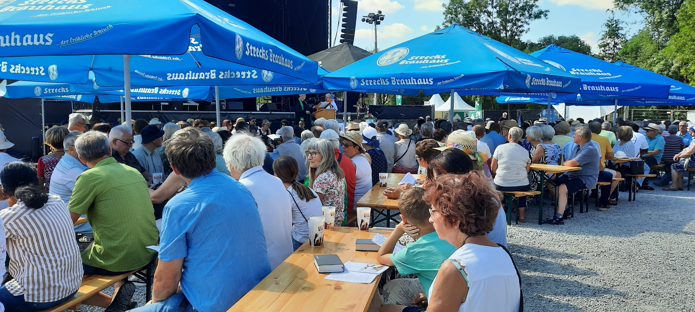 Musikalisch wurde der Gottesdienst auf sehr vielfältige Weise gestaltet. Diakon Zimmermann begleitete das Lied „Du bist da wo Menschen leben“ mit der Gitarre. Ein Friedenslied von Siegfried Fietz sowie der Gospelsong „Baba yetu“ wurden über die große Anlage der Bühne eingespielt. Die Gemeindelieder wurden von der Blaskapelle aus Eußenhausen begleitet.