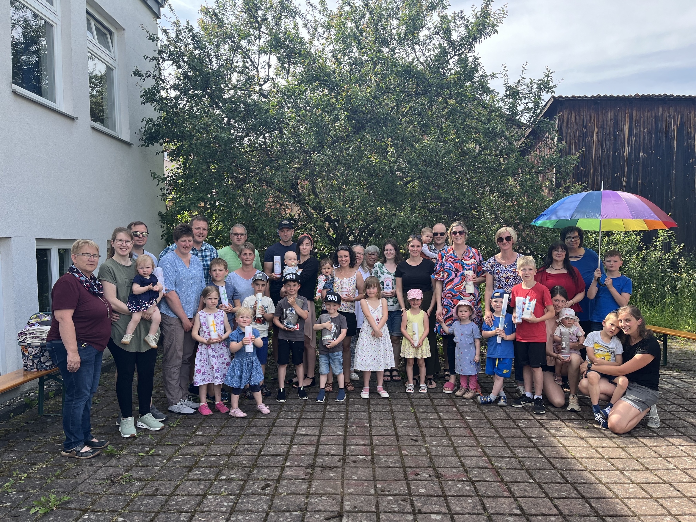 Bei den kindgerechten Liedern füllten die Stimmen der Kinder, aber auch der Erwachsenen, klangvoll den Pfarrgarten. Als Geschenk durfte jedes Kind ein kleines Gläschen mit Weihwasser zusammen mit einem Regenschirm aus Tonpapier entgegennehmen. Zum Abschluss segnete Michaela Köller die Kinder. "Das Kreuzzeichen auf der Stirn soll immer daran erinnern, dass Gott uns alle und besonders die Kinder beschützt." Beim anschließenden Treffen im Pfarrheim gab es eine kleine Stärkung und Kaltgetränke.