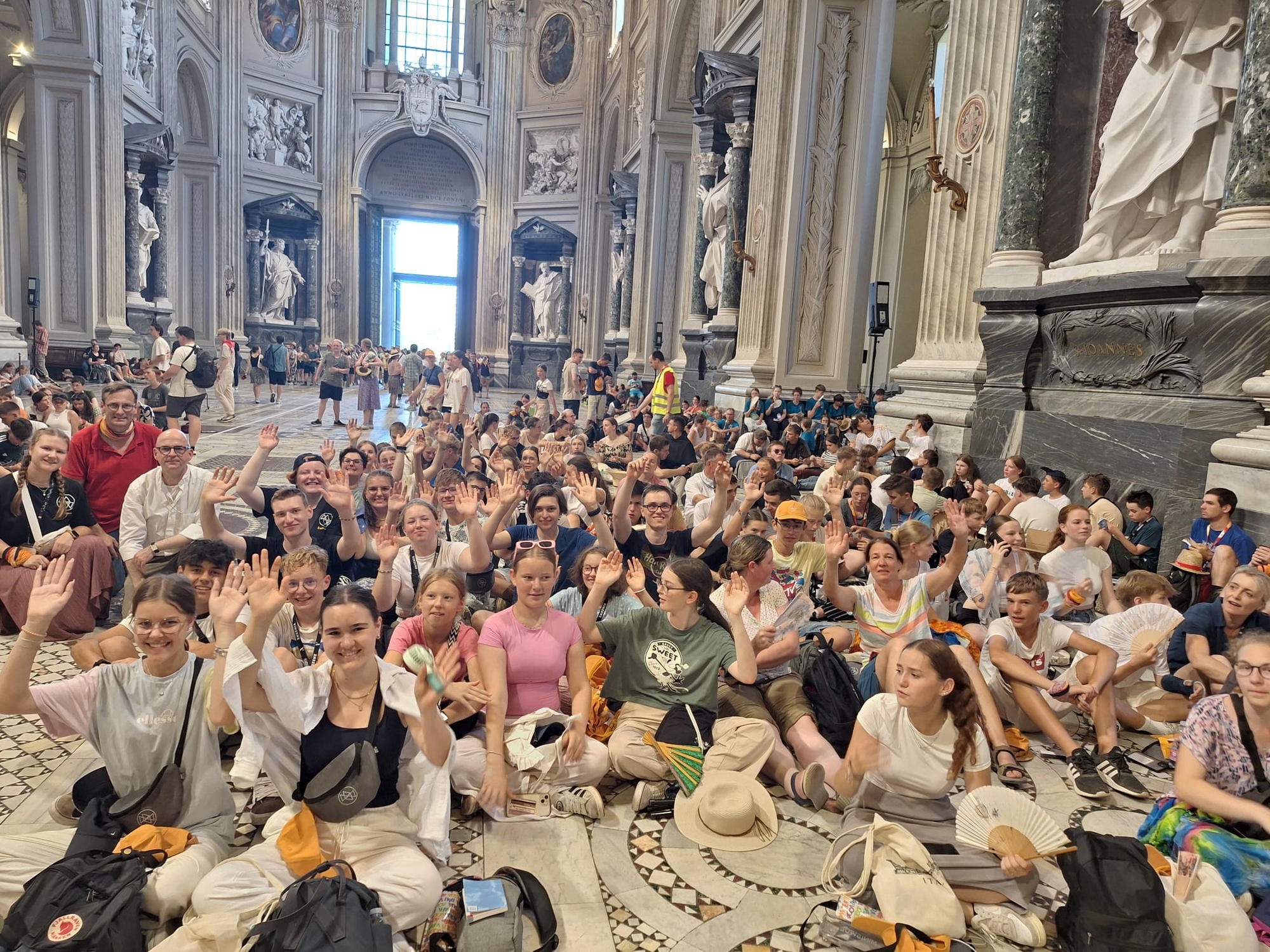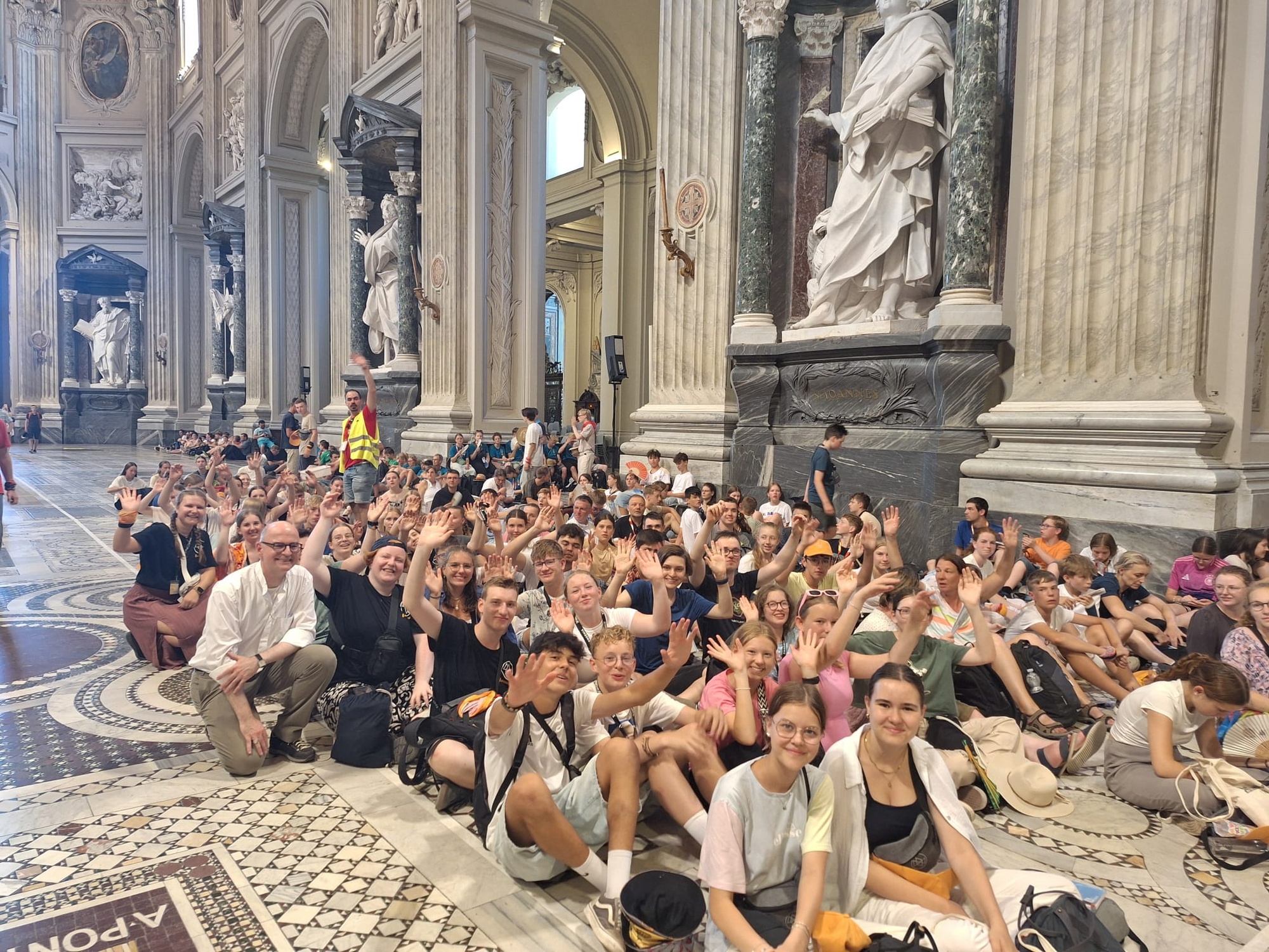Mit 17 Minis aus dem Pastoralen Raum Mellrichstadt und 3 Begleitpersonen ging es am Sonntag, den 28.07.2024 los. Erstes Ziel war der Aussendungsgottesdienst mit allen 1600 Teilnehmern aus dem gesamten Bistum im Würzburger Dom. Danach waren wir ca. 16 Stunden unterwegs nach Rom. Nach einer eher kurzen Nacht im Bus mit wenig Schlaf kamen wir am Morgen in der Ewigen Stadt an.