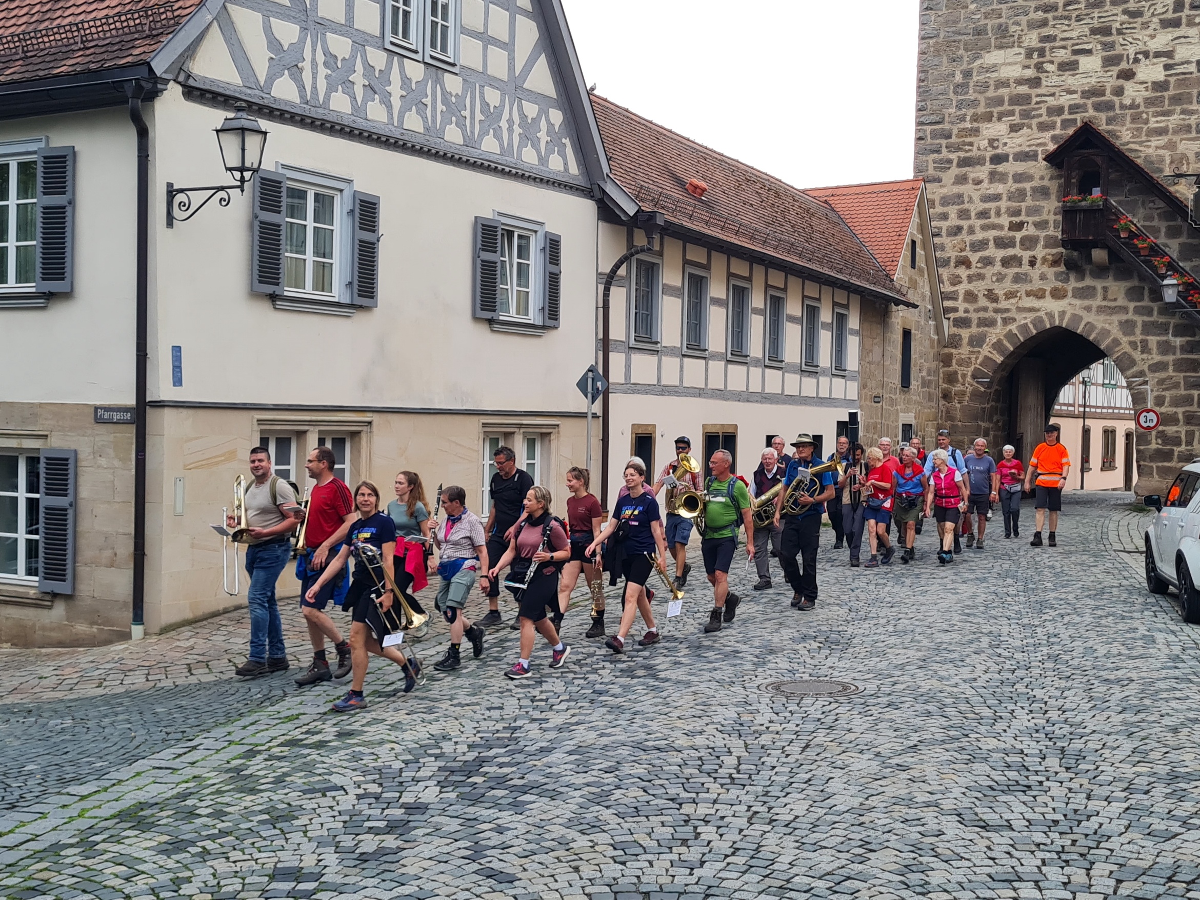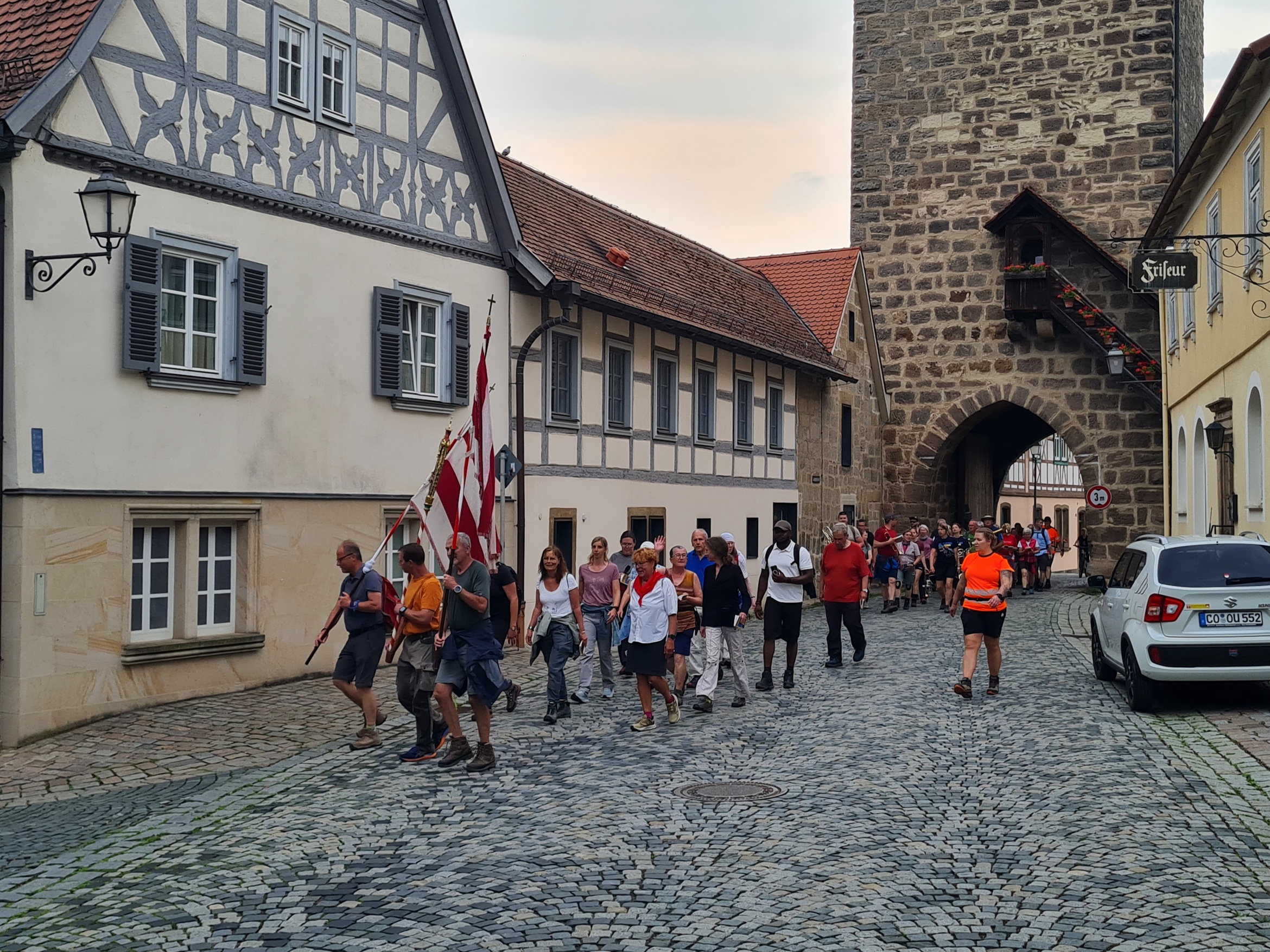 Die Etappe des ersten Tages hat es in sich. Nach der Heiligen Messe in Hendungen am frühen Morgen geht der Weg zunächst nach Ottelmannshausen, wo eine Frühstückspause eingelegt wird. Danach geht es weiter nach Alsleben. Dort wartet das Mittagessen. Über die Ursulakapelle und Hellingen führt der Weg nach Poppenhausen, wo die evangelische Kirchengemeinde jedes Jahr ein reichhaltiges Kuchenbuffet vorbereitet. Dann geht es schurstracks auf das Tagesziel zu, das kleine fränkische Städtlein Seßlach. Gemeinsames Abendessen und wohlverdiente Nachtruhe sorgen dann für die nötige Erholung.