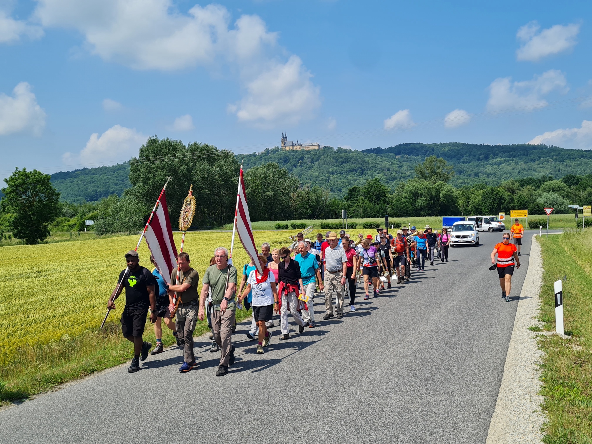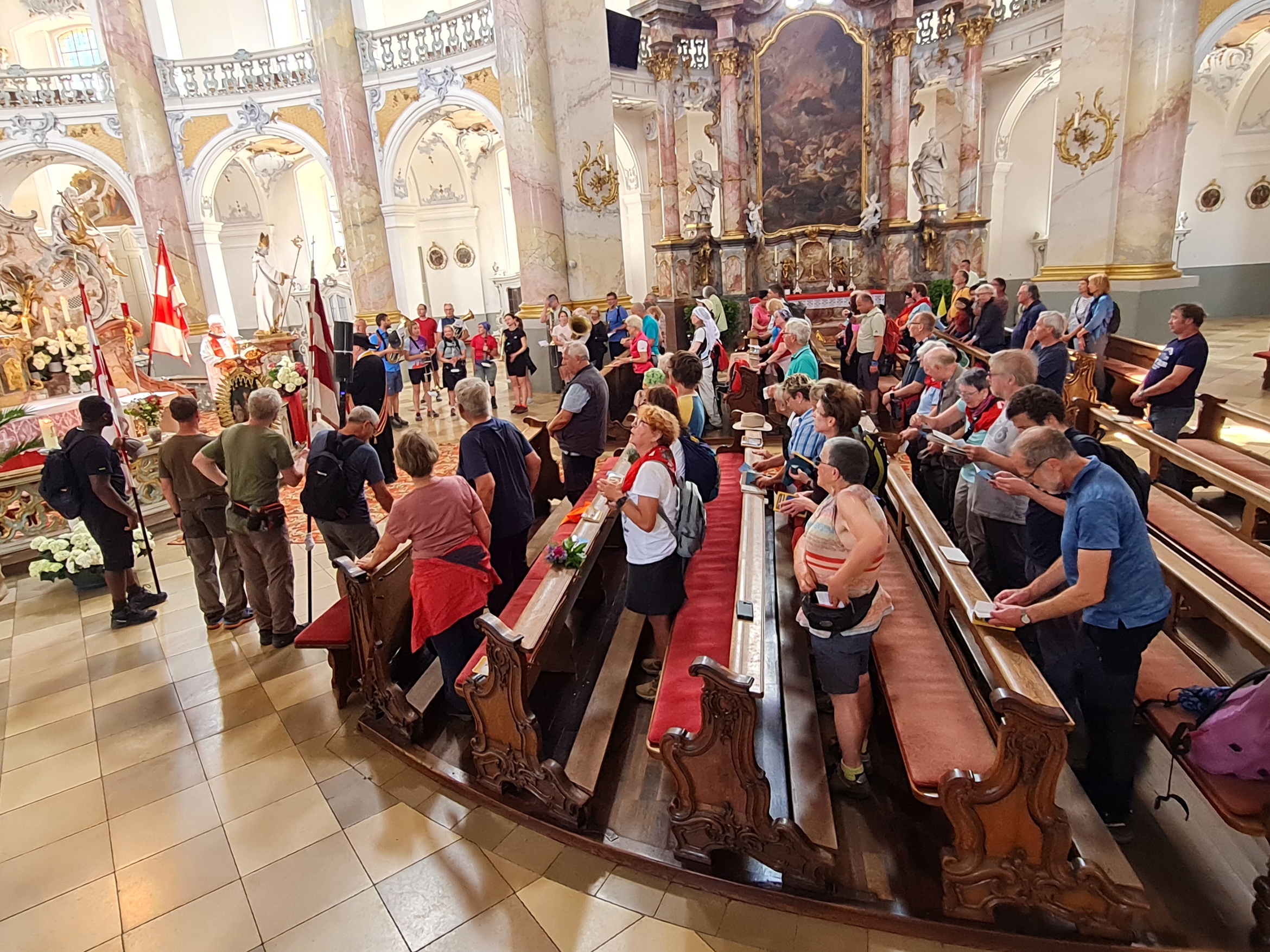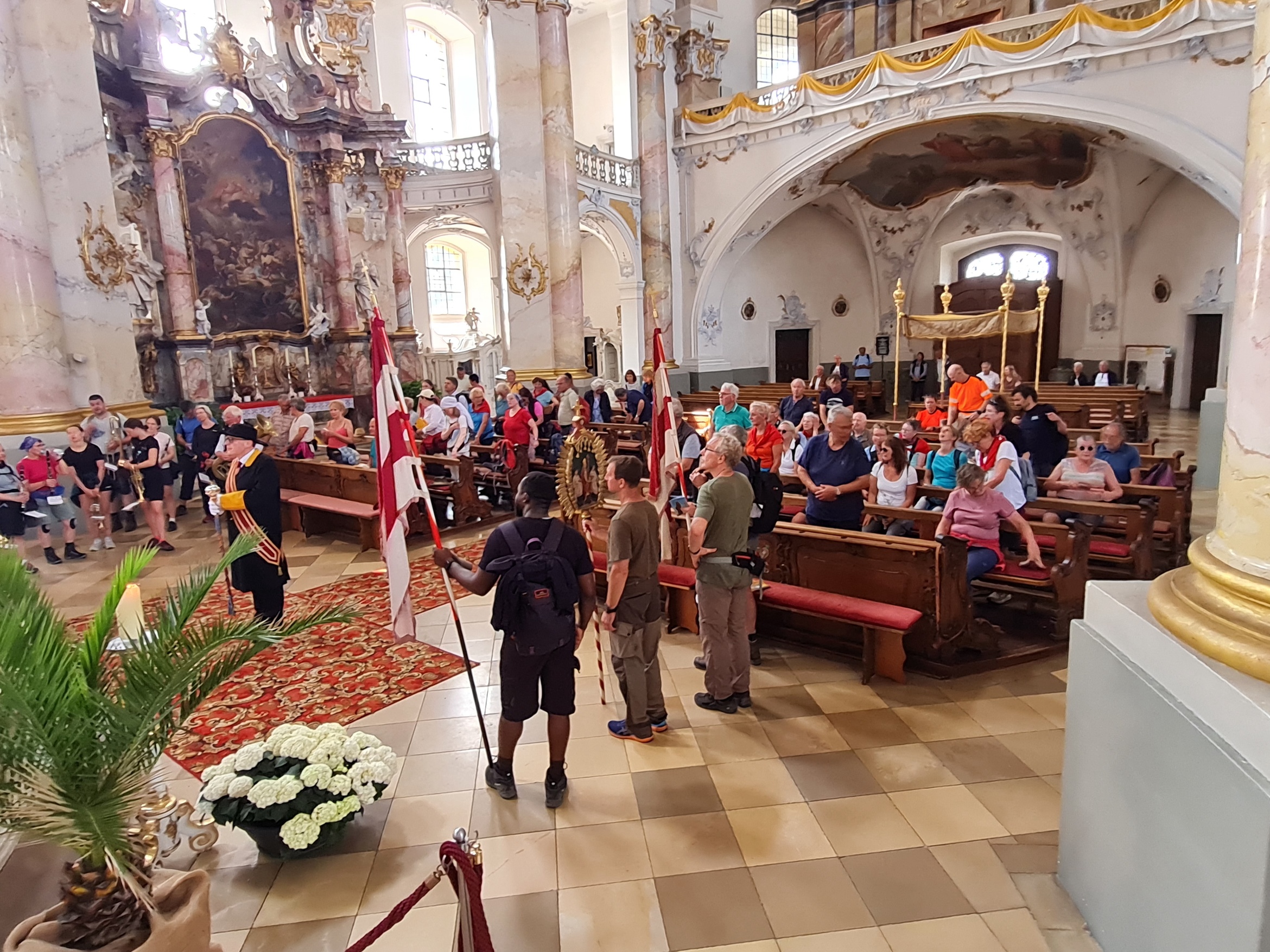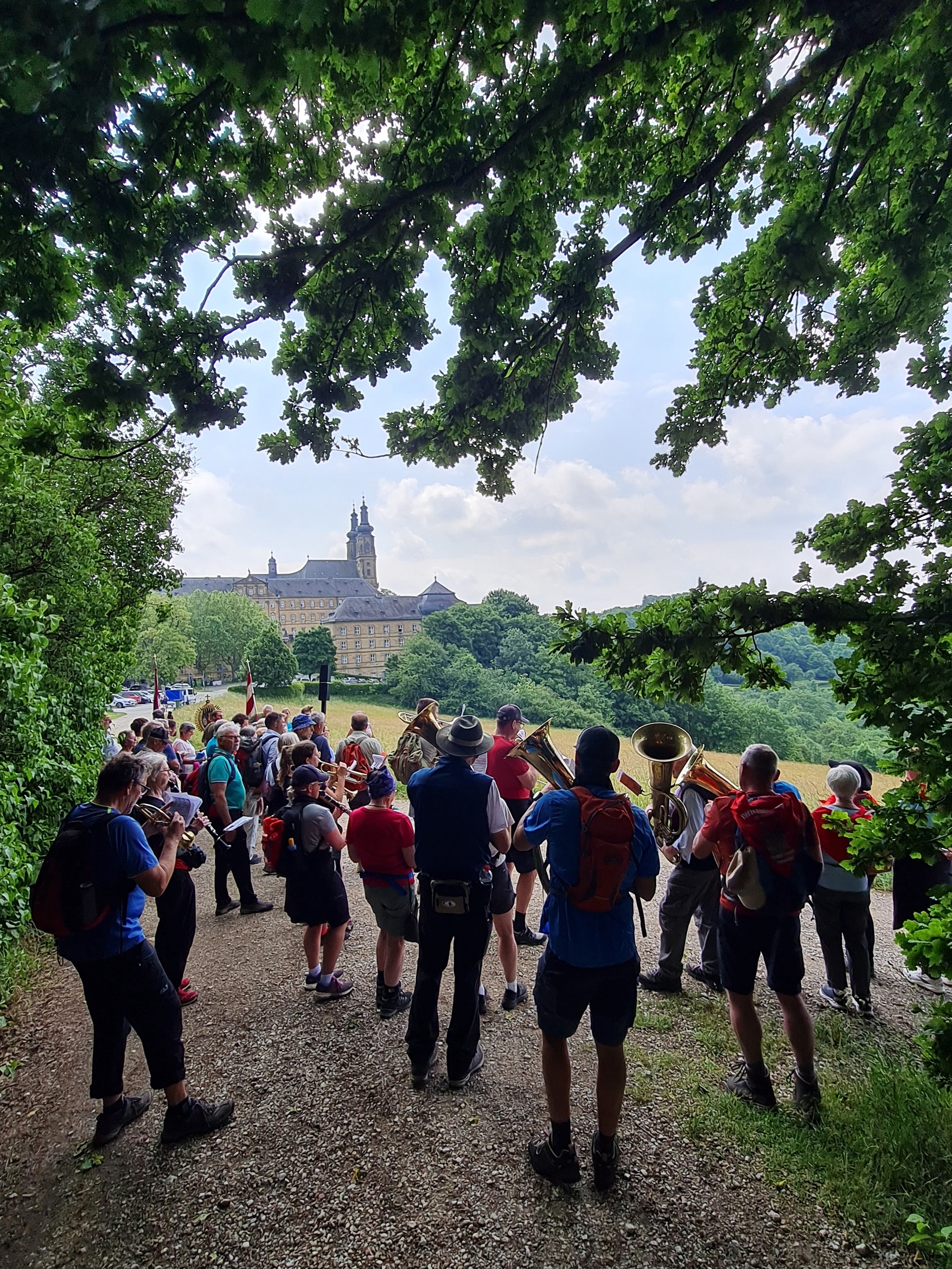 Nach dem Gottesdienst am Morgen in der Stadtpfarrkirche in Seßlach startet die Pilgergruppe in Richtung „Seßlacher Kreuz“, wo der verstorbenen Wallfahrerinnen und Wallfahrer gedacht wird. Über Rossach führt der Weg nach Altenbanz zur Frühstückspause. Es folgt der Aufstieg zum Kloster Banz, wo alljährlich das Frankenlied angestimmt wird. Die Musik verleiht der Gruppe damit den nötigen Schwung für das letzte Wegstück. Erstmalig in diesem Jahr wurde für die Wallfahrtsgruppe die Klosterkirche Banz geöffnet - noch einmal ein kurzer Stop zum Kräftetanken. Gegen 13.15 Uhr dann die Ankunft in Vierzehnheiligen, wo der Kirchenschweizer und ein Franziskaner-Pater die Wallfahrtsgruppe begrüßt und in die Basilika hinein begleitet. Immer wieder ein erhebender Moment, der alle Strapazen und Anstrengungen des Weges vergessen macht.