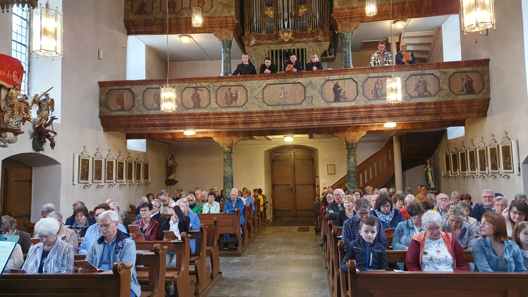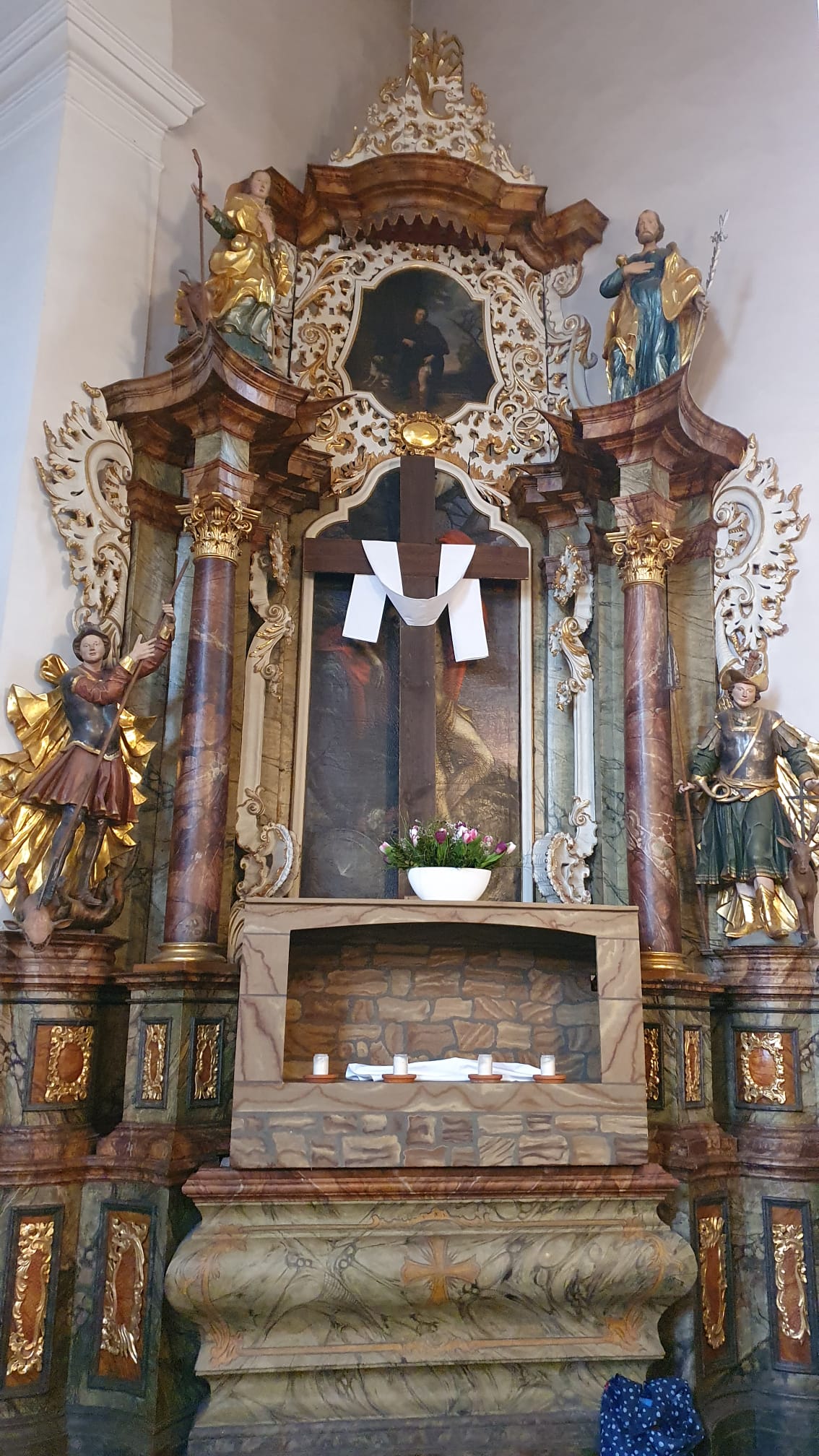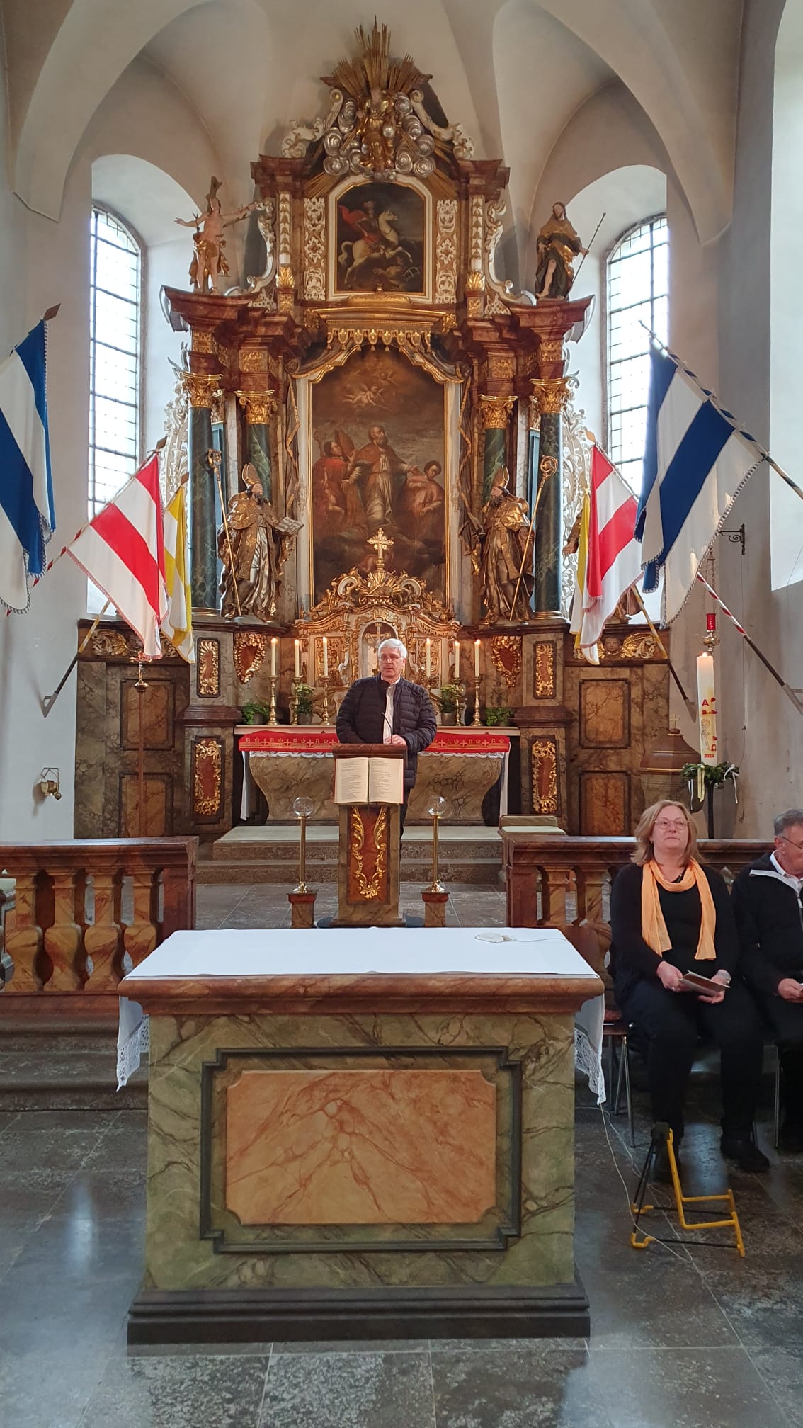 Nach diesen Jahreszahlen machte sich Herr Orf auf den Weg durch die Kirche und erklärte mit lauter Stimme und in lockerer Form einige besondere Kunstobjekte in der Kirche, wie z. B. die Kanzel, den heiligen Nepomuk oder auch den heiligen Sebastian, der insgesamt viermal in der Kirche dargestellt ist. Ein Rätsel sind zwei weibliche Figuren hoch oben auf dem linken Seitenaltar, deren Identität bis heute nicht geklärt ist.