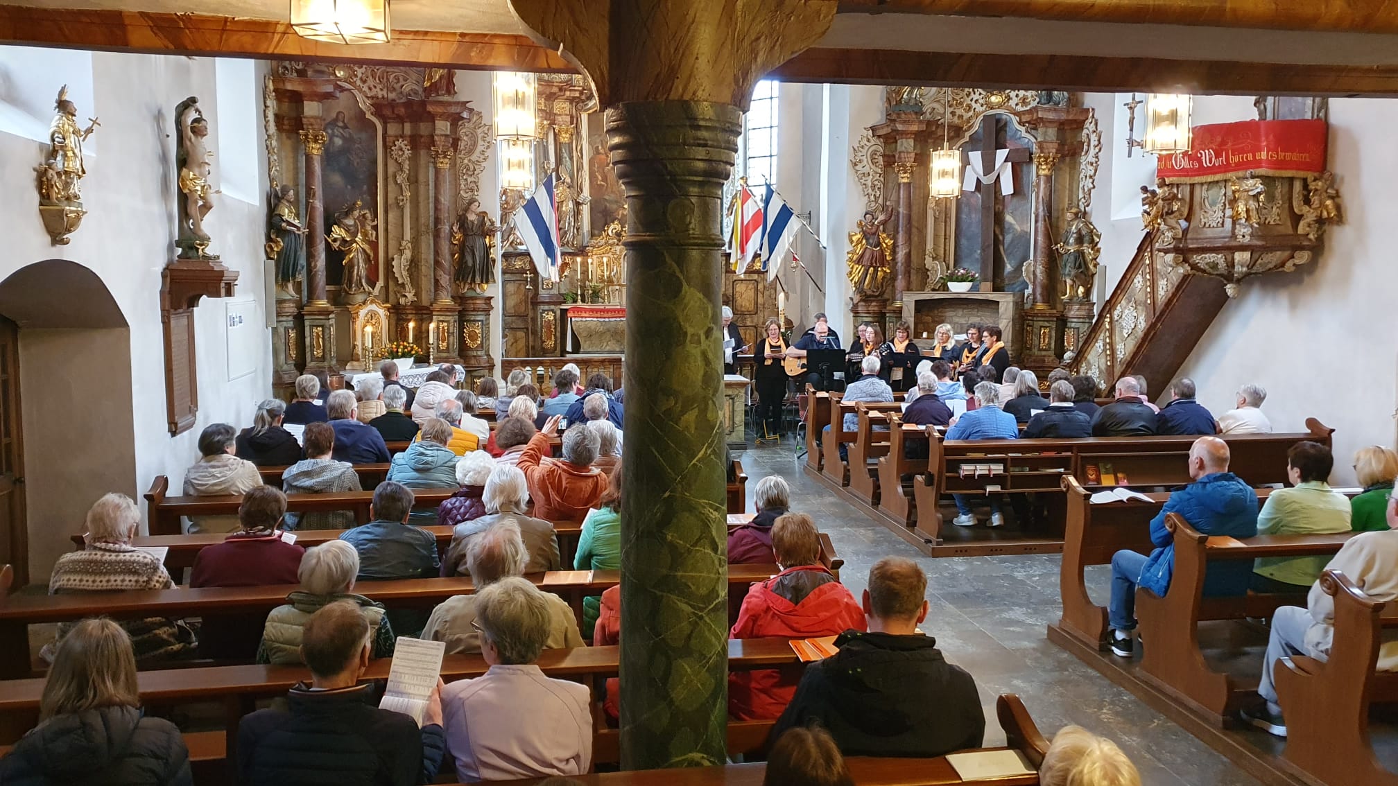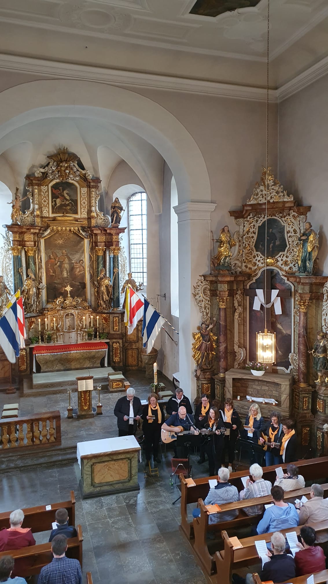 Durch den kurzweiligen Abend führte Herr Wolfgang Orf, der in der Pfarrei Hausen seit Kindesbeinen an engagiert ist. Er begrüßte alle Gäste in der „kleinen, aber feinen Rokokokirche“ ganz herzlich und lud zum Mitsingen eines ersten Liedes ein: Komm herein, ruh dich aus. Das Lied begleitete die Singgruppe der Kolpingsfamilie von Hausen.