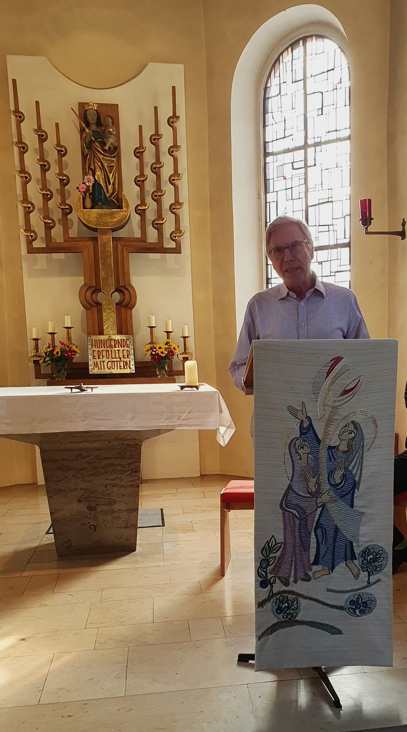 Hernach stellte die Gräfin das Gemälde „Maria unter dem Kreuz“ vor: Dort hat Jesus sie zur Mutter der Kirche gemacht, indem er ihr den Jünger Johannes anvertraut hat. Dazu passend betete man nun einen kurzen Abschnitt aus einer Marien-Andacht. Sodann betrachtete Gräfin von Soden noch kurz das Gemälde „Mariä Aufnahme in den Himmel“, worauf das Lied „Maria aufgenommen ist“ folgte. Schließlich wurde Maria, die als Himmelskönigin mit dem Jesuskind auf dem Arm und dem Zepter in der Hand über dem Tabernakel thront - der Königin des Friedens - ein Gruß gesungen: „Gegrüßet seist du, Königin“.