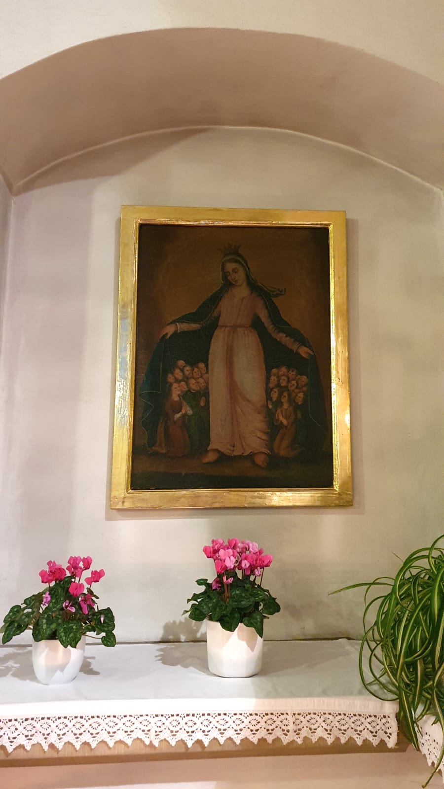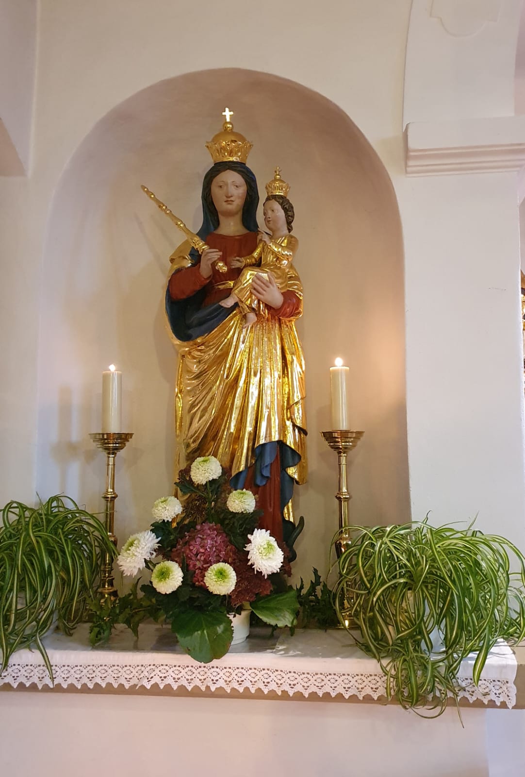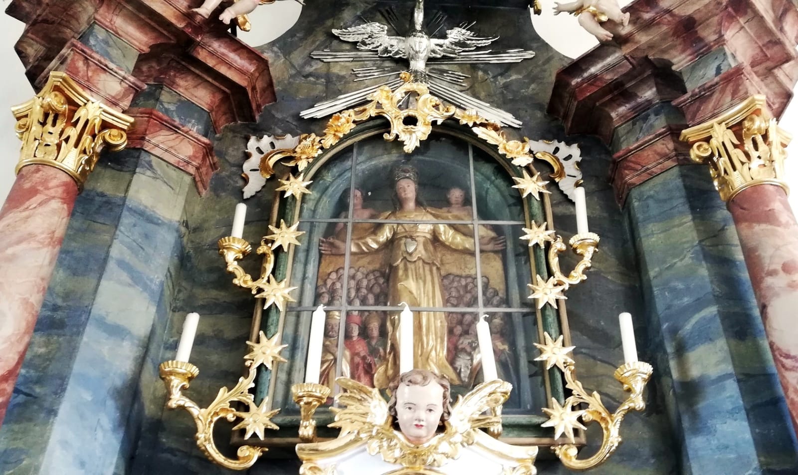 Sichtlich stolz ging Reinhilde Pfister auf das Gnadenbild, den Schatz, das „Besondere“ in der Braidbacher Kirche ein, als sie die Figur der Schutzmantelmadonna ausführlich beschrieb, ein um 1600 in Tirol geschnitztes, vergoldetes Holzrelief im Glasschrank, angebracht über dem Tabernakel, anstelle eines Altarbildes. Im 17. Jahrhundert nahm die Wallfahrt zur Gnadenmutter im Besengau ihren Anfang. Seitdem Pfarrer Josef Treutlein den Fränkischen Marienweg ins Leben gerufen hat, leben die Wallfahrten wieder auf – zu Fuß, mit dem Fahrrad oder auch mit dem Bus kommen die Pilger in die Wallfahrtskirche. Wallfahrtsstimmung kam nun auch auf, als Reinhilde Trabert, Martha Seufert und Maria Mühlfeld zu Ehren der Gottesmutter zweistimmig die Grüßauer Marienrufe anstimmten.