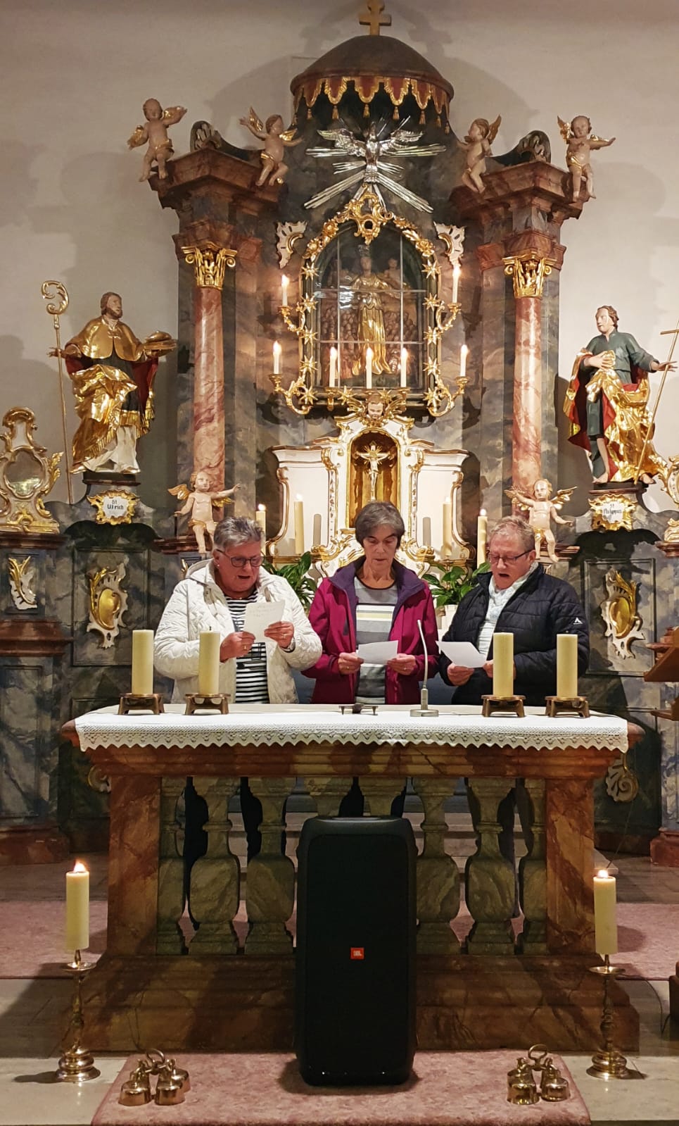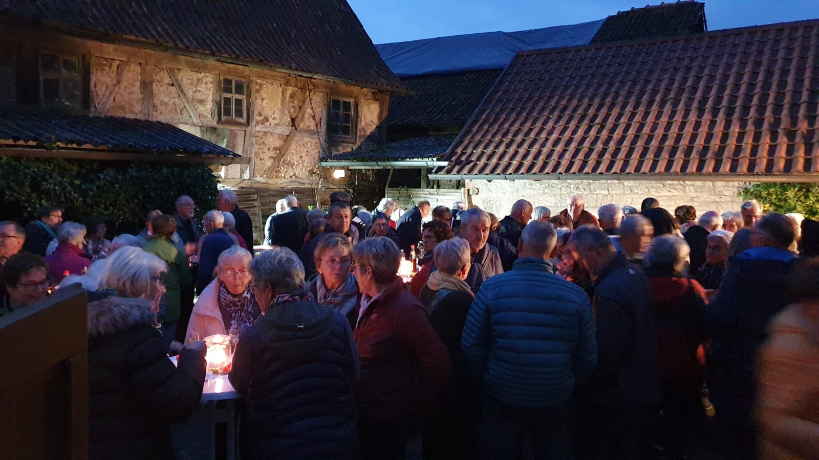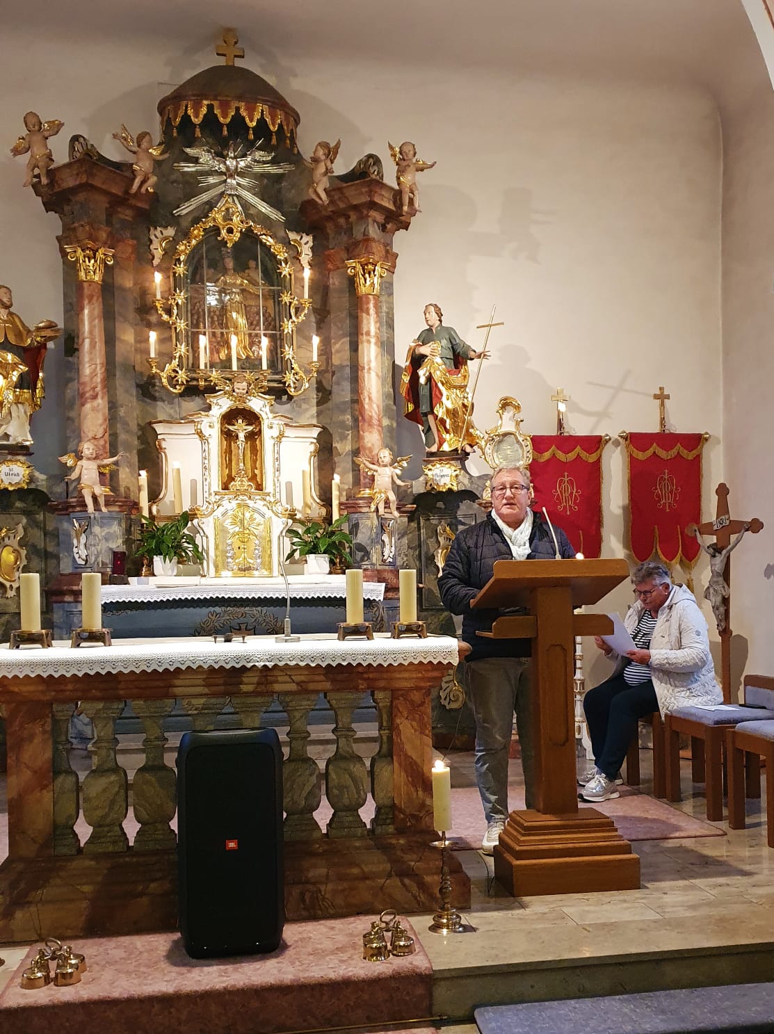 Einladend wirkte der mit Lichtchen bestückte Treppenaufgang zur Kirche St. Ulrich; an der Kirchenmauer entlang rankte rotes Weinlaub und unterstrich malerisch die herbstliche Abendstimmung. Im Nu füllte sich die kleine, schmucke Kirche – noch war Zeit für einen kleinen Plausch der Wiedersehensfreude.