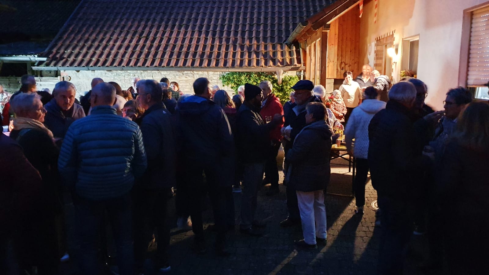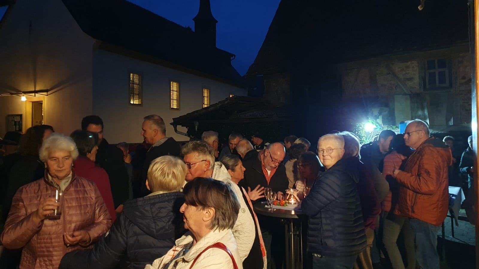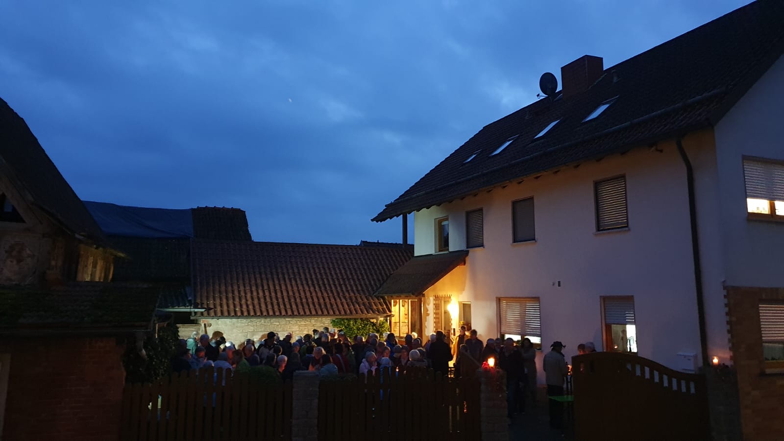 Nun war man tatsächlich am Ende der Vorstellung angelangt. Gemeinsam wurde noch einmal voller Inbrunst „Rosenkranzkönigin“ gesungen. Danach bedankte sich Reinhilde Pfister herzlich bei den Gästen und lud ein zur Begegnung im Hof des ehemaligen Gasthauses „Zur fröhlichen Einkehr“ gegenüber, was an dem milden Abend auch wieder regen Zuspruch fand.