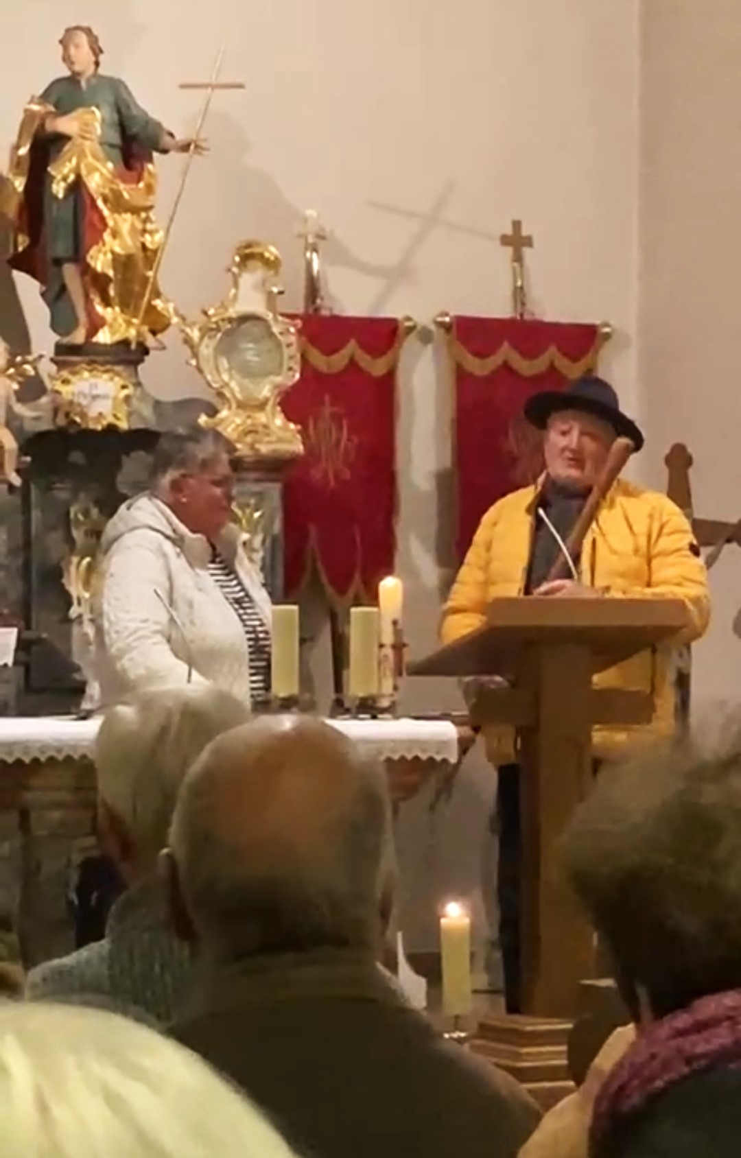 Gerade, als sie zum Abschluss einleiten wollte, betrat Roland Pfister, ausgestattet mit Hut und Spieß in der Hand, den Chorraum und unterbrach seine Frau: „Halt! Du hast den Spieß vergesse‘!“