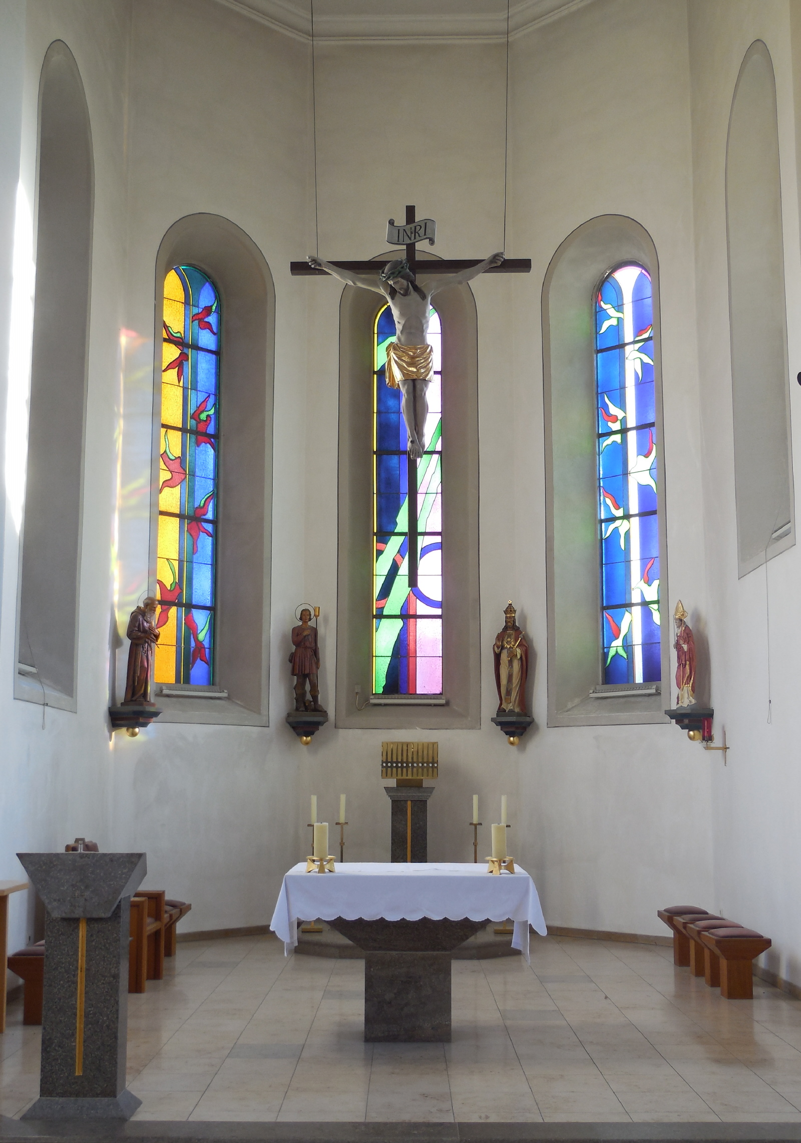 Und schließlich gehört zu diesen Fenstern noch etwas ganz wesentliches dazu: das Kreuz. Kreuz und Fenster bilden eine Einheit, stehen in einem Bezug zueinander. Auf die Gnade Gottes, die in diesen Fenstern auf so ganz vielfältige Weise dargestellt wird, können wir tatsächlich vertrauen, weil Jesus sich dafür verbürgt hat und aus Liebe zur Welt und zu uns Menschen sein Leben am Kreuz hingegeben hat.