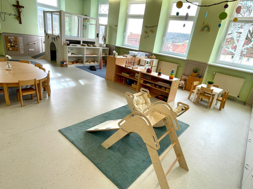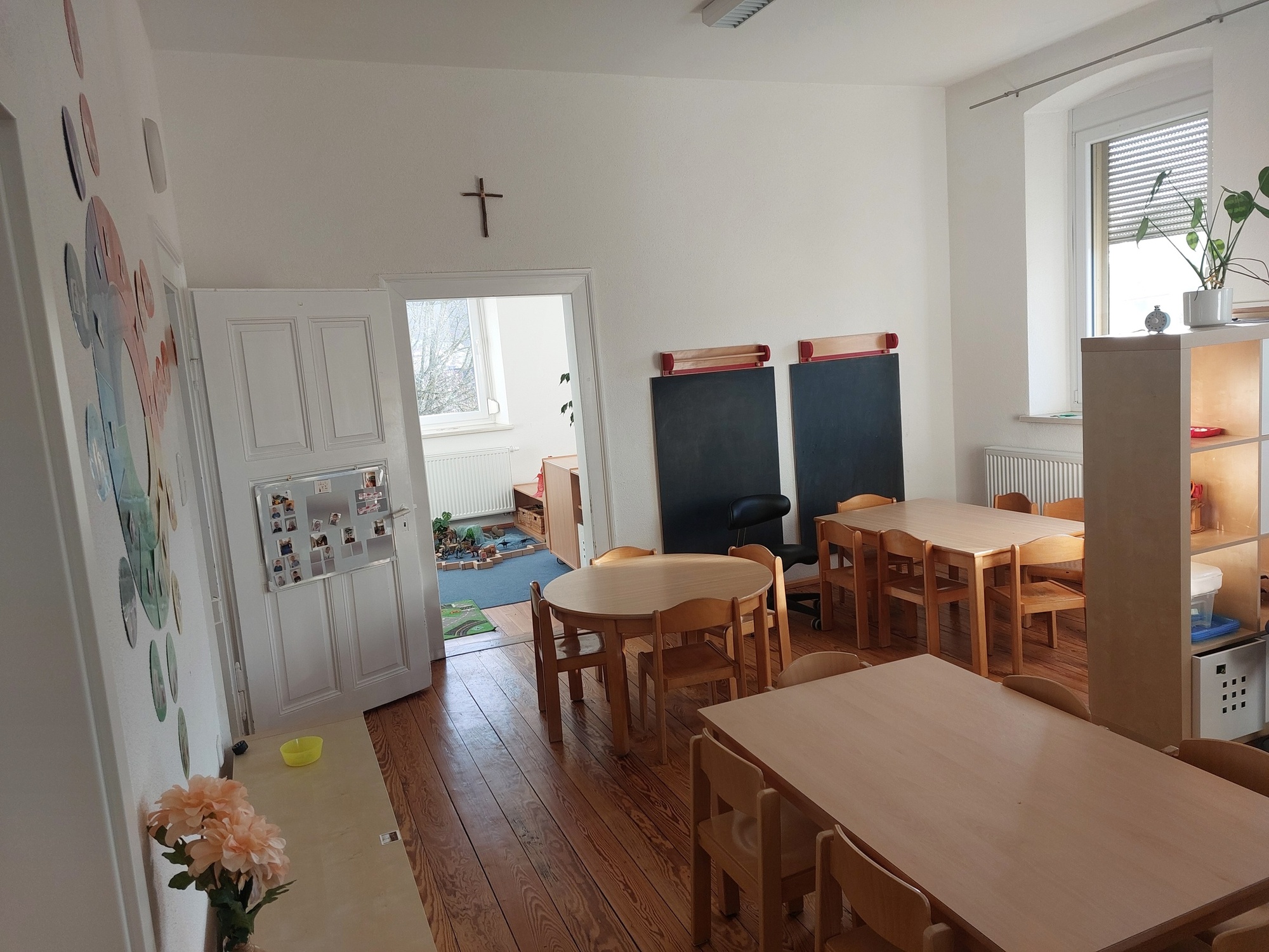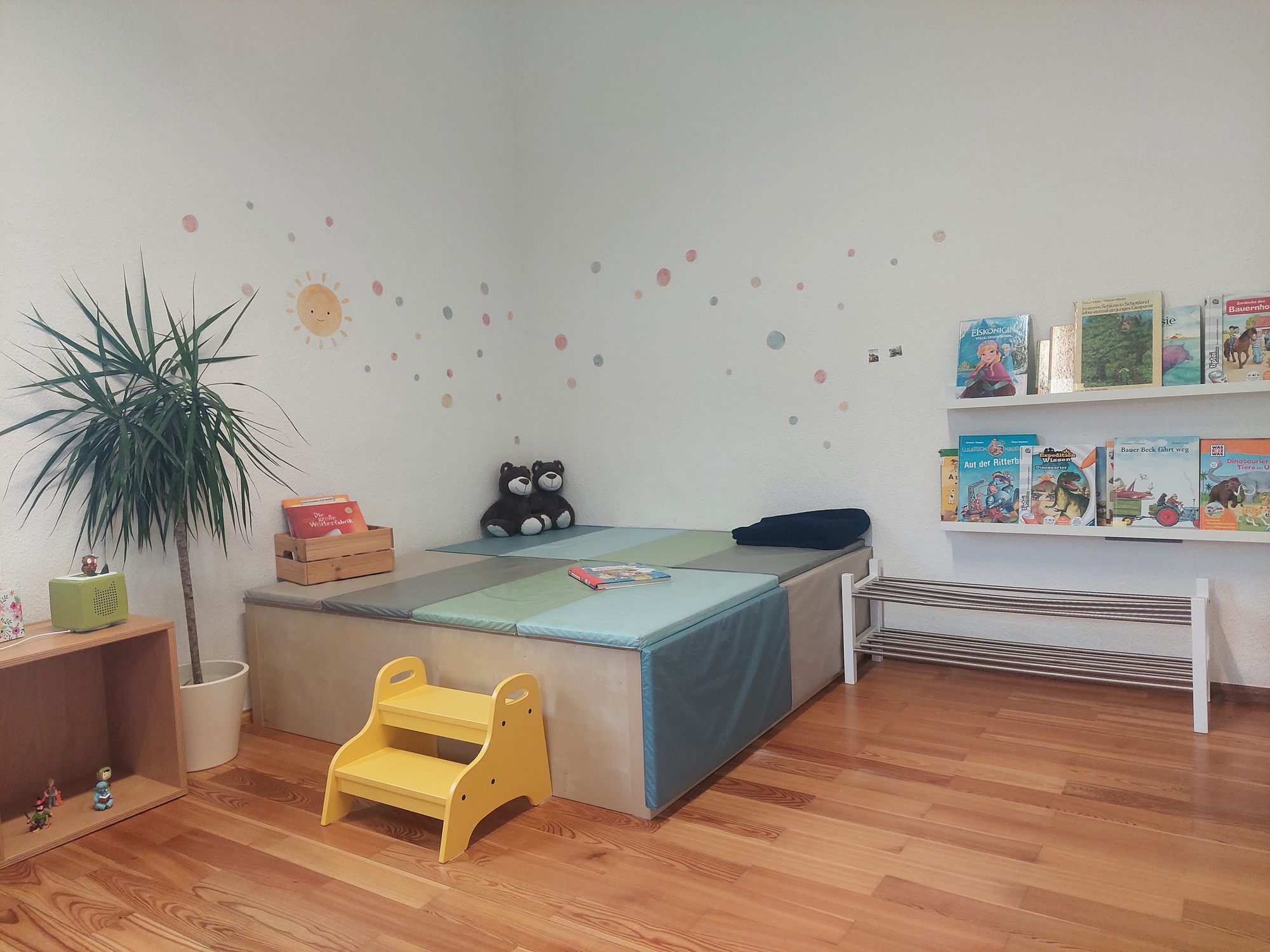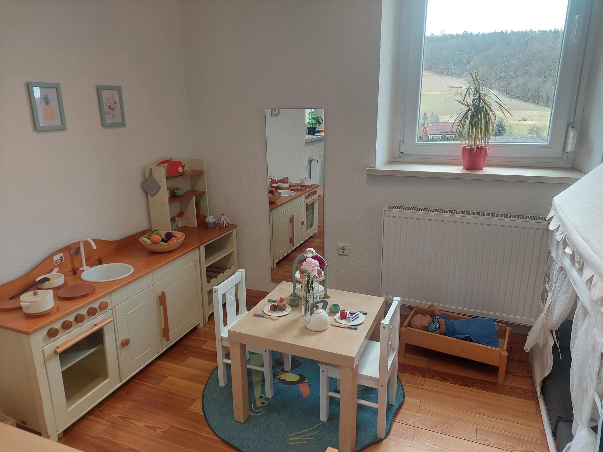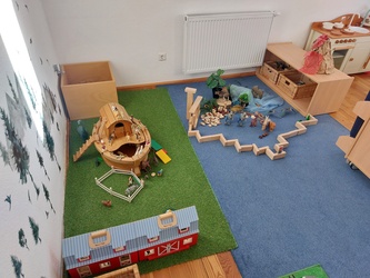 Die Räumlichkeiten unseres Kindergartens erstrecken sich über zwei Etagen. Dieses großzügige Platzangebot erlaubt es uns, unsere Kindergartengruppe in kleinere Gruppen aufzuteilen, um allen Kindern ihres Alters und ihrer Entwicklung entsprechend ein vielfältiges und individuelles Material- und Spielangebot zu ermöglichen.