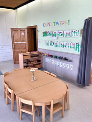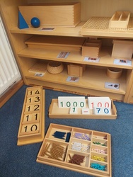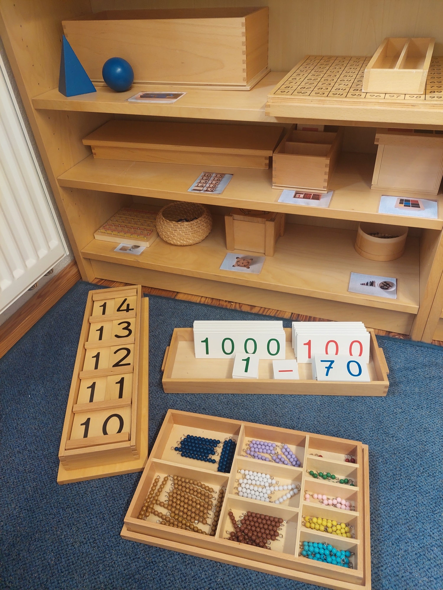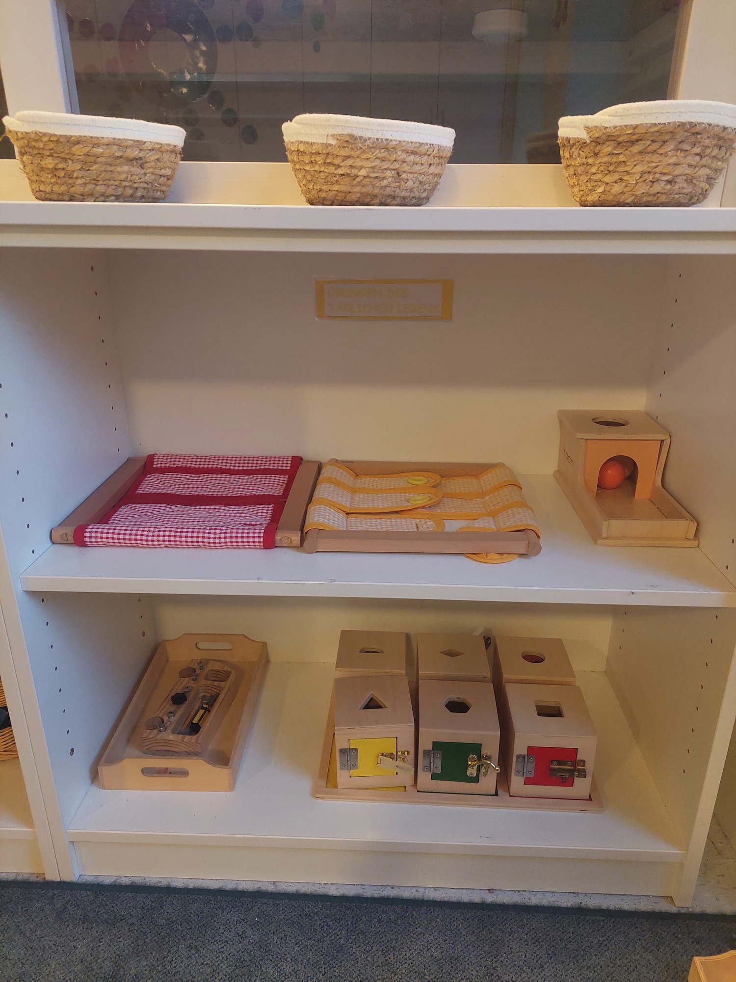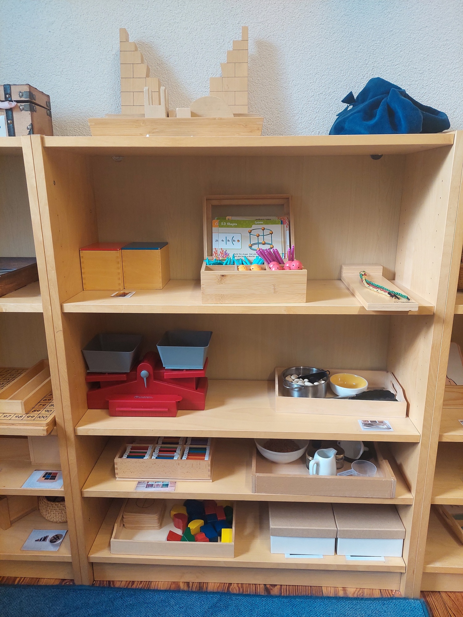 Das Materialangebot umfasst Montessori-Materialien aus dem Sinnesbereich, dem täglichen Leben, bis hin zu ersten Sprach- und Mathematikmaterialien.