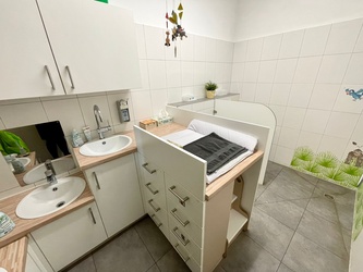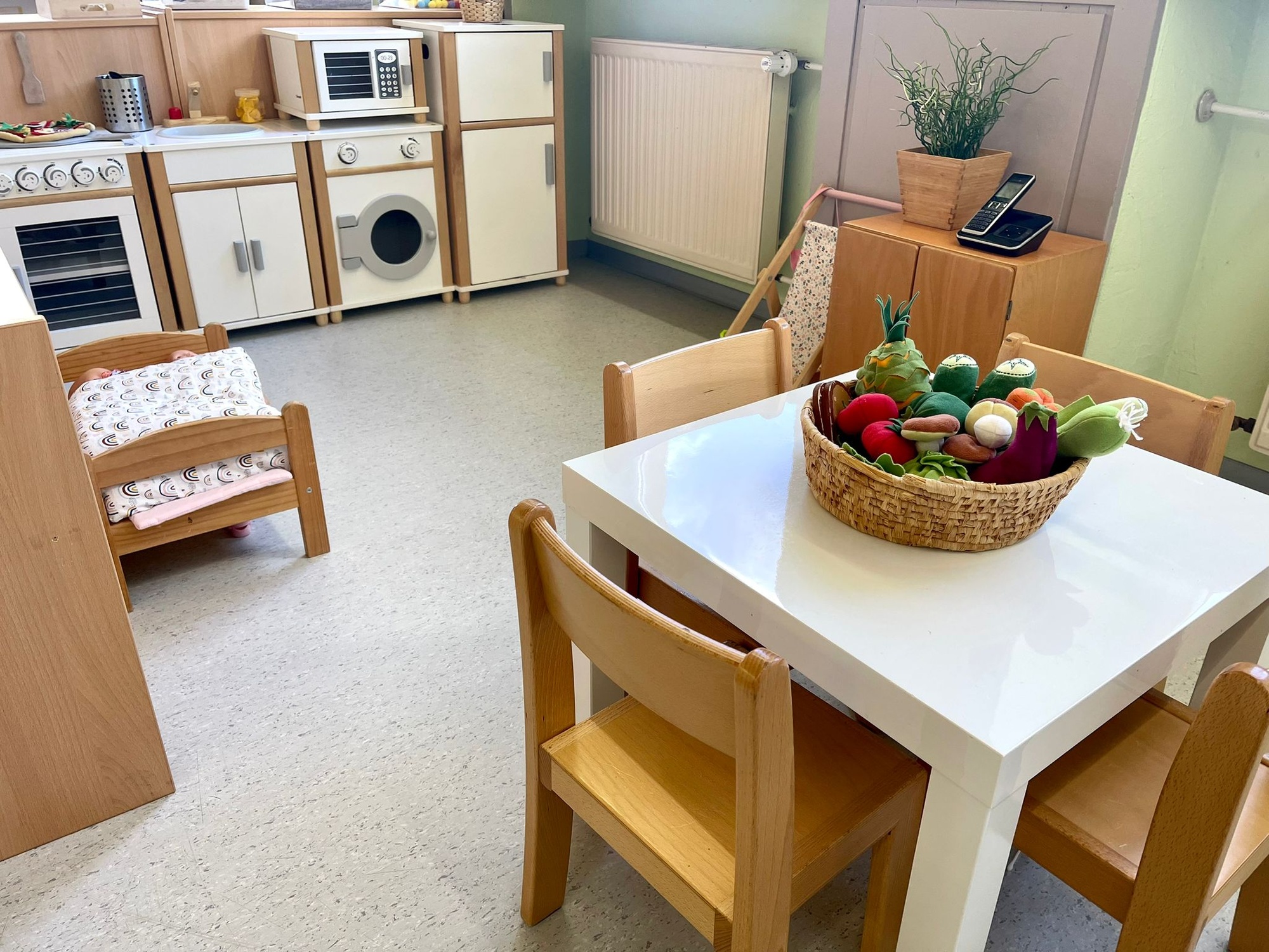 In den Räumlichkeiten im Erdgeschoss befindet sich ein großer Gruppenraum mit Rollenspielbereich, Kreativbereich, einer Kuschelecke, einer Bücherecke und einem Bauzimmer. Über die Mittagszeit wandelt sich das Bauzimmer in einen Schlaf- und Ruhebereich für unsere jüngeren Gruppenmitglieder. Die Küche bietet den Gruppenmitgliedern einen speziellen Kinderarbeitsbereich zum Backen des eigenen Geburtstagskuchens oder zum Mithelfen beim Vorbereiten unseres Frühstücksbuffets.